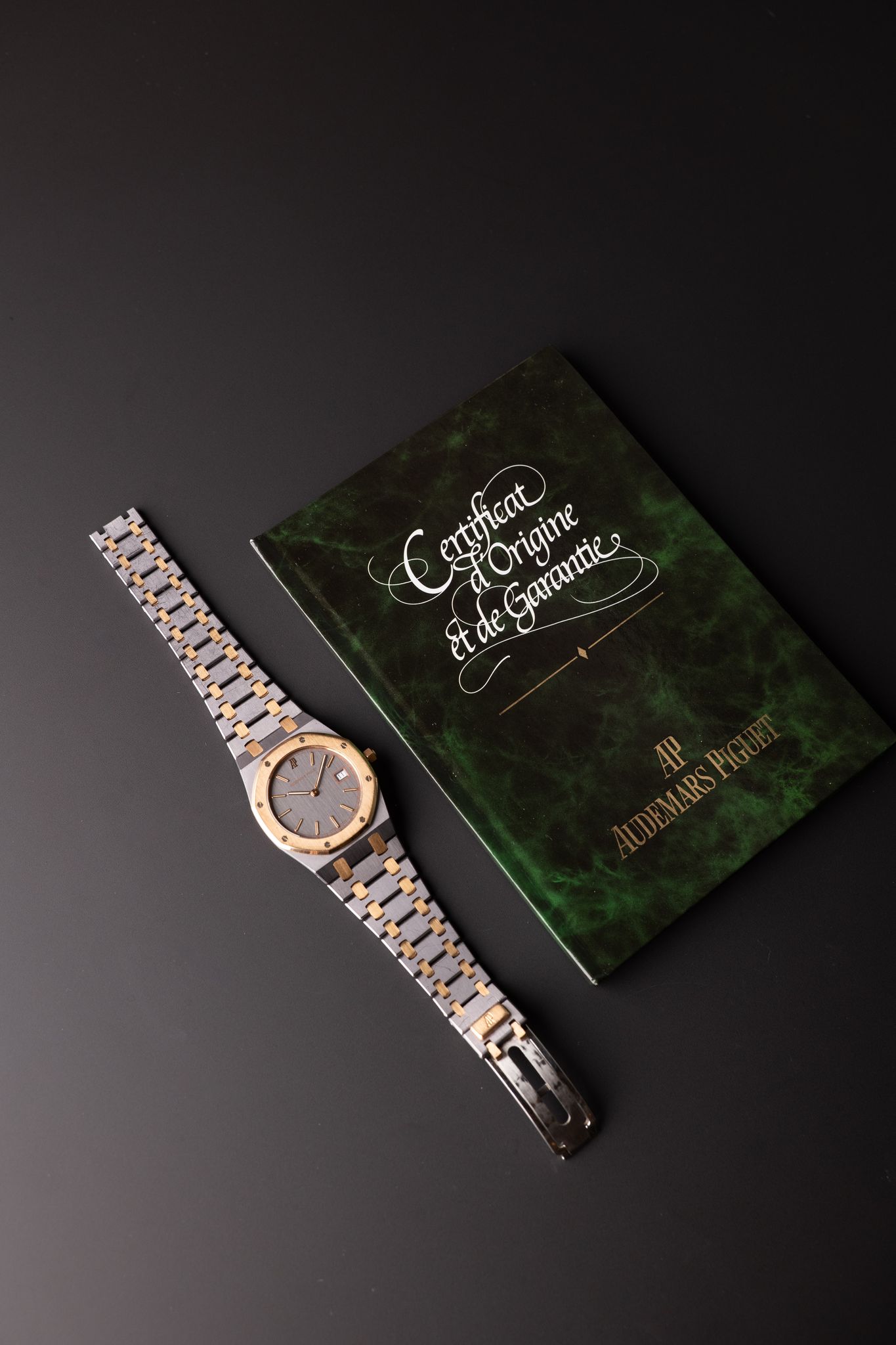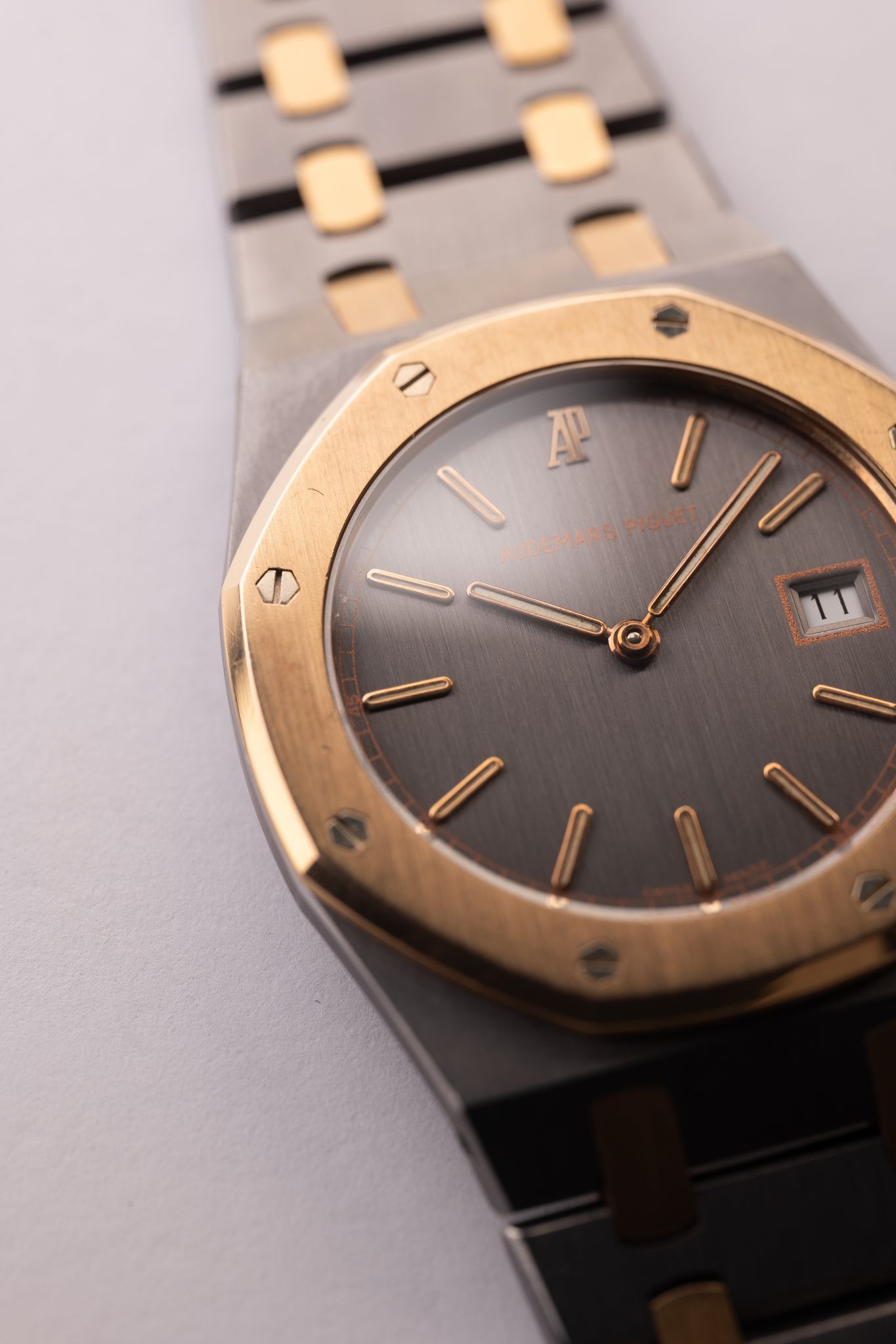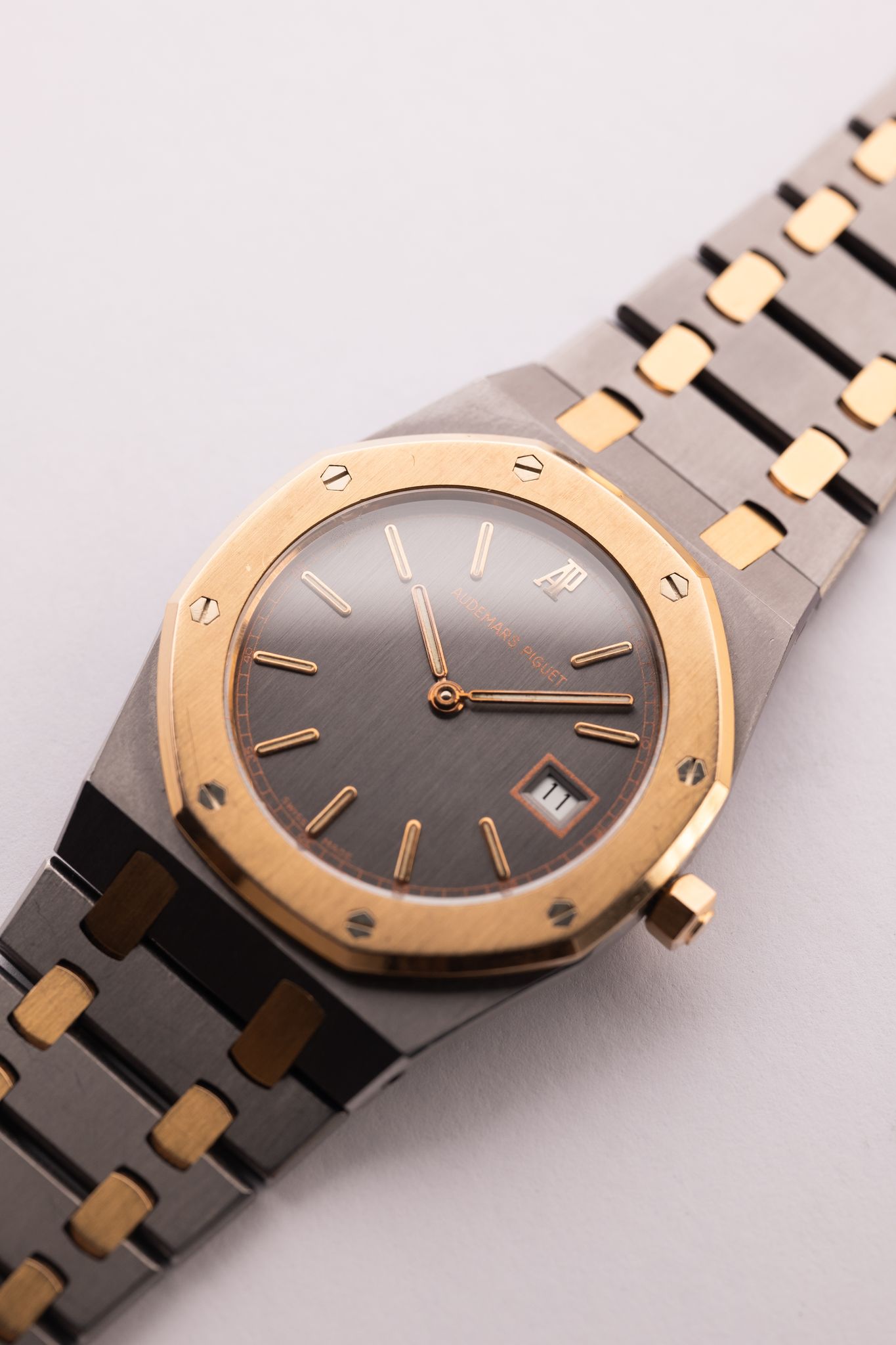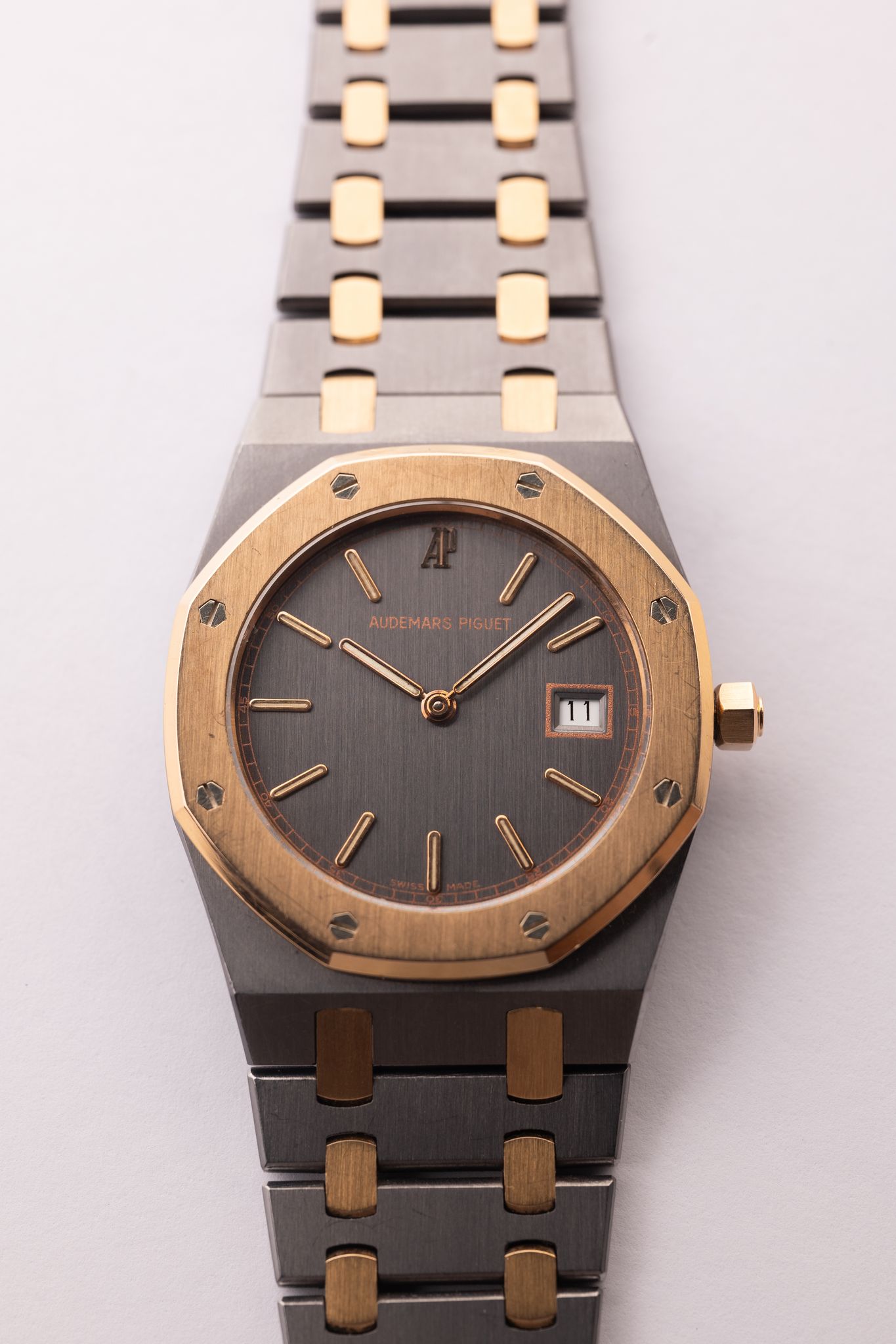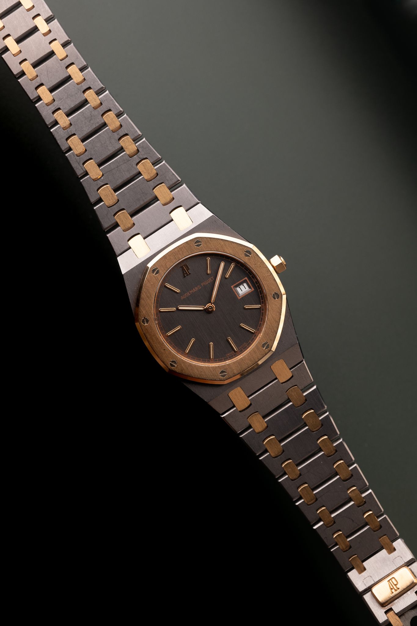The Quartz era of Audemars Royal Oak lineup has made a resurgence in recent years. Much like the oyster quartz that Rolex came out with during the time, Audemars was left responding to Japanese watchmakers that introduced the quartz movement in the 80’s and 90’s. These movements housed in the Royal Oak lineup are a blast to the past and thats what makes them so unique as they will likely never be introduced again. The 33mm size wears more like a 34 or 35mm watch. The case on this is a unique Tantalum and Rose gold material which gives the watch incredible heft despite its smaller size. The case and bracelet are in excellent shape as well.
