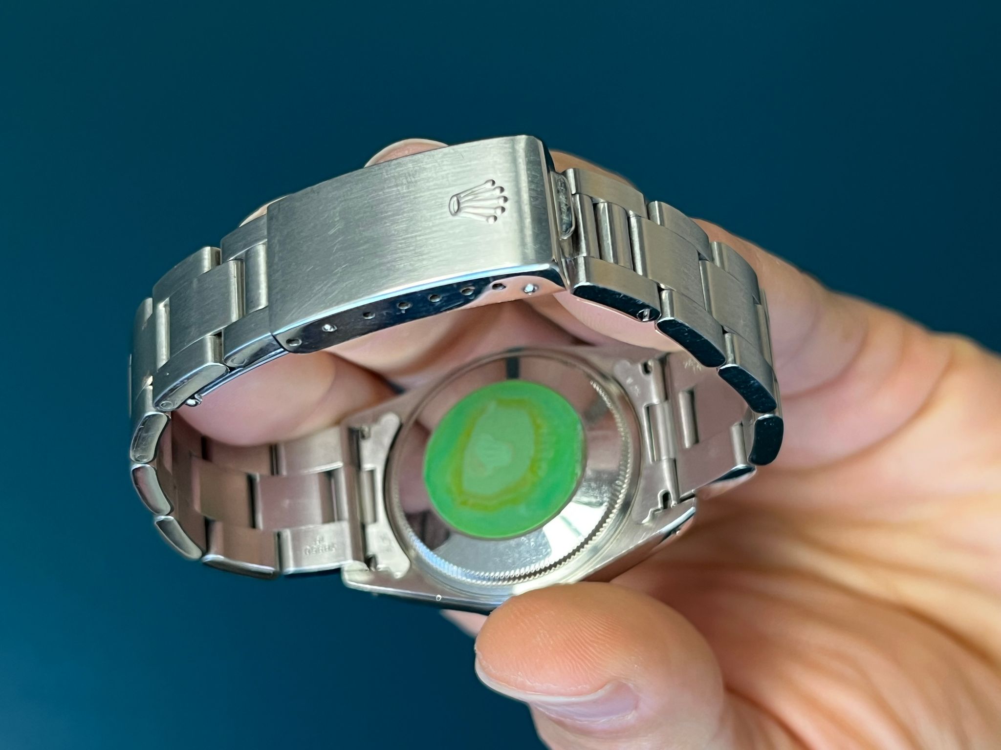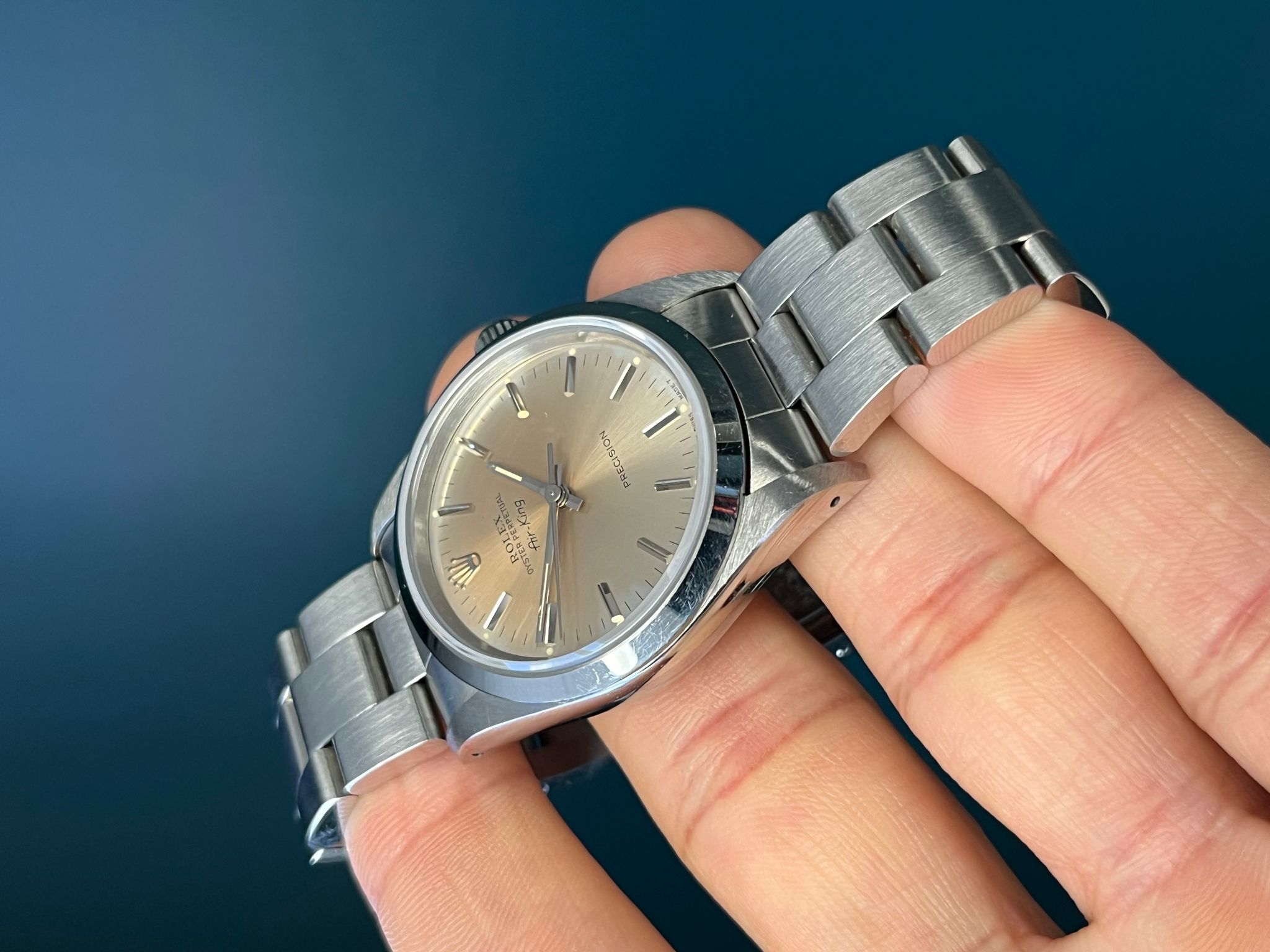The Rolex Oyster Perpetual Air-King Reference 14000 with a Pink toned tropical Dial is a stunning example of Rolex's commitment to timeless elegance and superior craftsmanship. This exquisite timepiece features a 34mm stainless steel case, perfectly balanced for both comfort and style. The unique tropical Pink-colored dial adds a touch of sophistication, beautifully contrasted by the sleek, minimalist design and luminous hour markers. Powered by the reliable Rolex Caliber 3000 automatic movement, the Air-King 14000 guarantees precise timekeeping and robust performance. The smooth bezel and classic Oyster bracelet enhance its refined aesthetic, making it suitable for any occasion. This particular model, with its rare and captivating tropical pink toned dial, stands out as a distinctive and highly sought-after addition to any watch collection, embodying the perfect blend of tradition and modernity.