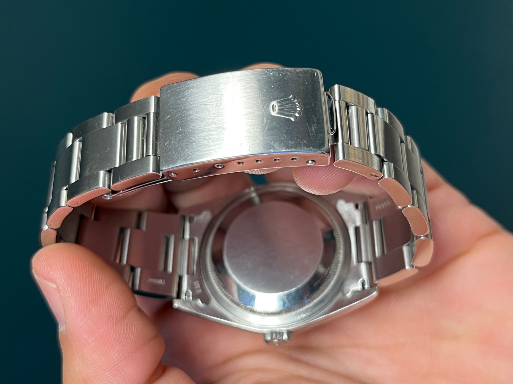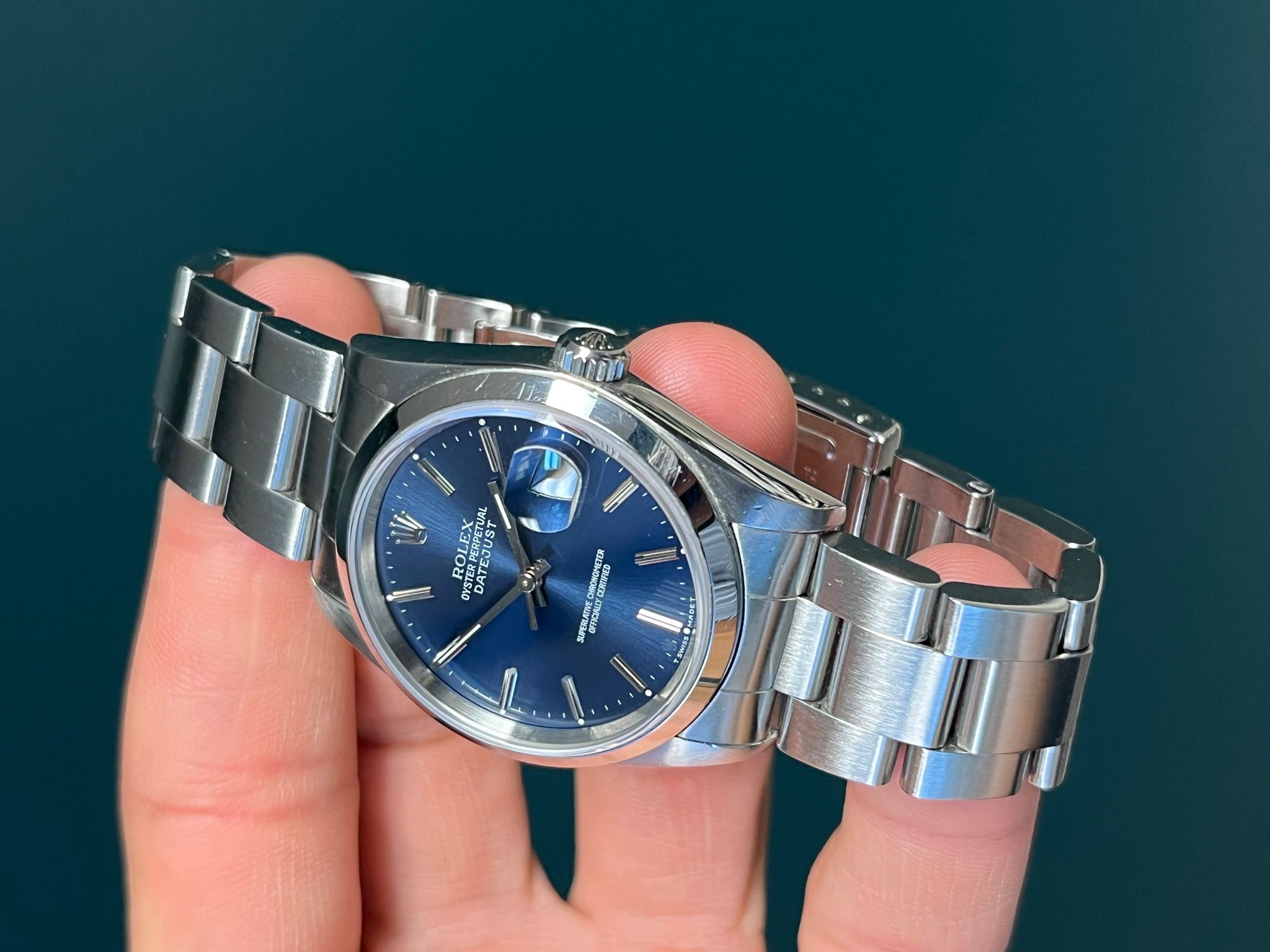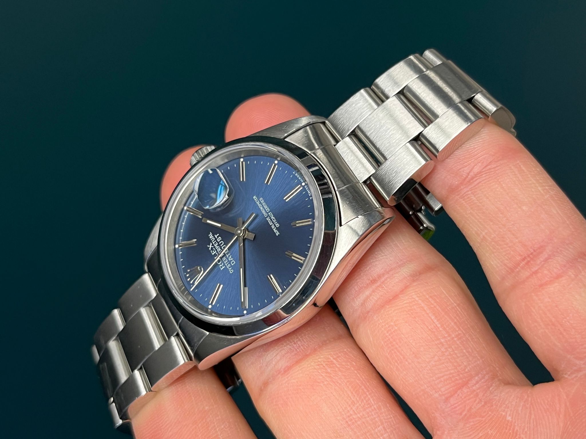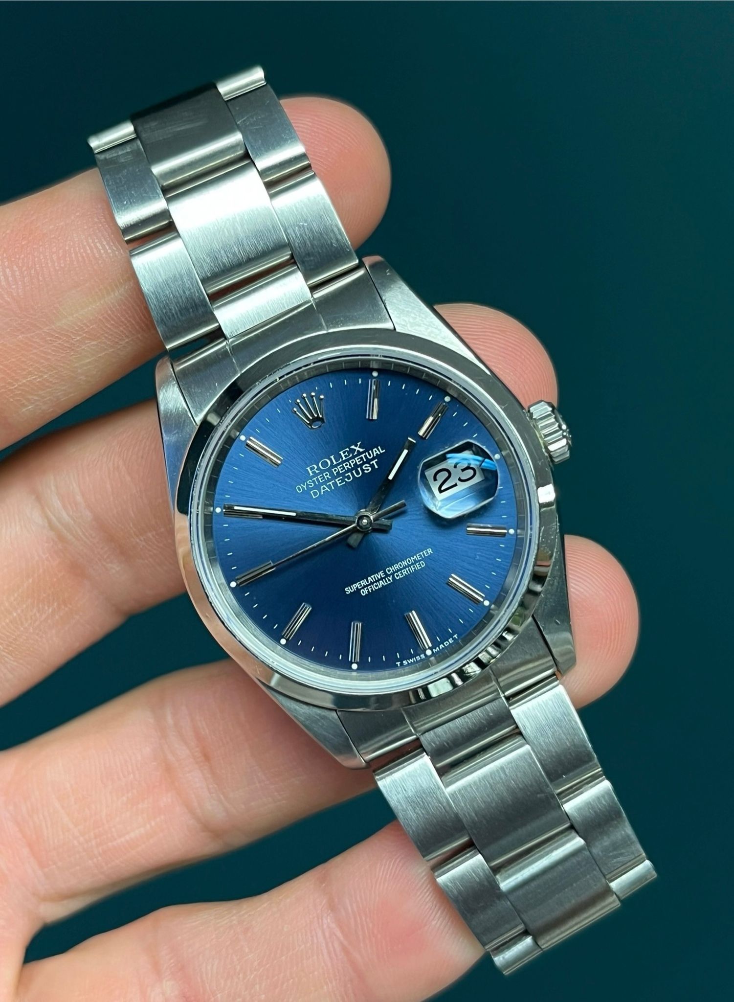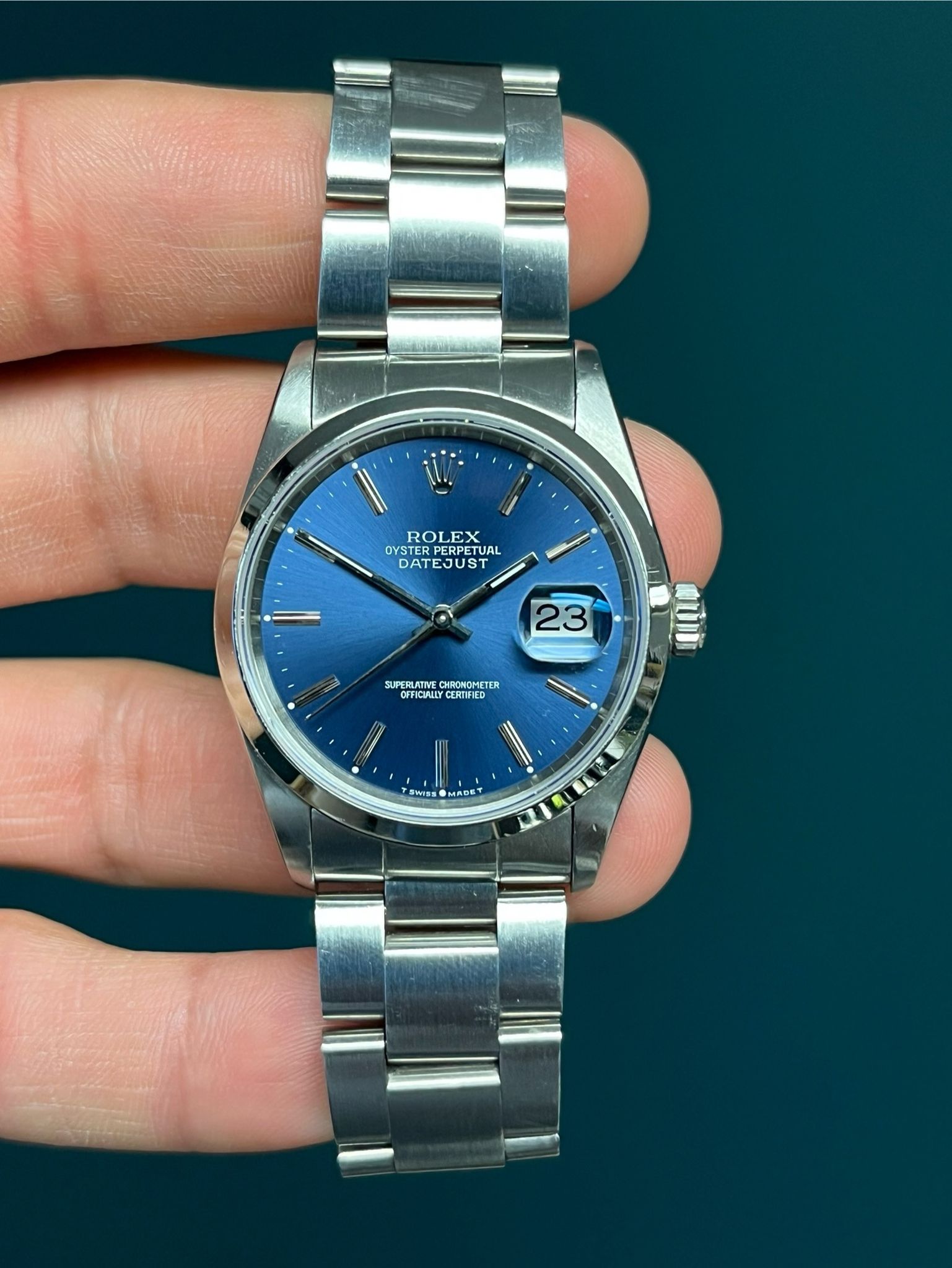 The Rolex Datejust reference 16200 exudes timeless elegance with its 36mm stainless steel case and rare Blue stick dial, epitomizing classical sophistication. Featuring a date complication at 3 o'clock, this watch offers both style and practicality. Its smooth stainless steel bezel adds a touch of luxury, while the reliable automatic movement ensures precision timekeeping. Paired with a comfortable Oyster bracelet and boasting water resistance up to 100 meters, the Datejust 16200 is a versatile timepiece suitable for any occasion, coveted by collectors for its enduring appeal and craftsmanship.