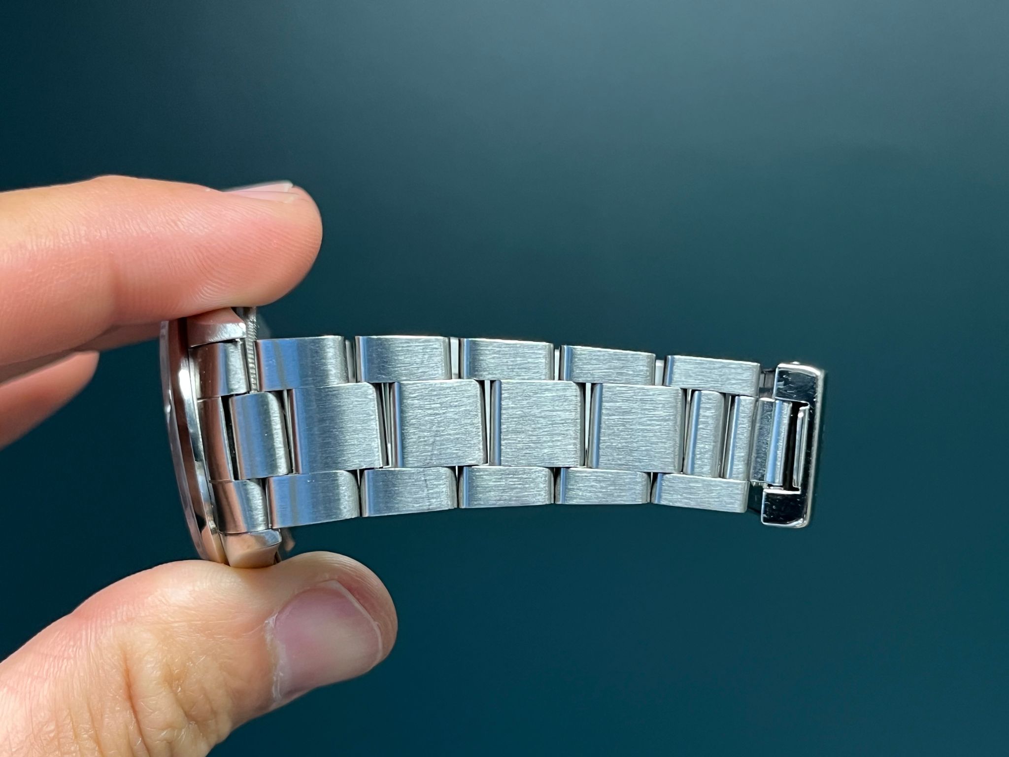 This example is in excellent condition. The no holes case is crisp and sharp. The Blue stick dial is excellent. The solid link oyster bracelet has 12 total links and shows no stretch. This example has been serviced and comes with RSC card from 6/25/19, Here is a lovely example with a rare dial variation and a great look!