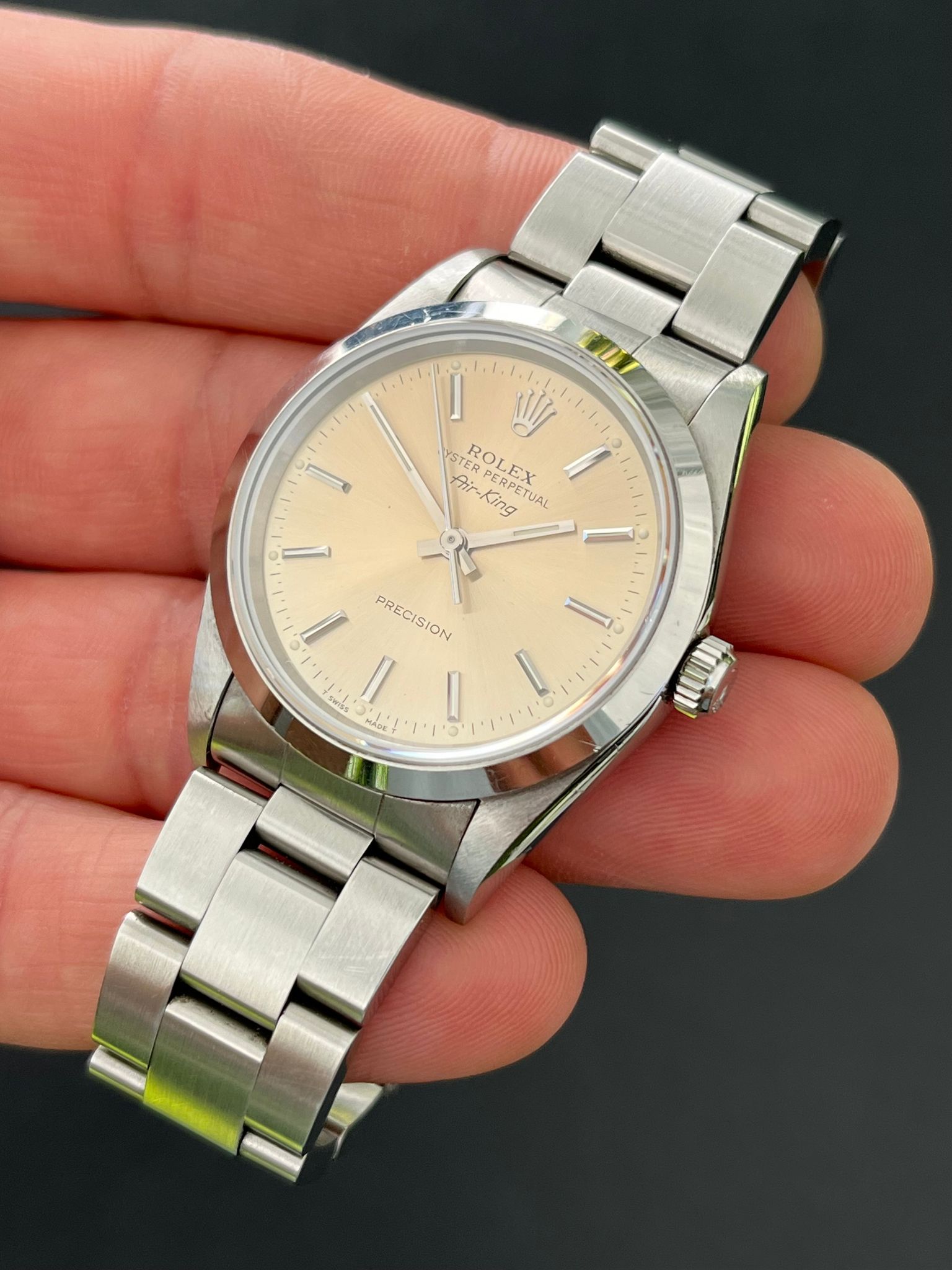 The Rolex Oyster Perpetual Air-King Reference 14000 with a Salmon pink toned tropical Dial is a stunning example of Rolex's commitment to timeless elegance and superior craftsmanship. This exquisite timepiece features a 34mm stainless steel case, perfectly balanced for both comfort and style. The unique tropical salmon-colored dial adds a touch of sophistication, beautifully contrasted by the sleek, minimalist design and luminous hour markers. Powered by the reliable Rolex Caliber 3000 automatic movement, the Air-King 14000 guarantees precise timekeeping and robust performance. The smooth bezel and classic Oyster bracelet enhance its refined aesthetic, making it suitable for any occasion. This particular model, with its rare and captivating tropical salmon toned dial, stands out as a distinctive and highly sought-after addition to any watch collection, embodying the perfect blend of tradition and modernity.