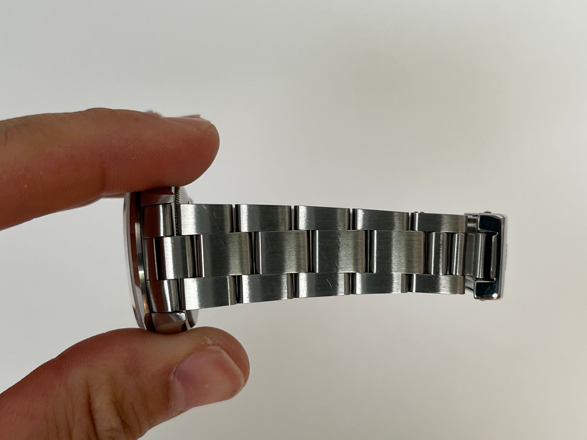 Today's example comes as watch only and is in excellent unpolished condition. The no holes case is razor sharp and crisp, with case back sticker still present. The Tropical Salmon toned dial is mint and shows no visible wear. The bracelet has 12 links and show no stretch. A top example in its reference class with a charming tropical dial.