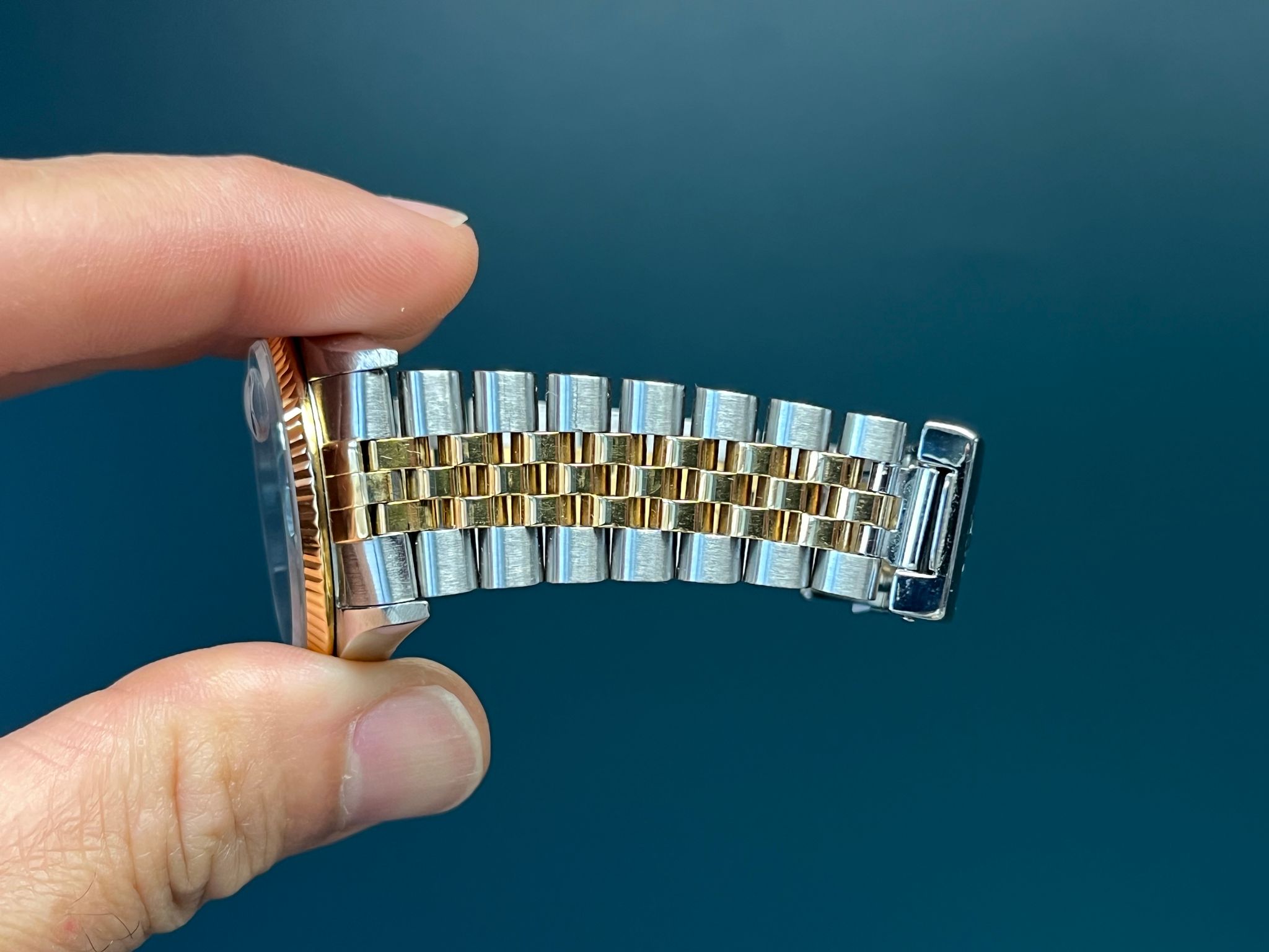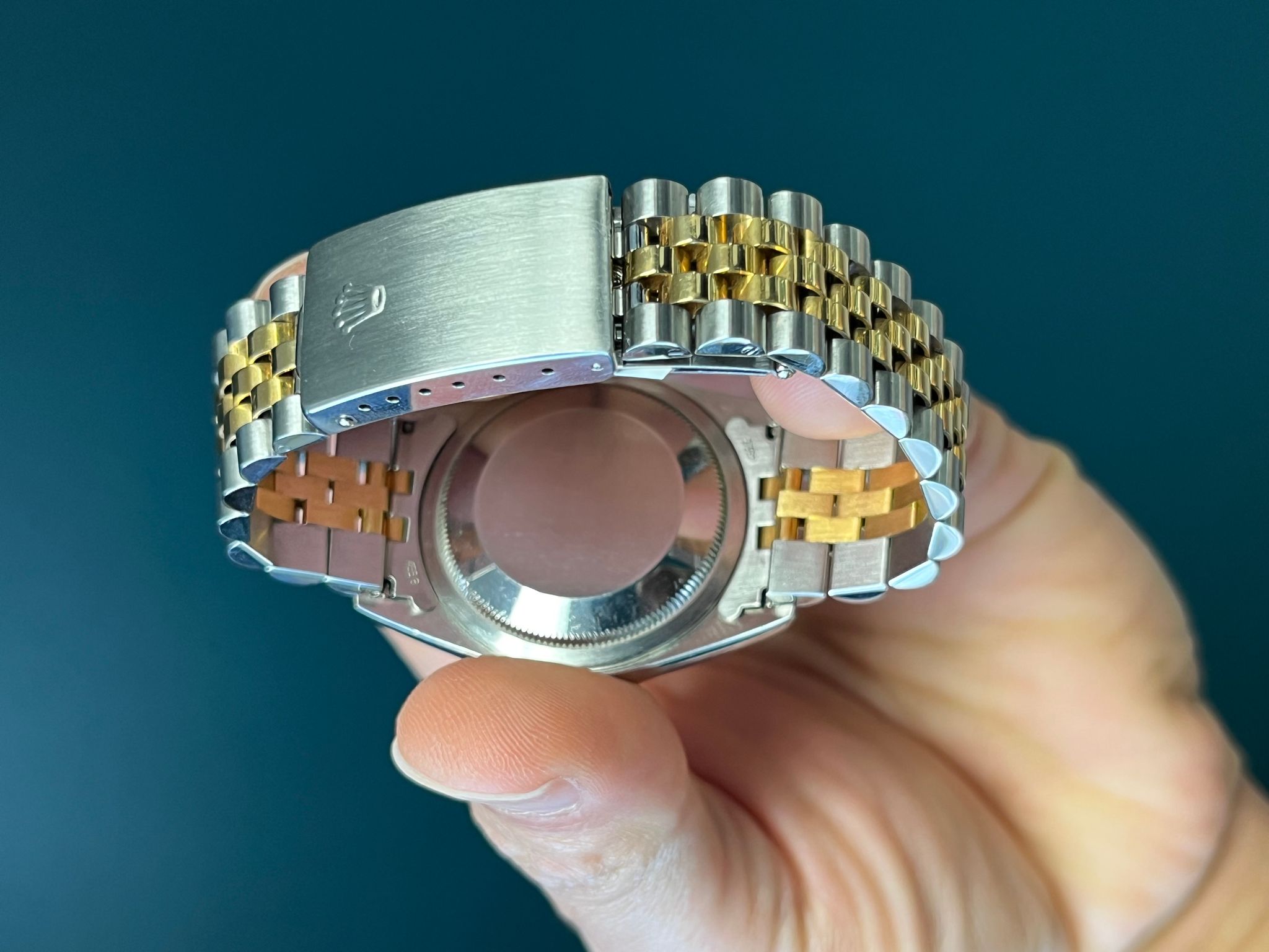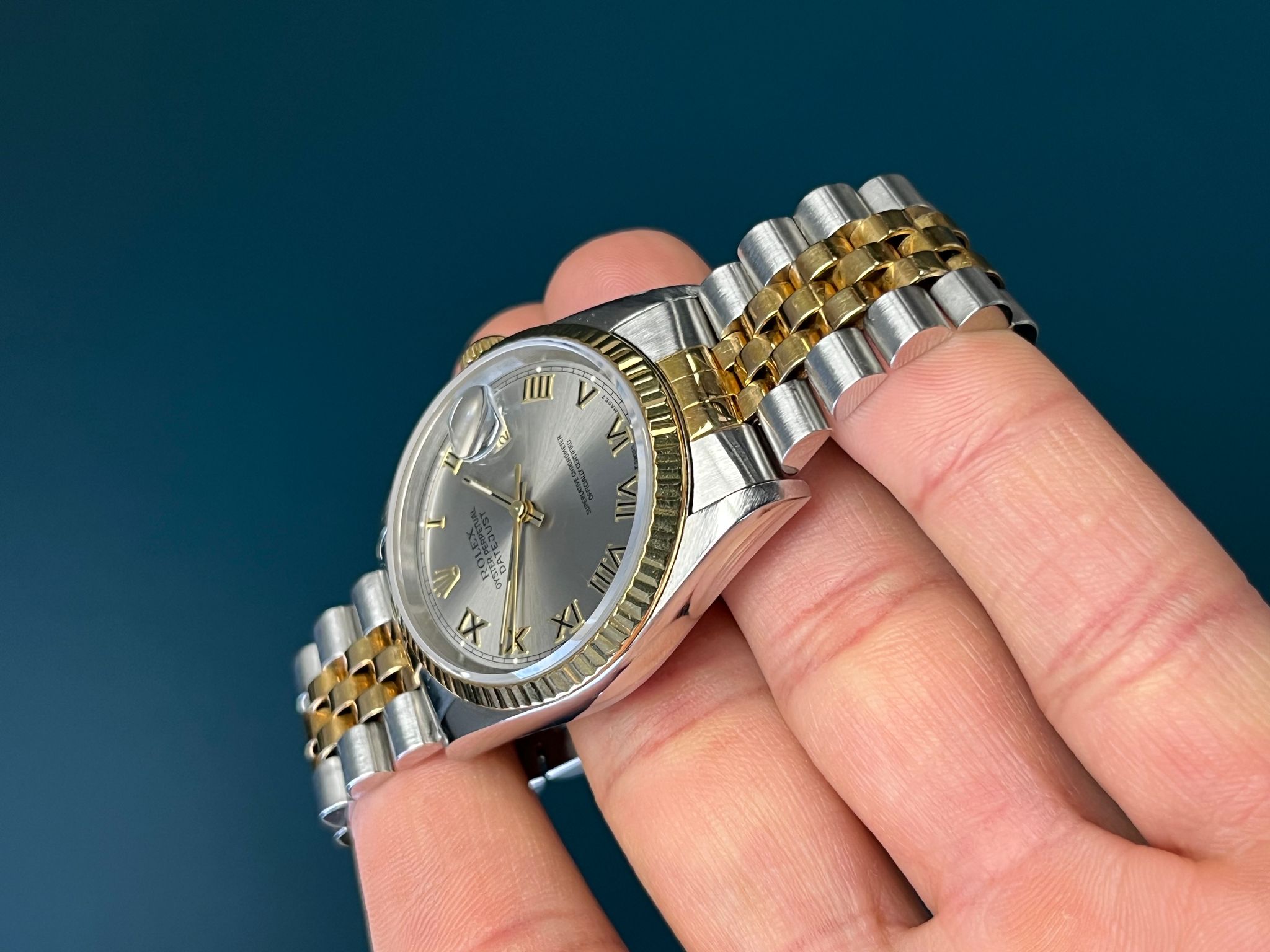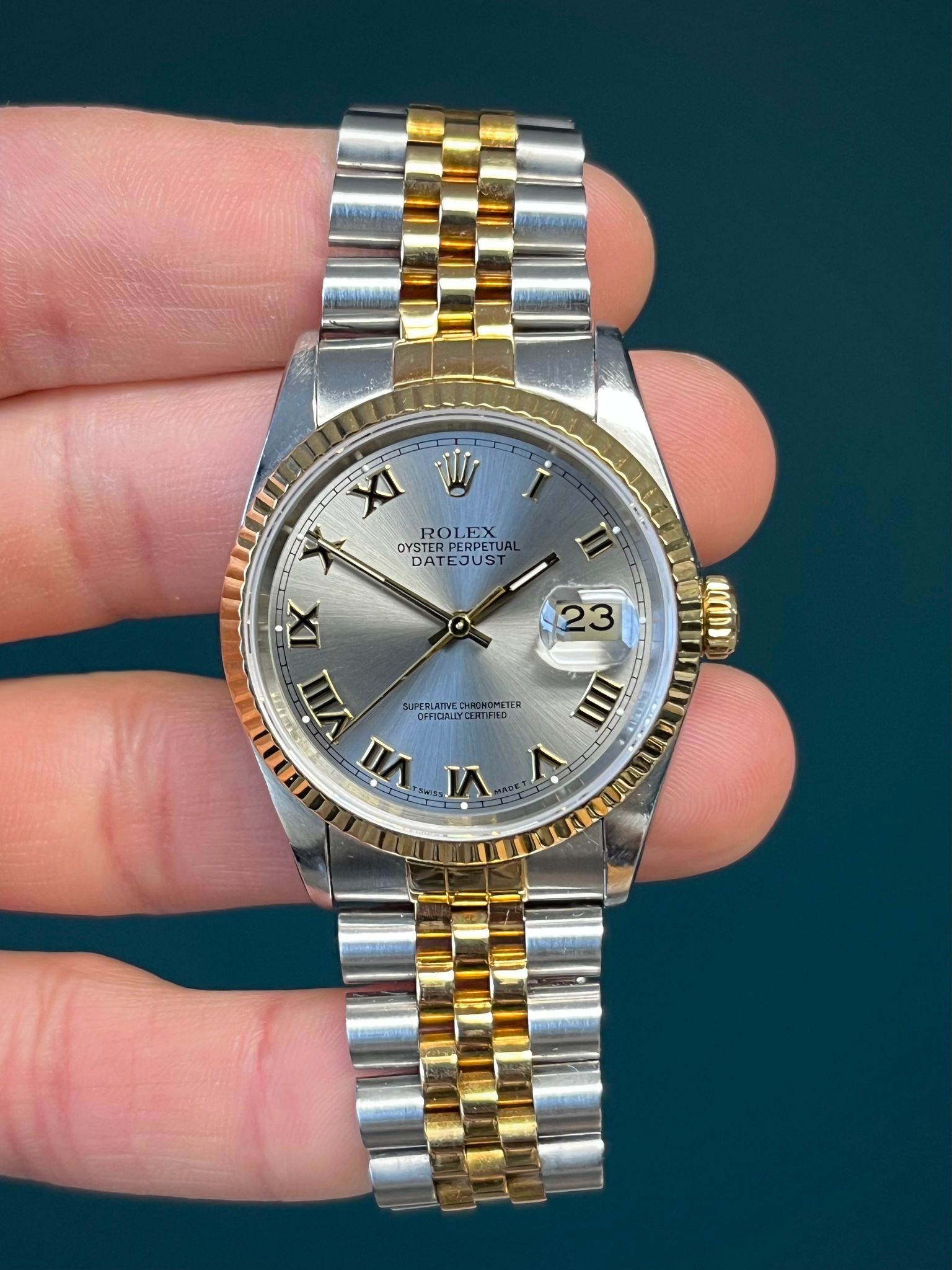 The Rolex Datejust Ref. 16233 is a timeless and elegant timepiece that epitomizes luxury and sophistication. This iconic wristwatch features a striking factory grey roman Dial, which adds a touch of opulence and refinement to its classic design. Encased in a beautifully polished stainless steel and 18k yellow gold combination, the watch seamlessly combines durability and style. With its signature Cyclops date magnification window and self-winding movement, the Rolex Datejust Ref. 16233G is not only a symbol of horological excellence but also a statement of timeless elegance for those who appreciate the finer things in life.