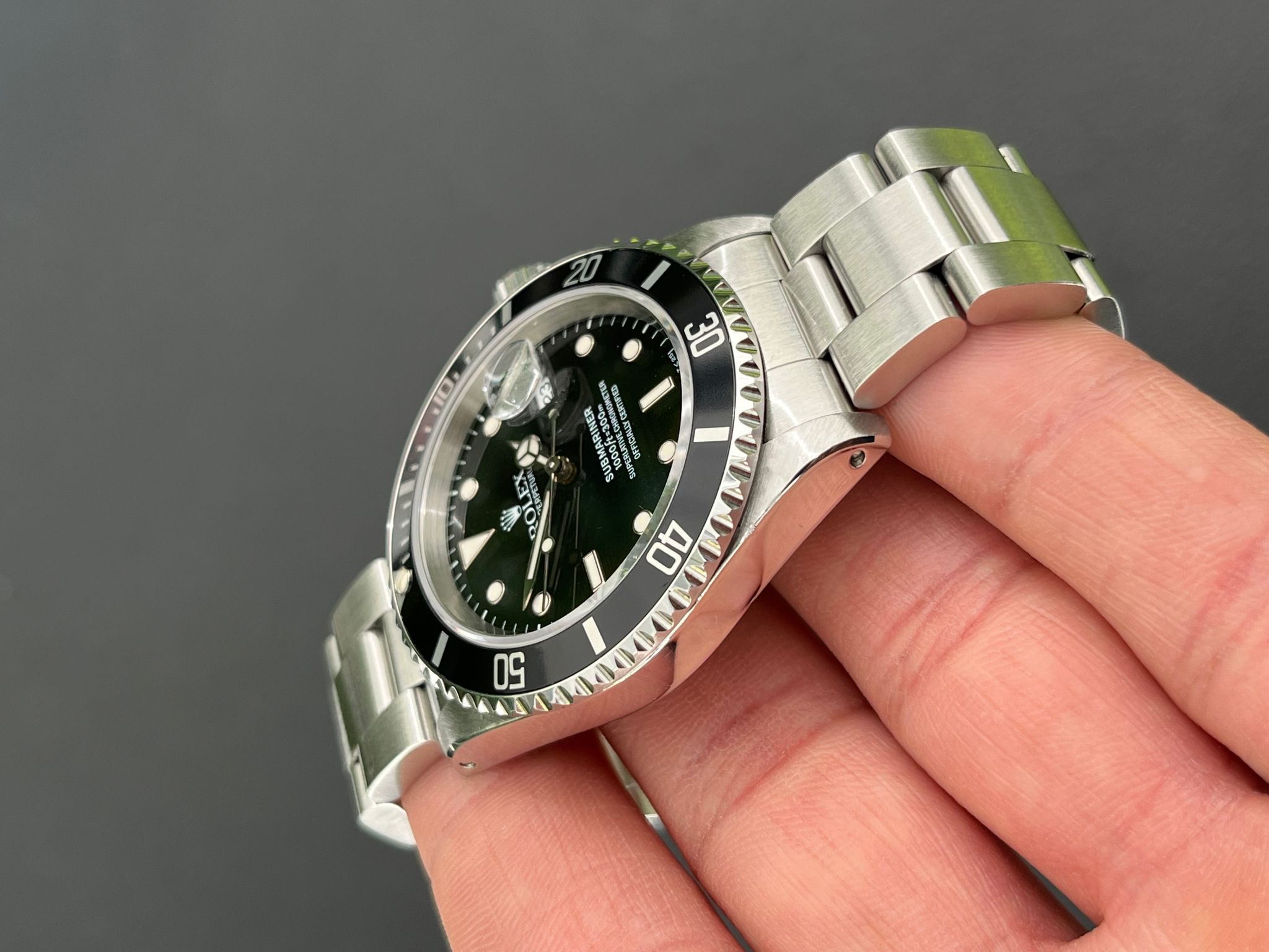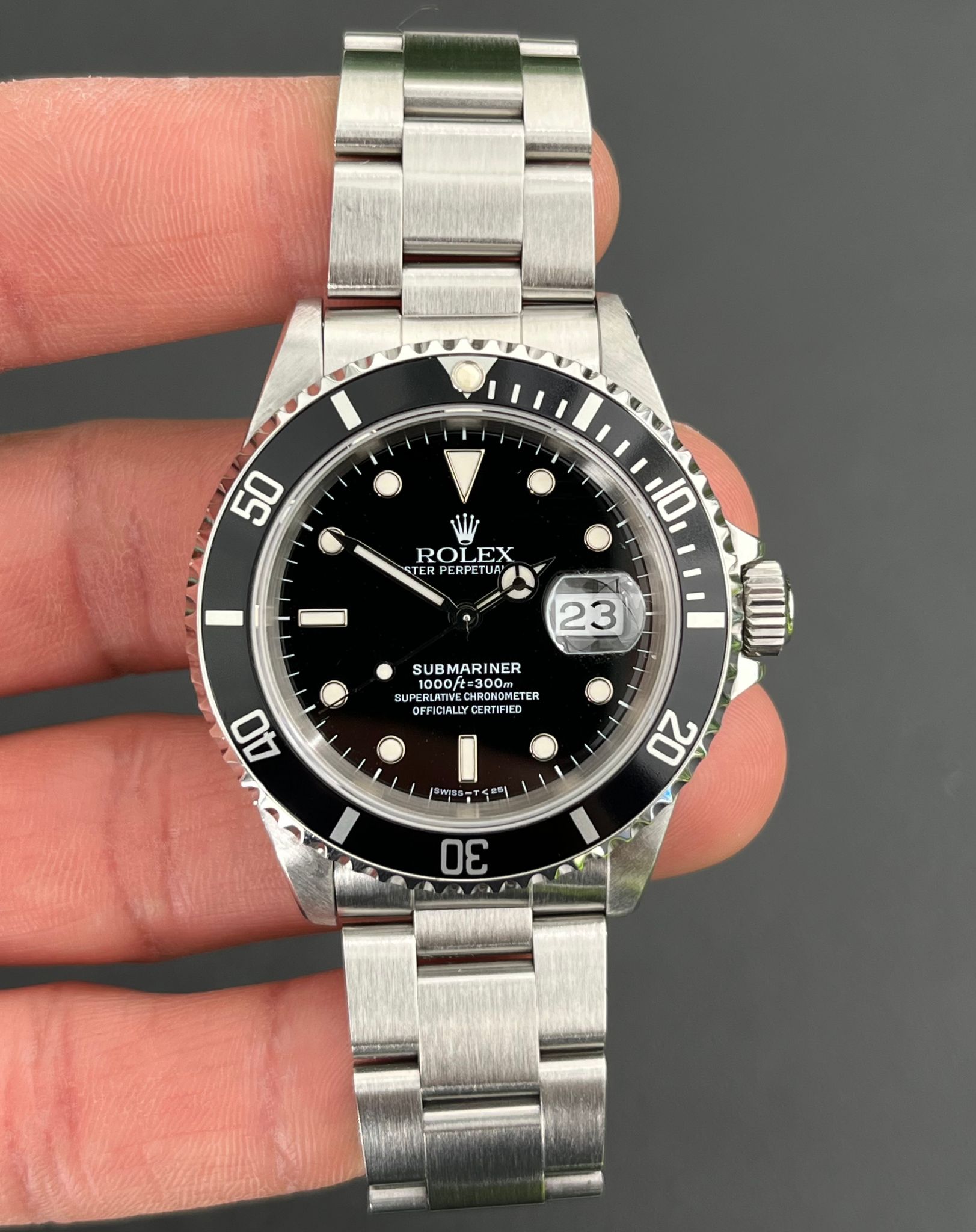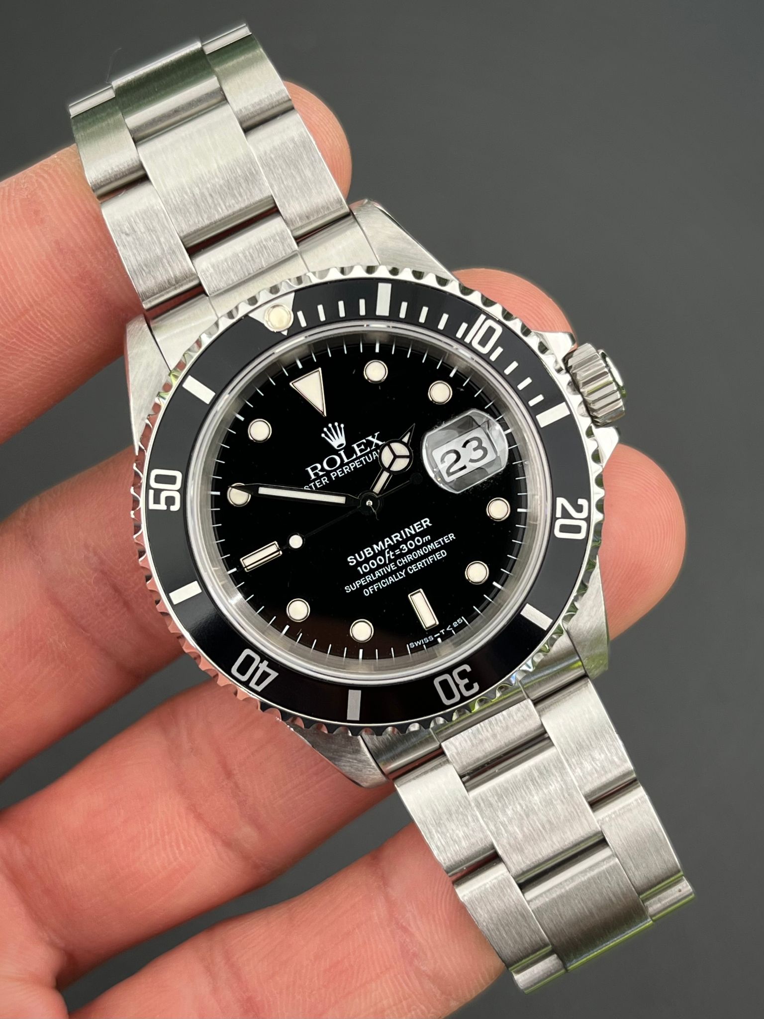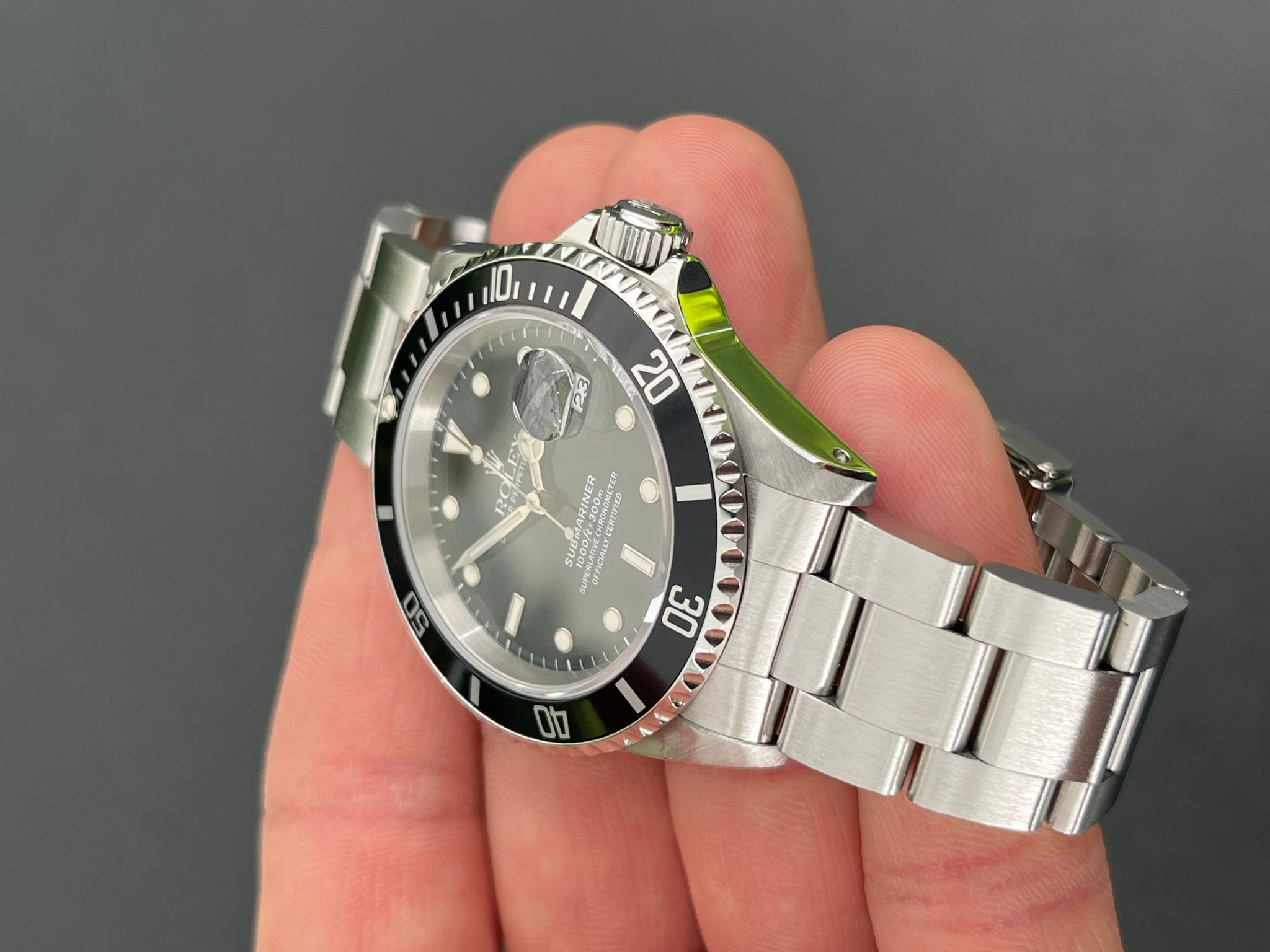 The Rolex 16610 Date Submariner is a highly sought-after vintage timepiece known for its distinctive design. This classic Submariner model, produced until the mid-2000s, features a stainless steel case with holes on the lugs for the spring bars, giving it a sleek and timeless appearance. Renowned for its durability, water resistance, and iconic aesthetics, the Rolex 16610 is a beloved choice among watch enthusiasts and collectors.