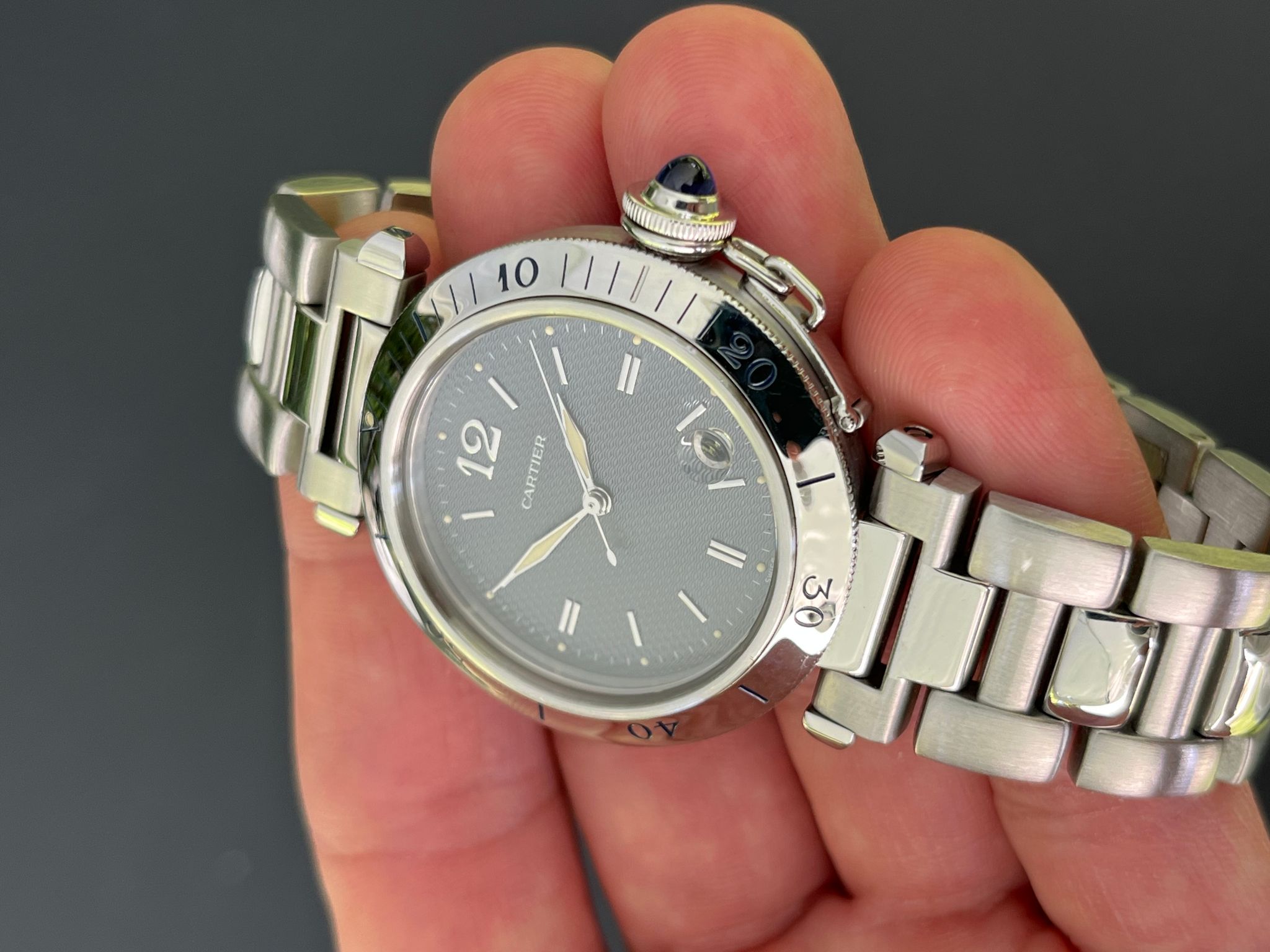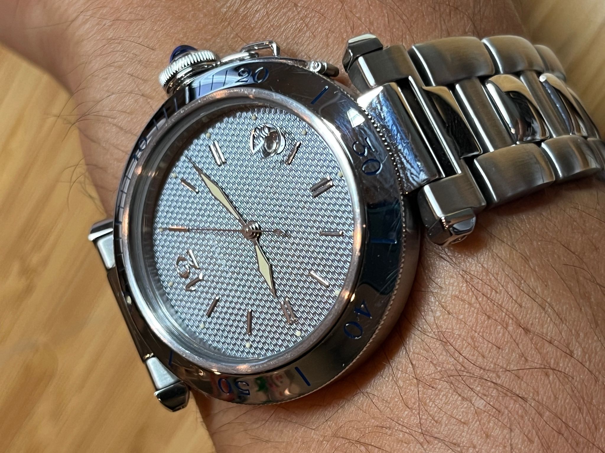 Today's example comes to us in excellent vintage condition, equipped with a rare guilloché dial and accompanied by its full complete set. The bidirectional bezel is excellent. The bracelet is fully linked and shows no stretch. The case is unpolished. Just an excellent Pasha example, with a rare dial and as a full set at an affordable price for today!