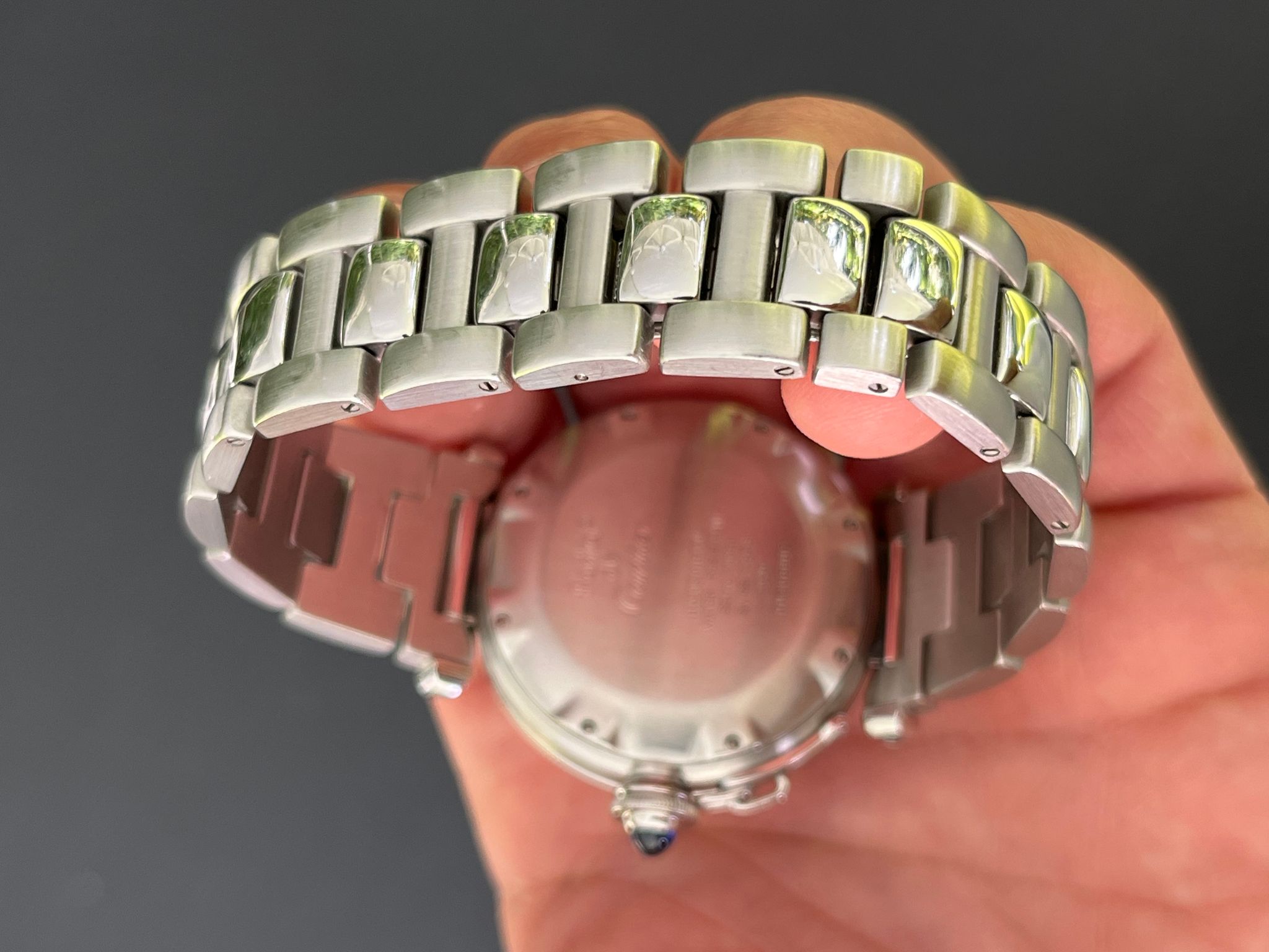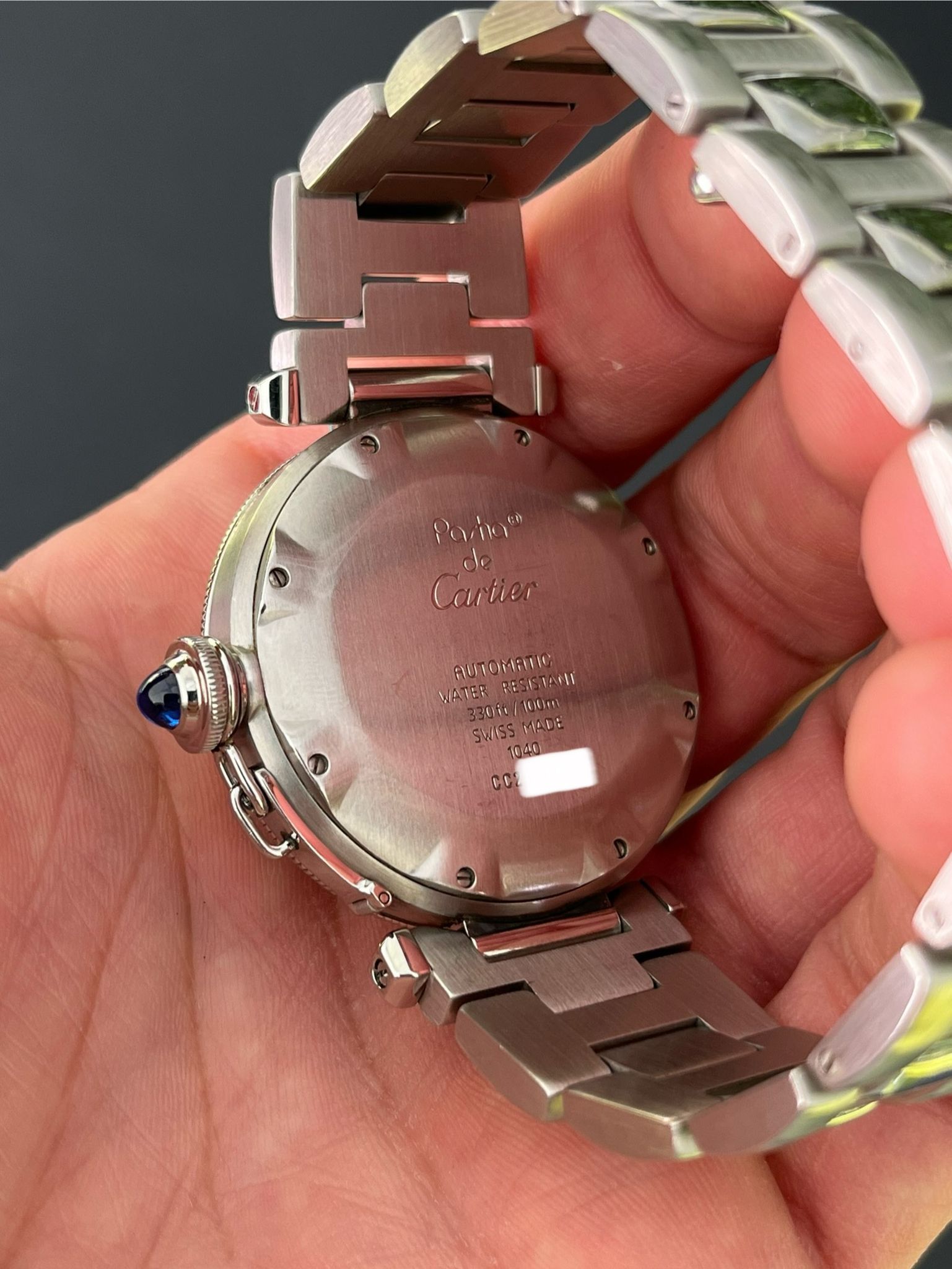 The Cartier Pasha Reference 1040 W31017H3 is a distinguished timepiece that seamlessly blends luxury with bold design. Featuring a rare guilloché dial, this full complete set includes the original box, papers, and accessories, making it a highly collectible item. The 38mm stainless steel case is accentuated by Cartier's signature screw-down crown cap, attached with a chain for added flair. Its automatic movement ensures reliable performance, while the unique dial design adds an extra touch of sophistication and elegance. This Pasha model, with its iconic design and rare dial, is a true testament to Cartier’s craftsmanship and style. Perfect for collectors seeking a standout piece.