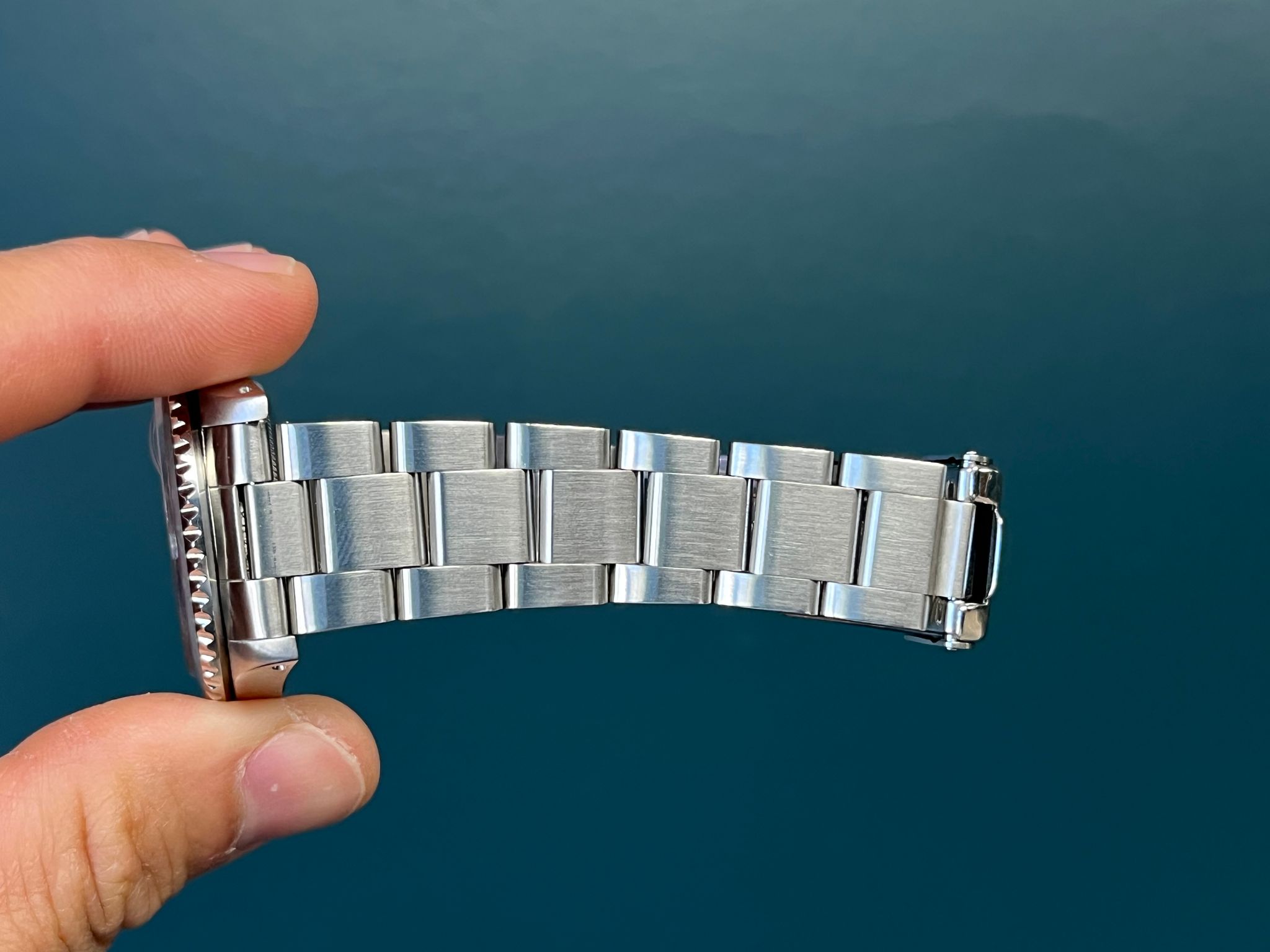 This example comes to us in very nice vintage condition. The insert shows a nice fade to it with light wear. The case has thick even chamfers throughout. The bracelet has 12 links total and shows no stretch. The dial is excellent showing no wear. Just a lovely example, at an affordable price, with a great look!