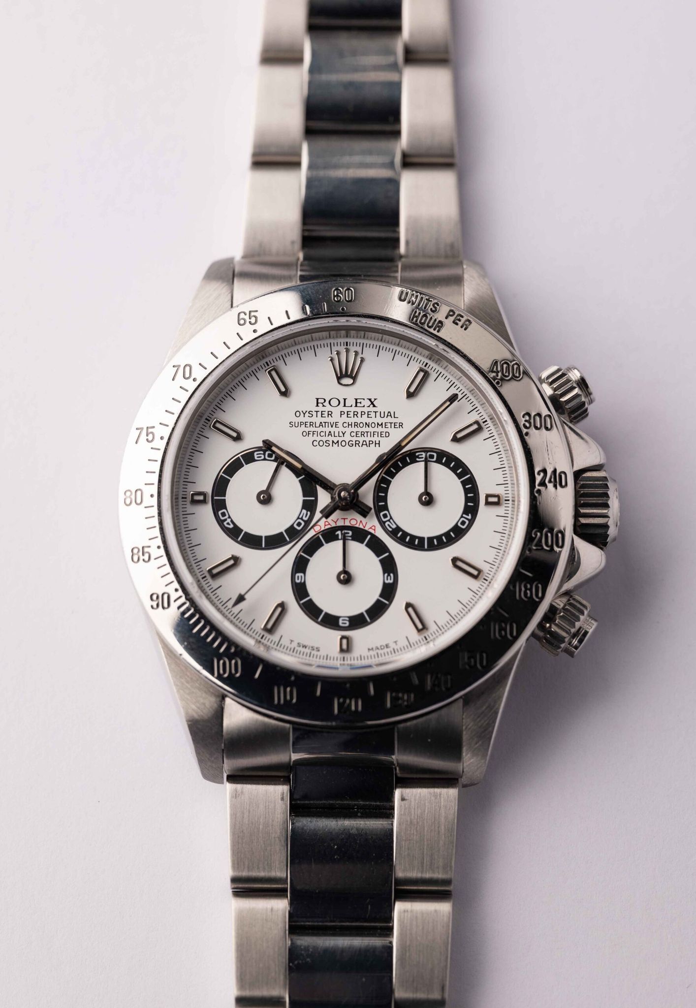 Zenith cal. 4030 powered, the first automatic 40mm Daytona, Rolex's 16520 might be compared to Porsche's 993; a more-modern interpolation of classic design, still true to heritage. White Panda dial with softly yellow tritium gives contrast, robust steel case remains excellent.