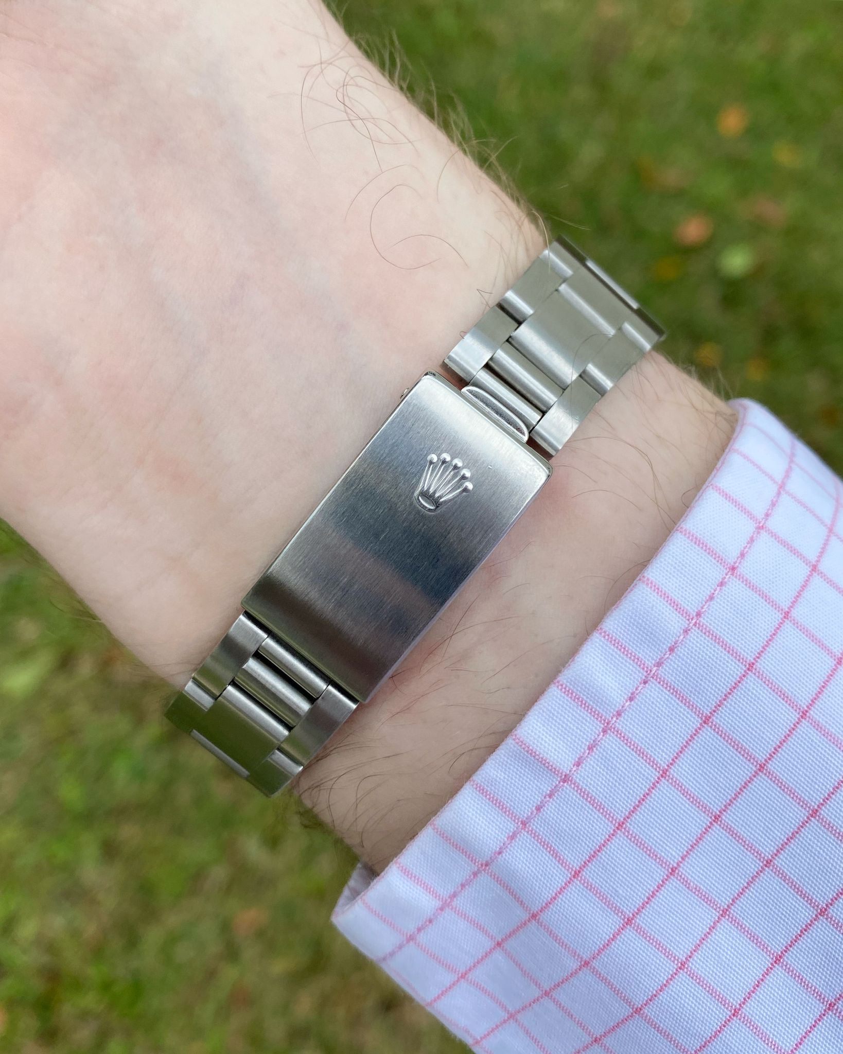 The case has been preserved well and retains evenly thick lugs. The Oyster bracelet contains minimal stretch and remains in approximately 90% condition, while the coronet on the clasp remains thick and crisp. The factory Domino's dial has acquired some minor sunlight discoloration by 3 and 4 o’clock, which some may consider “topical”.