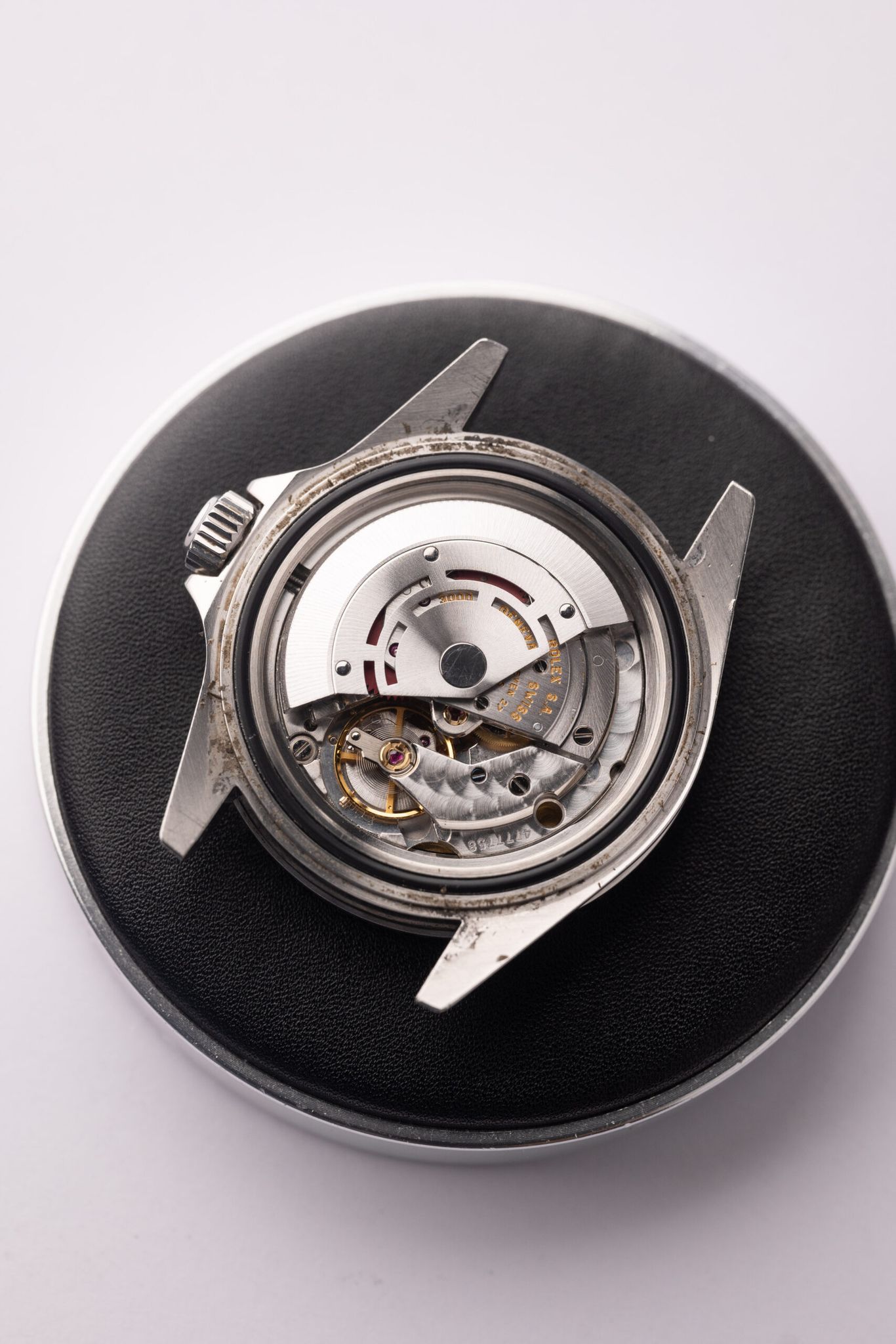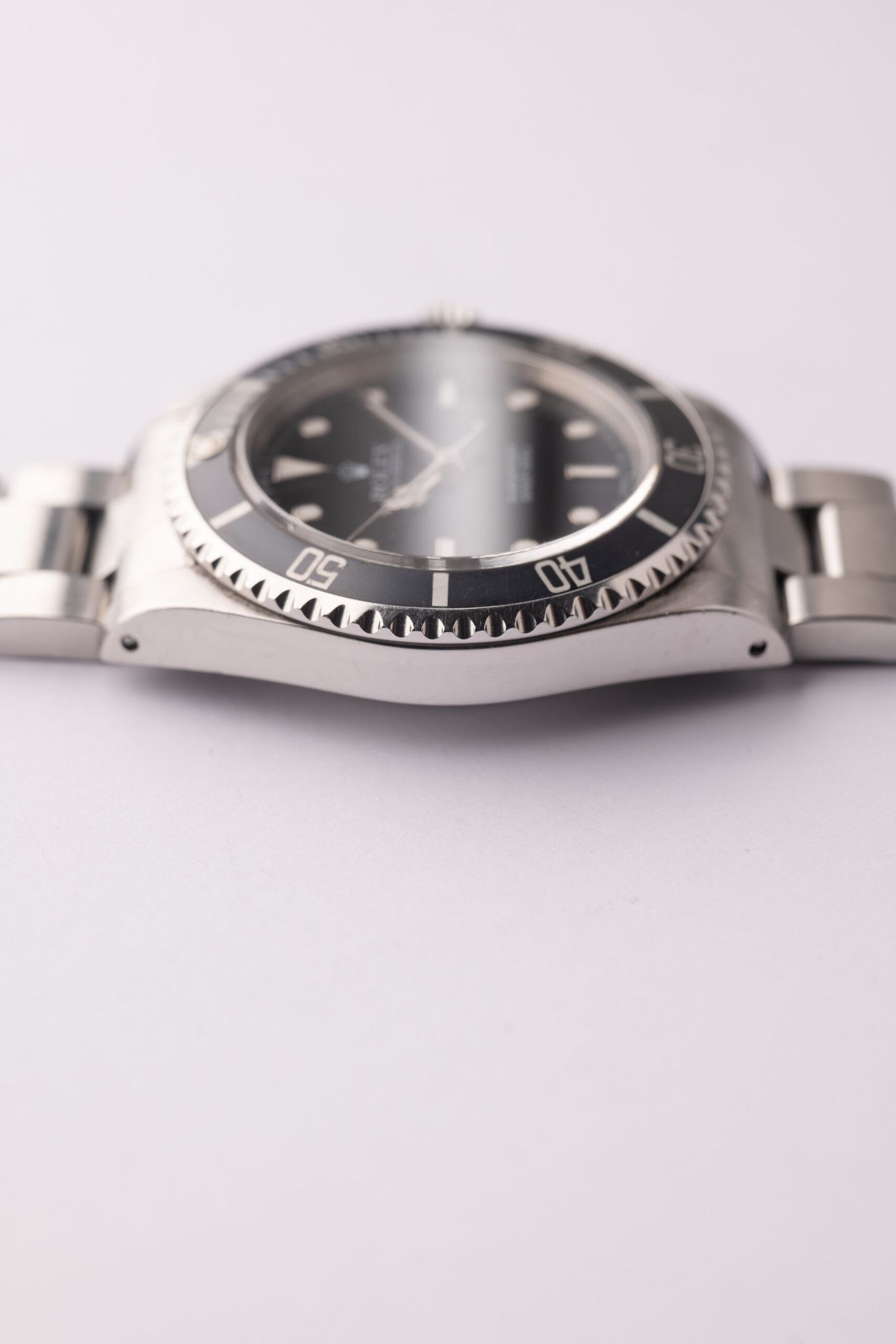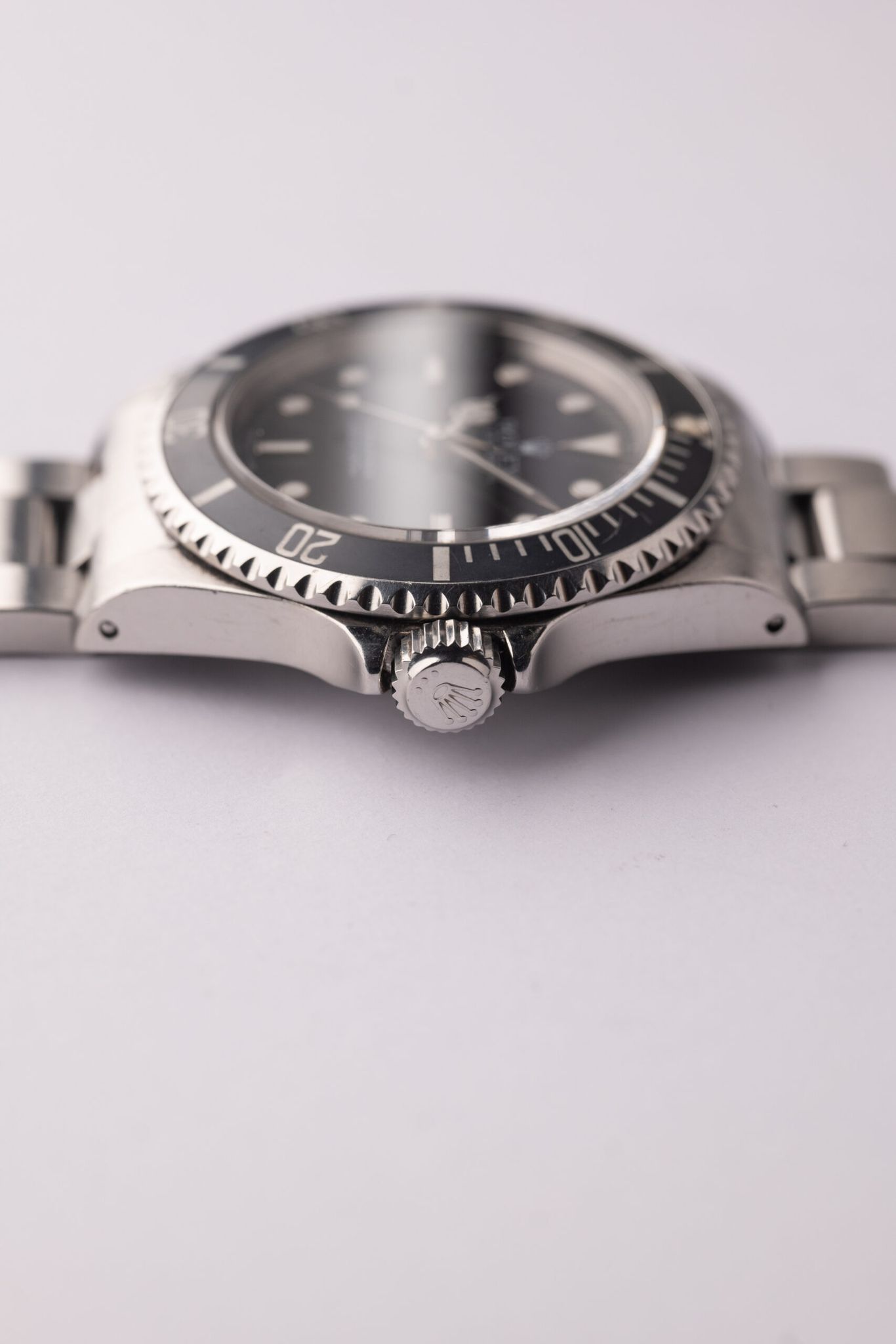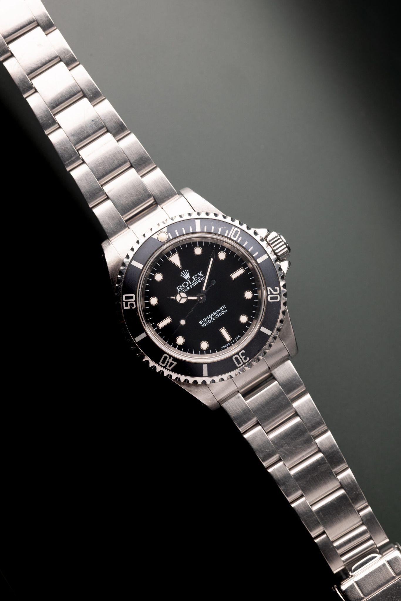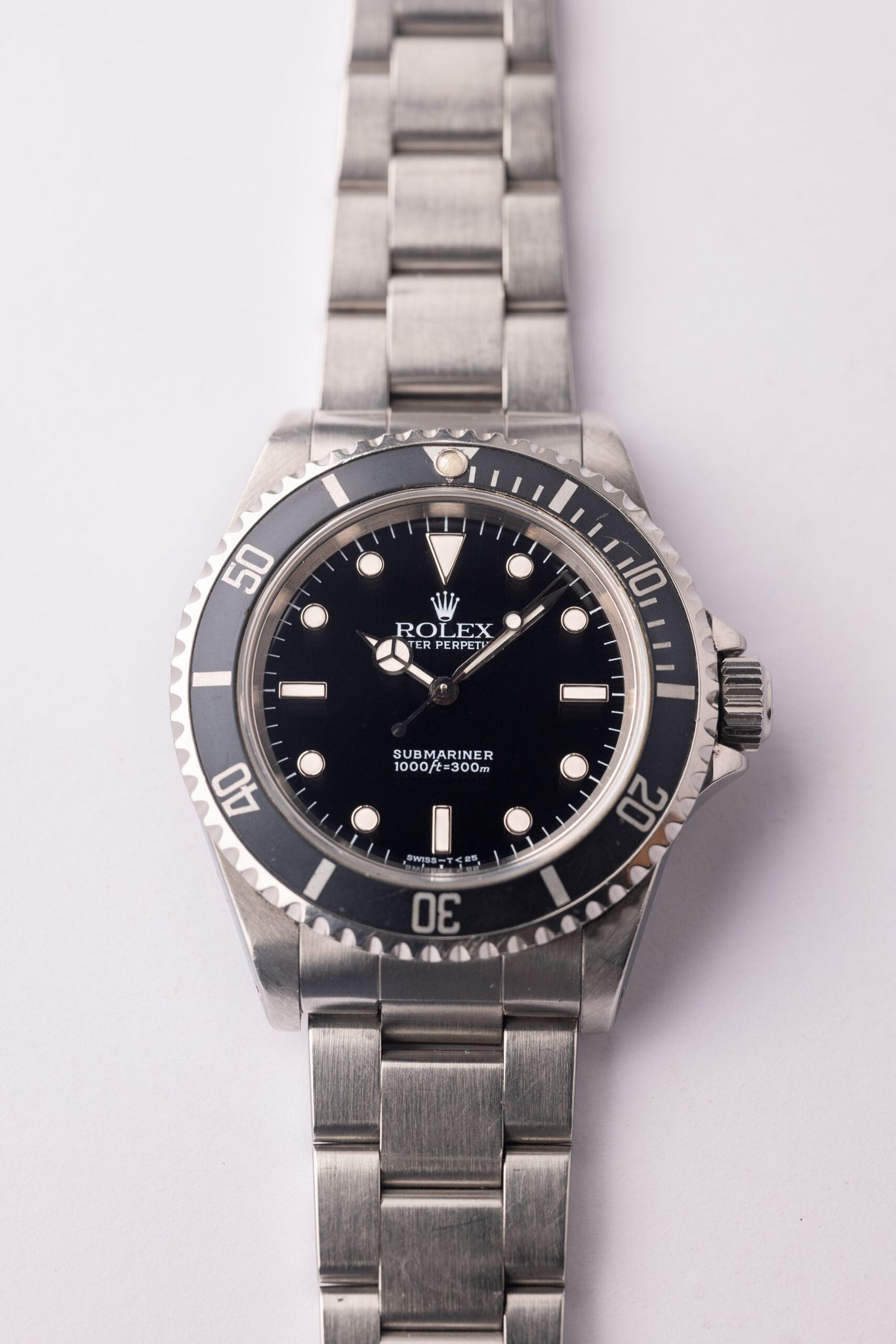 A minimalist neo-vintage tool-watch whose no-date aesthetic mirrors the pure function of Submariner lore. Purists and vintage enthusiasts alike appreciate the 14060 for its symmetrical dial sans date. The dial plots have a light lume coloring on them.
