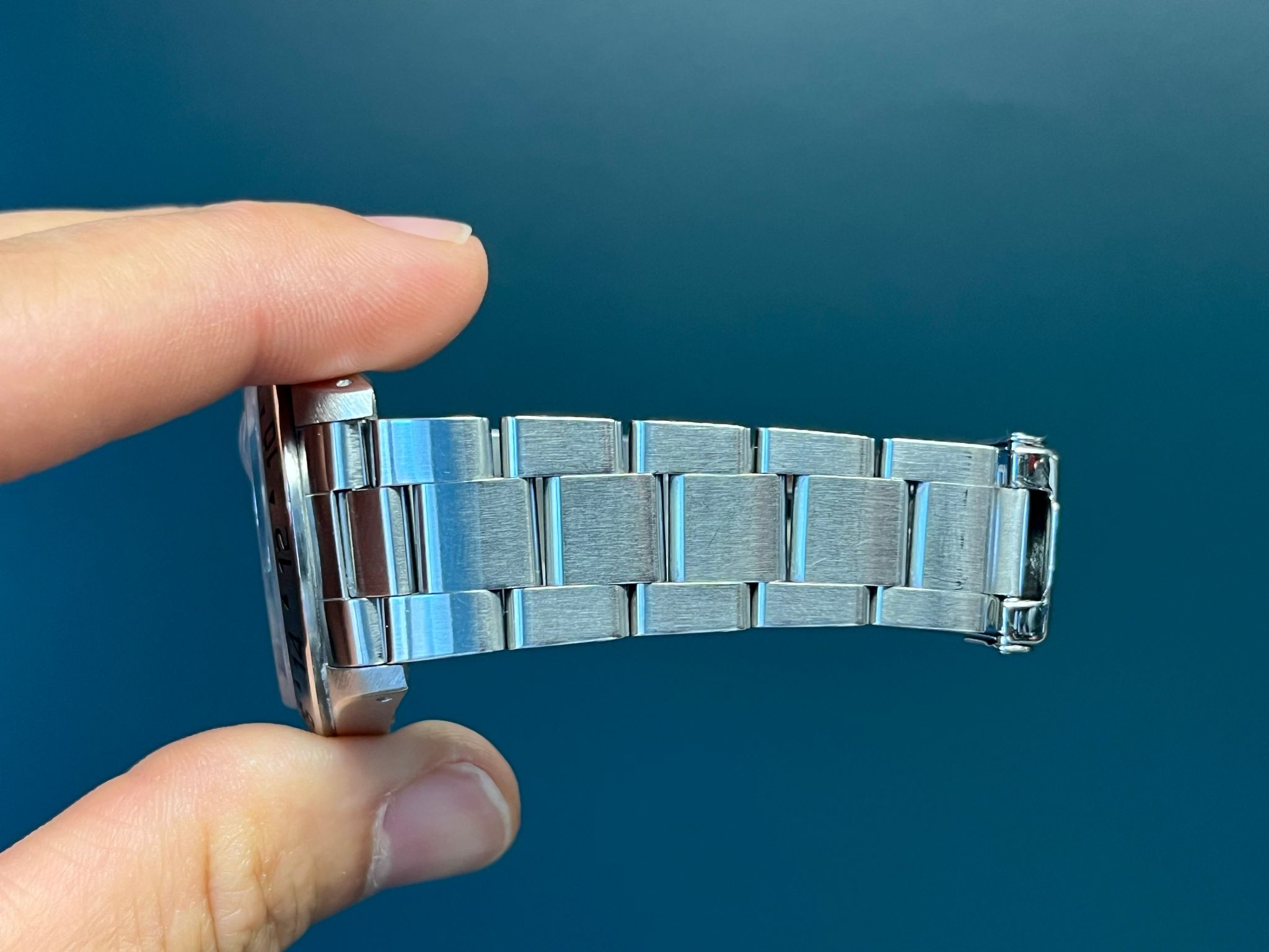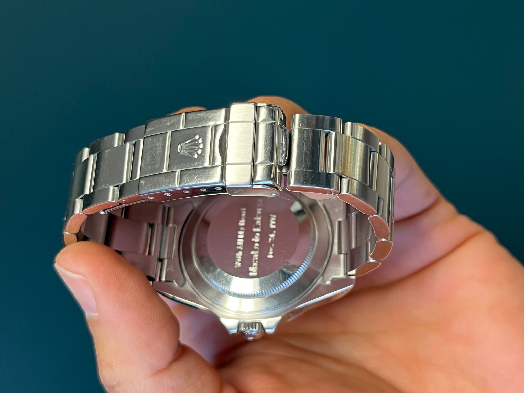 Today we have a lovely sharp 16570 Polar Explorer II full complete set with papers dated 11/1997. The case is sharp showing very prominent chamfers along with a crisp bezel that is thick and rich in its filled enamel. The dial is excellent with no visible wear with matching hands. The Solid link oyster bracelet has 12 links and shows no stretch. This example is running at COSC Specs. This set comes complete with Box, papers, tags, & booklets.
