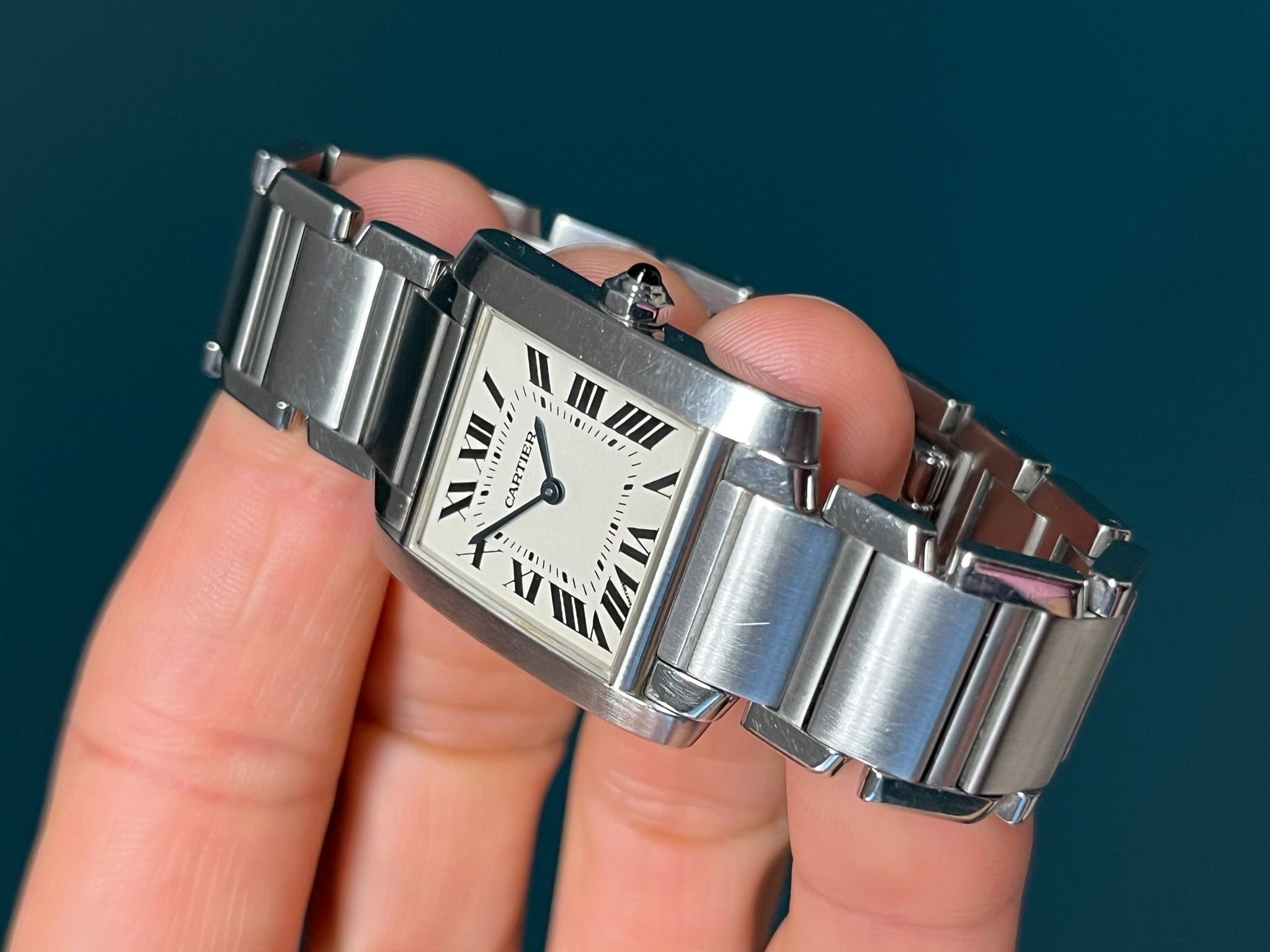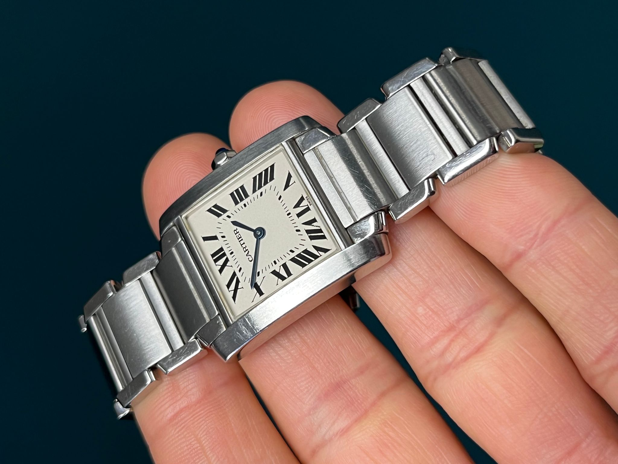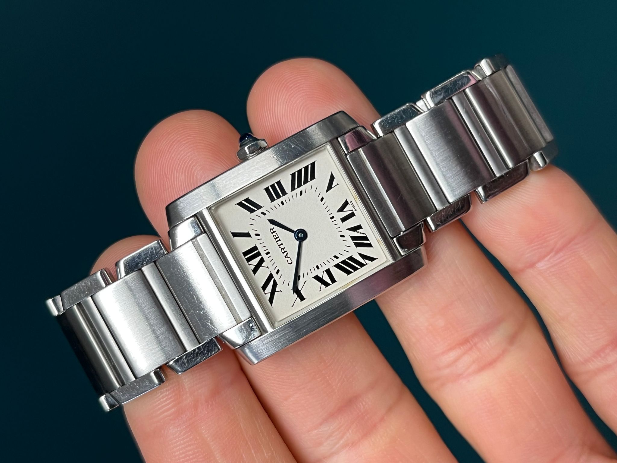 The Cartier Tank Reference 2301 W51003Q3 is a timeless and elegant dress watch, embodying Cartier's signature sophistication and design. This model features a rectangular stainless steel case with smooth edges, paired with a silvered guilloché dial, classic Roman numeral hour markers, and blued steel hands for a refined contrast. The iconic sapphire cabochon crown adds a touch of luxury to its sleek profile. Powered by a precise quartz movement, this watch is both stylish and reliable. This full complete set includes the original box, papers, and documentation, making it a highly desirable piece for collectors seeking an enduring symbol of Cartier's horological mastery.