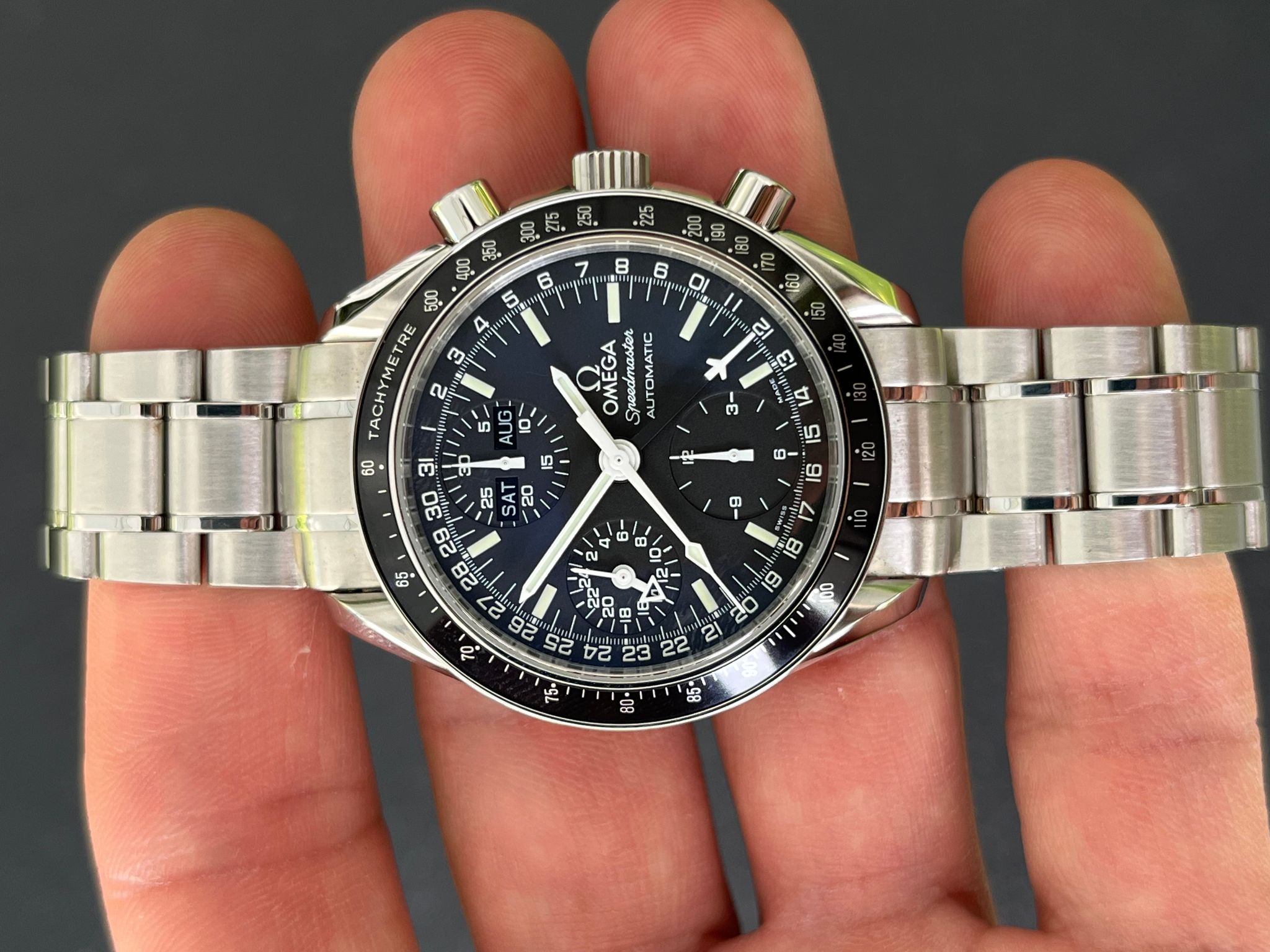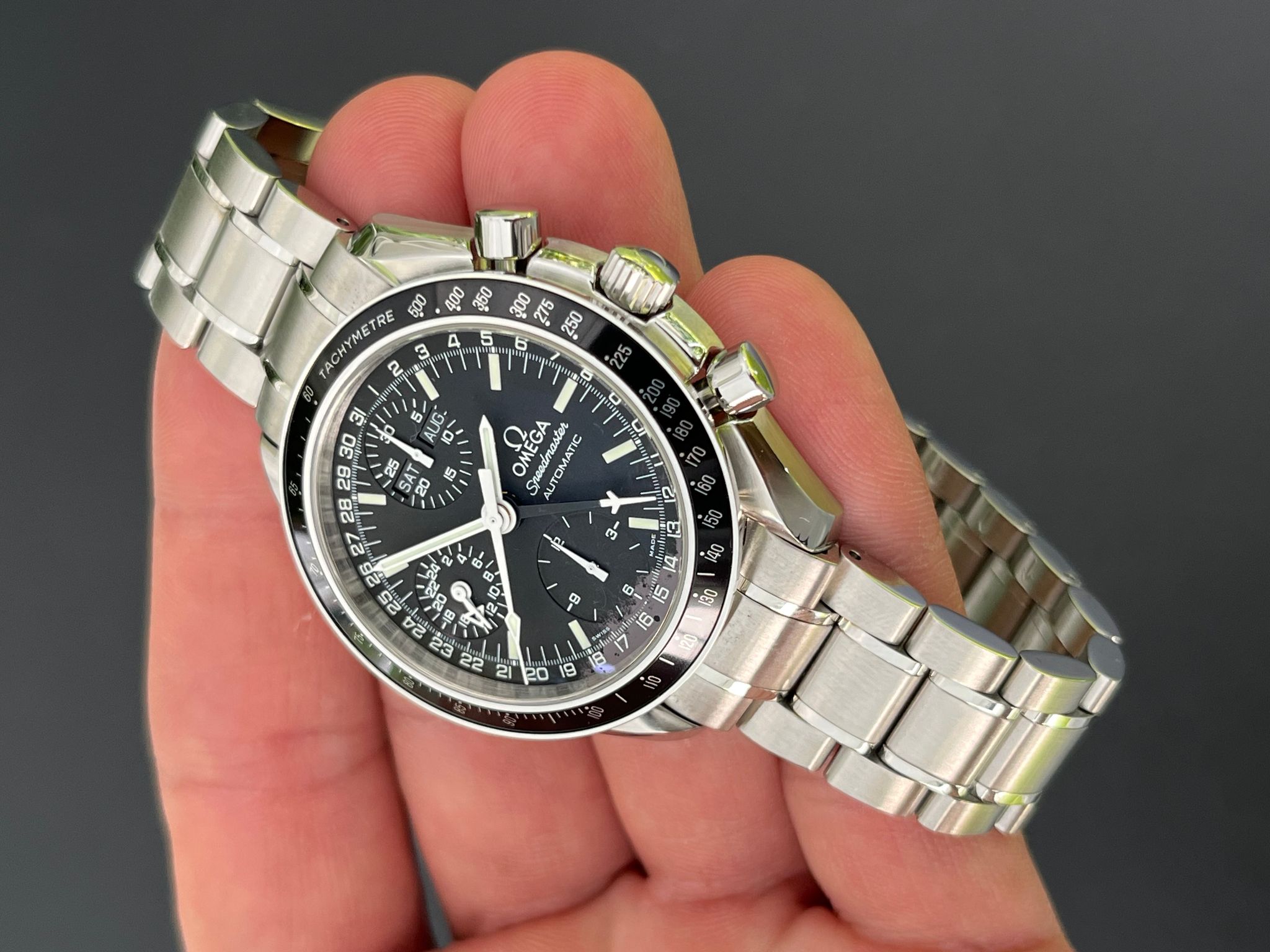 The Vintage Omega Speedmaster Reference 3520.50 is a remarkable timepiece that seamlessly blends historical significance with timeless design, offered here with its original box and papers. This exquisite watch features a robust stainless steel case and bracelet, exemplifying Omega's renowned craftsmanship. The black dial, adorned with luminous hands and cream patina hour markers, includes three sub-dials and a unique triple calendar complication, providing both aesthetic appeal and functional versatility. Powered by the reliable Omega Caliber 1151 automatic movement, this Speedmaster ensures precise timekeeping and durability. The inclusion of the original box and papers enhances its value and authenticity, making it a prized addition for collectors and enthusiasts. The Vintage Omega Speedmaster Reference 3520.50 is not just a watch; it's a piece of horological history that stands as a testament to Omega's legacy of excellence and innovation.