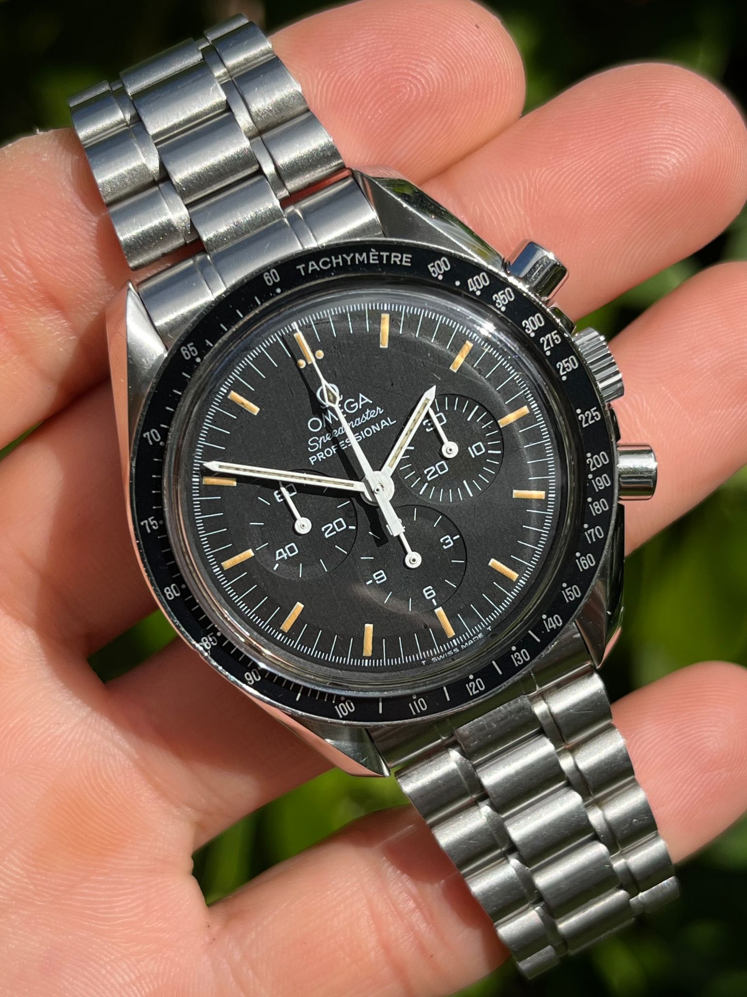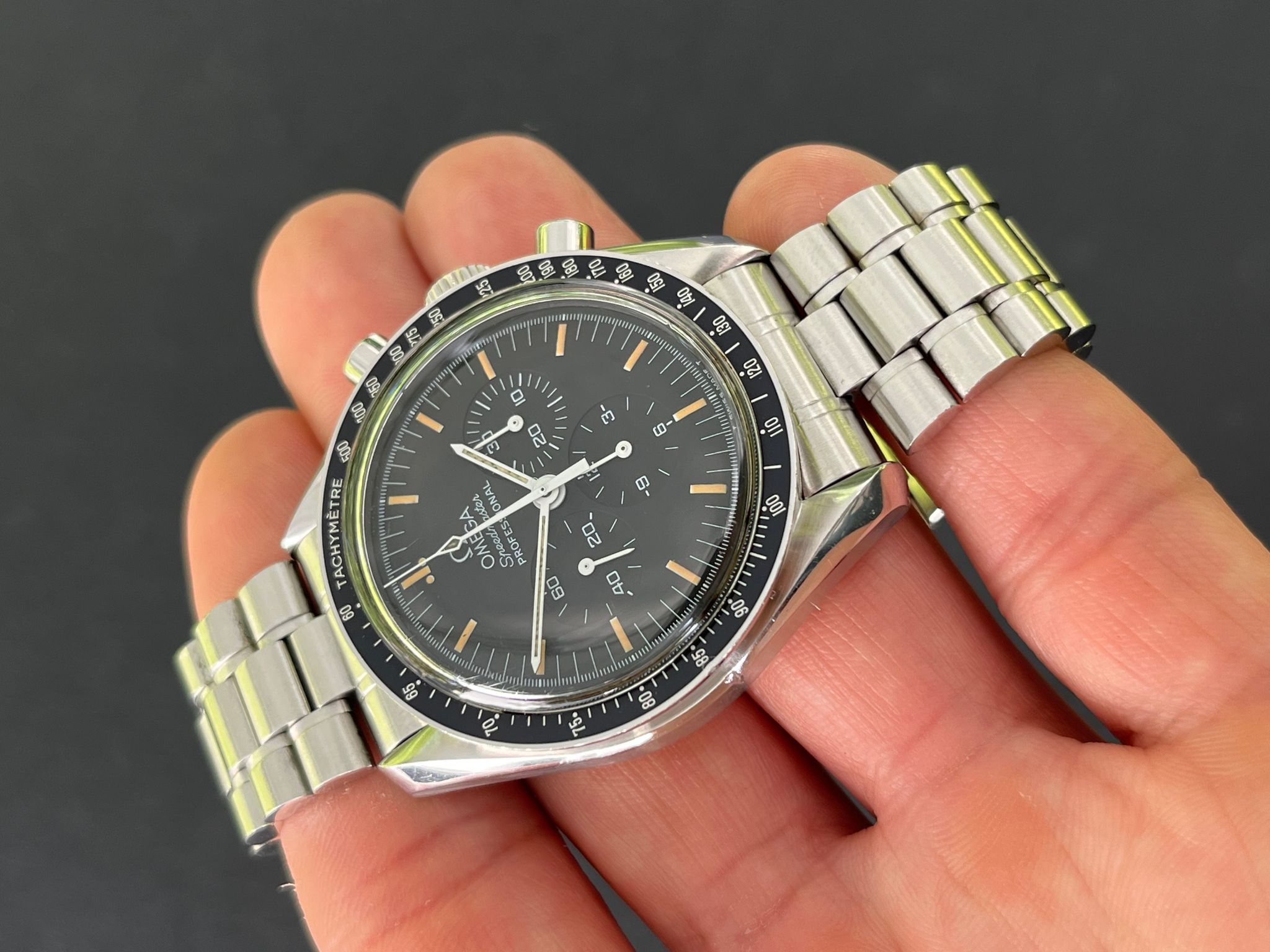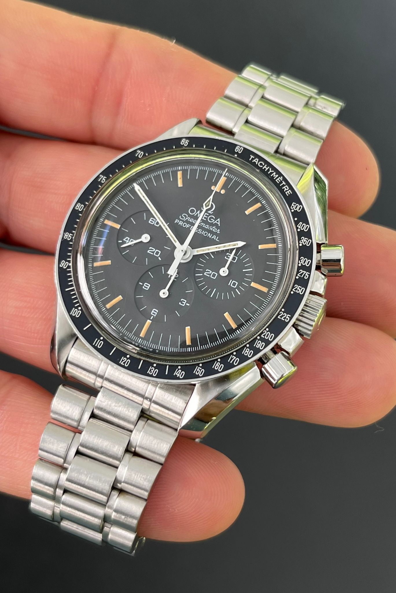 The Omega Speedmaster Professional Moonwatch reference 3570.50 is an iconic timepiece celebrated for its rich heritage and legendary status as the first watch worn on the moon. Featuring a sleek stainless steel case measuring 42mm in diameter, this chronograph is powered by the renowned manual-winding Caliber 861 movement, known for its reliability and precision. With its classic black dial adorned with tritium hands and matching pumpkin patina hour markers, along with its signature tachymeter bezel, the Speedmaster 3570.50 exudes timeless elegance and functionality. Renowned for its enduring design and association with NASA's space missions, this timepiece remains a symbol of innovation and adventure in horology.