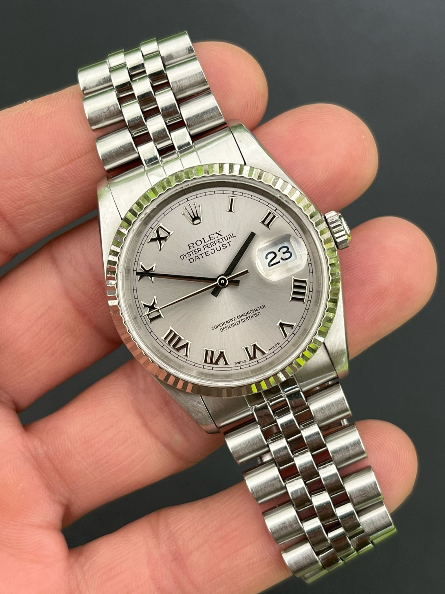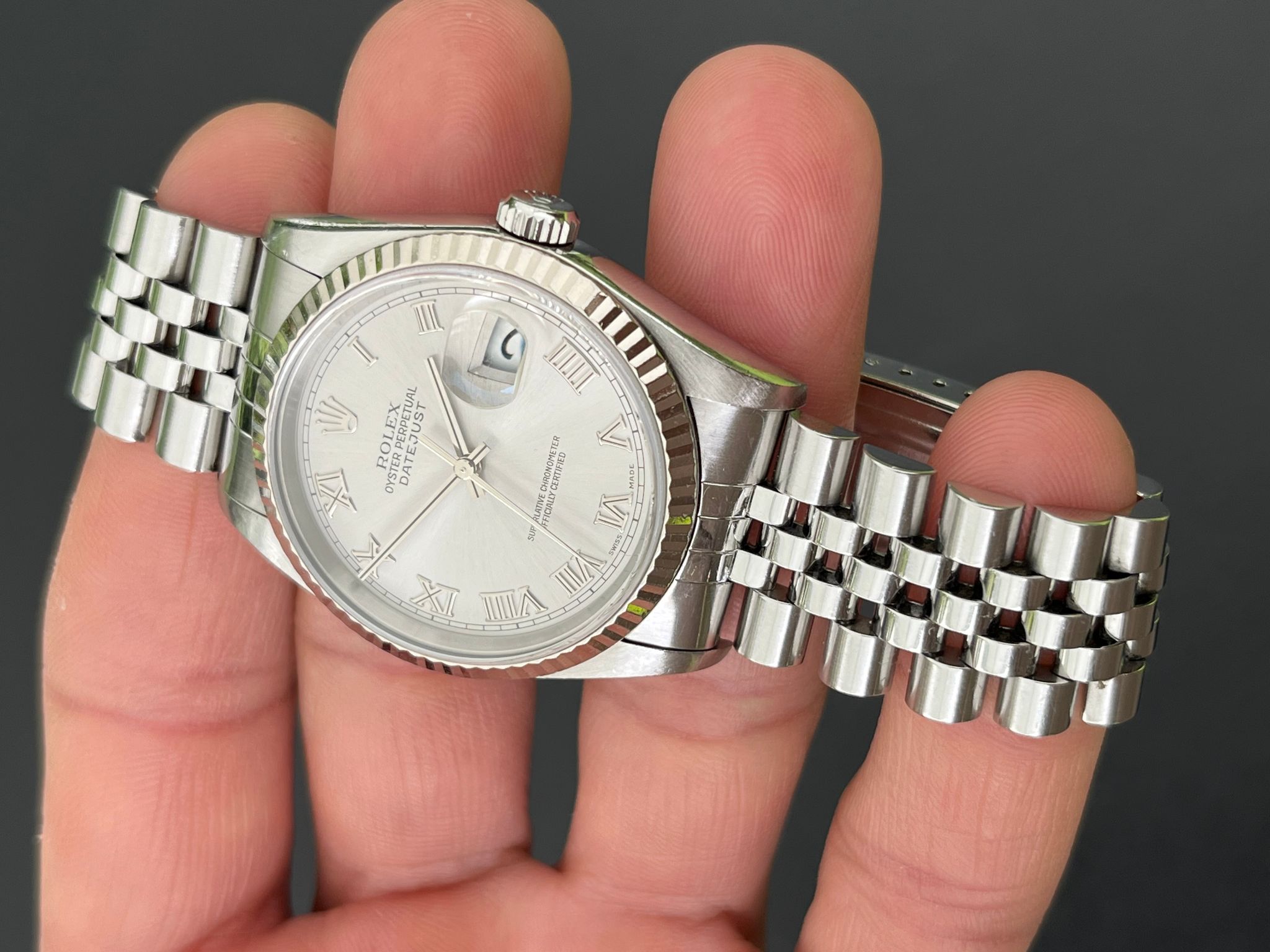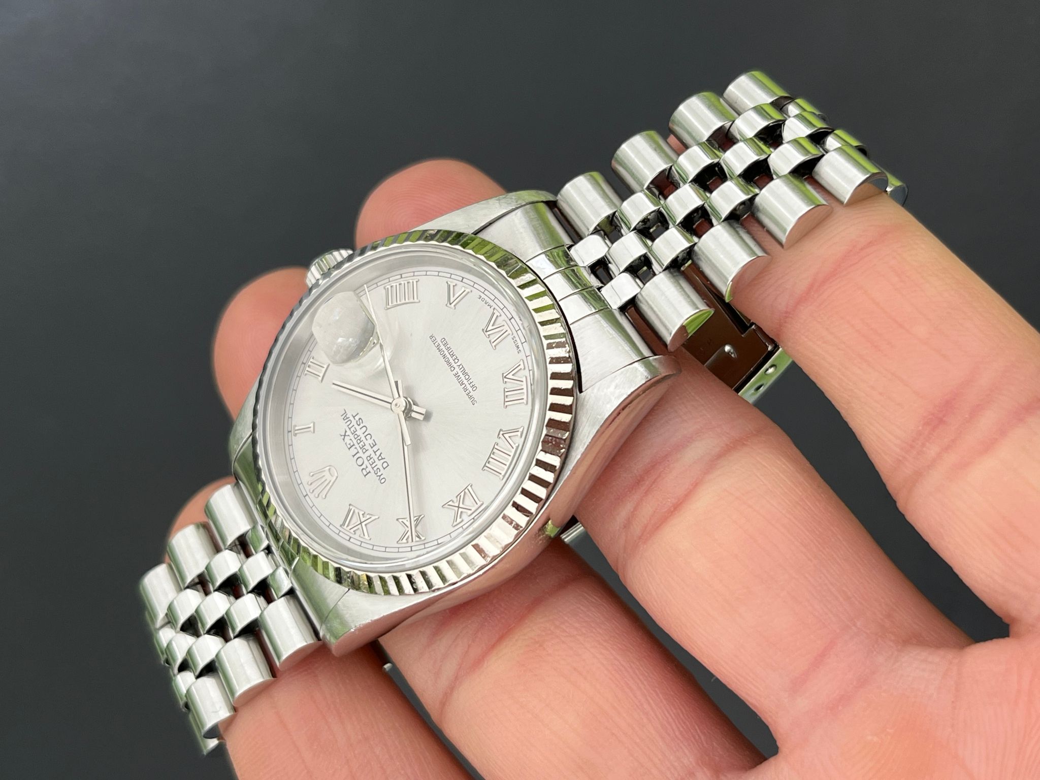 This Date Just showcases a Rhodium Roman dial featuring a date display, exemplifying Rolex's commitment to precision and enduring style. The no holes case is excellent and crisp. The Saphire crystal is free from wear partnered with its excellent white gold fluted bezel. The Grey rhodium Roman dial is excellent showing no visible wear. The bracelet is long and has 5 removable screws and is showing light stretch. Here is a nice example with a rare grey rhodium dial thats running COSC with Rolex Service Center documents dated 2/8/19