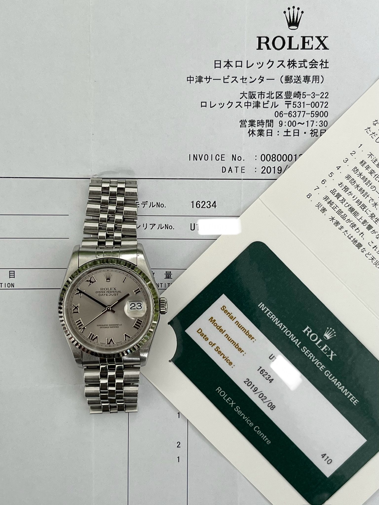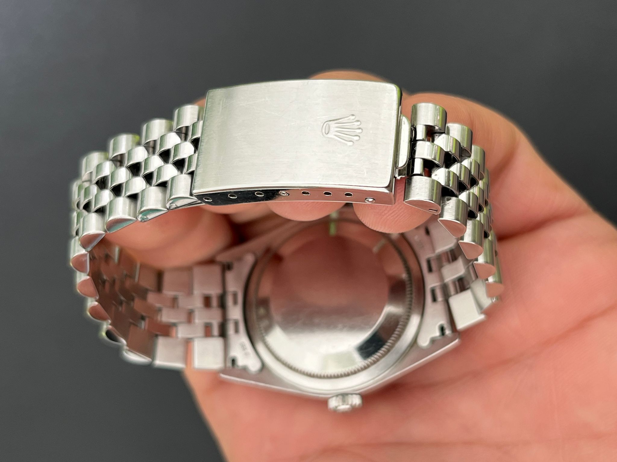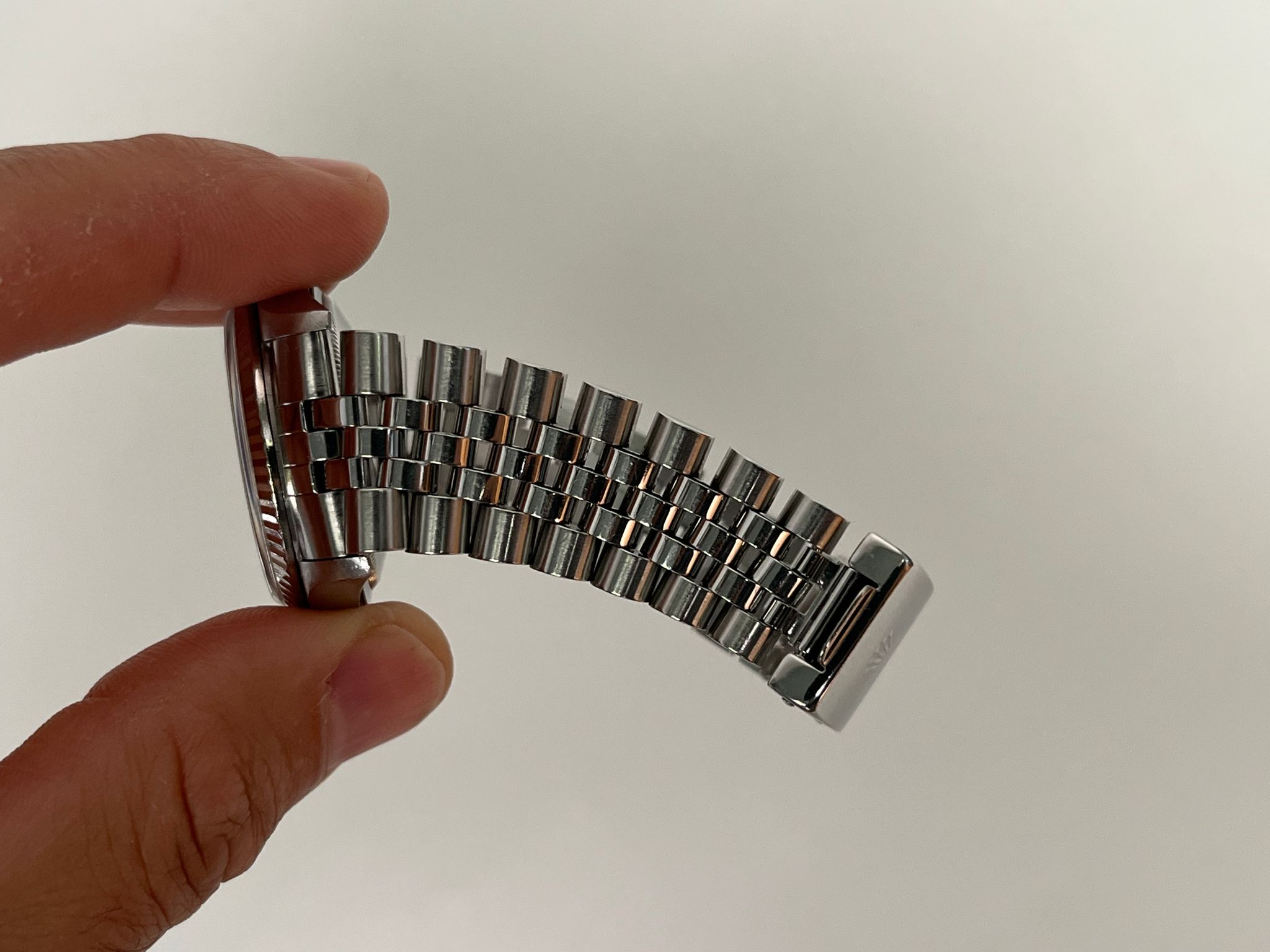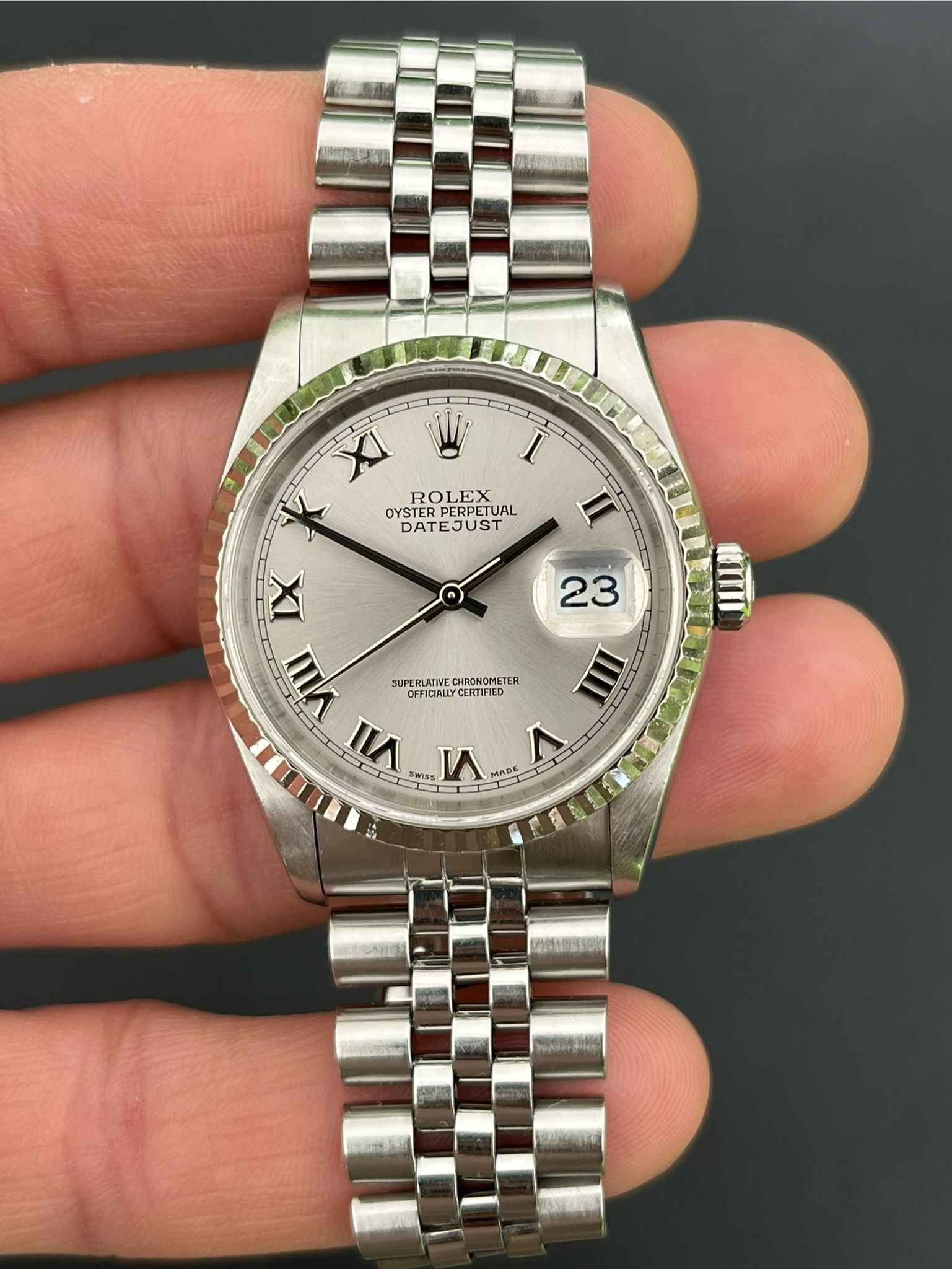 This Date Just showcases a Rhodium Roman dial featuring a date display, exemplifying Rolex's commitment to precision and enduring style. The no holes case is excellent and crisp. The Saphire crystal is free from wear partnered with its excellent white gold fluted bezel. The Grey rhodium Roman dial is excellent showing no visible wear. The bracelet is long and has 5 removable screws and is showing light stretch. Here is a nice example with a rare grey rhodium dial thats running COSC with Rolex Service Center documents dated 2/8/19