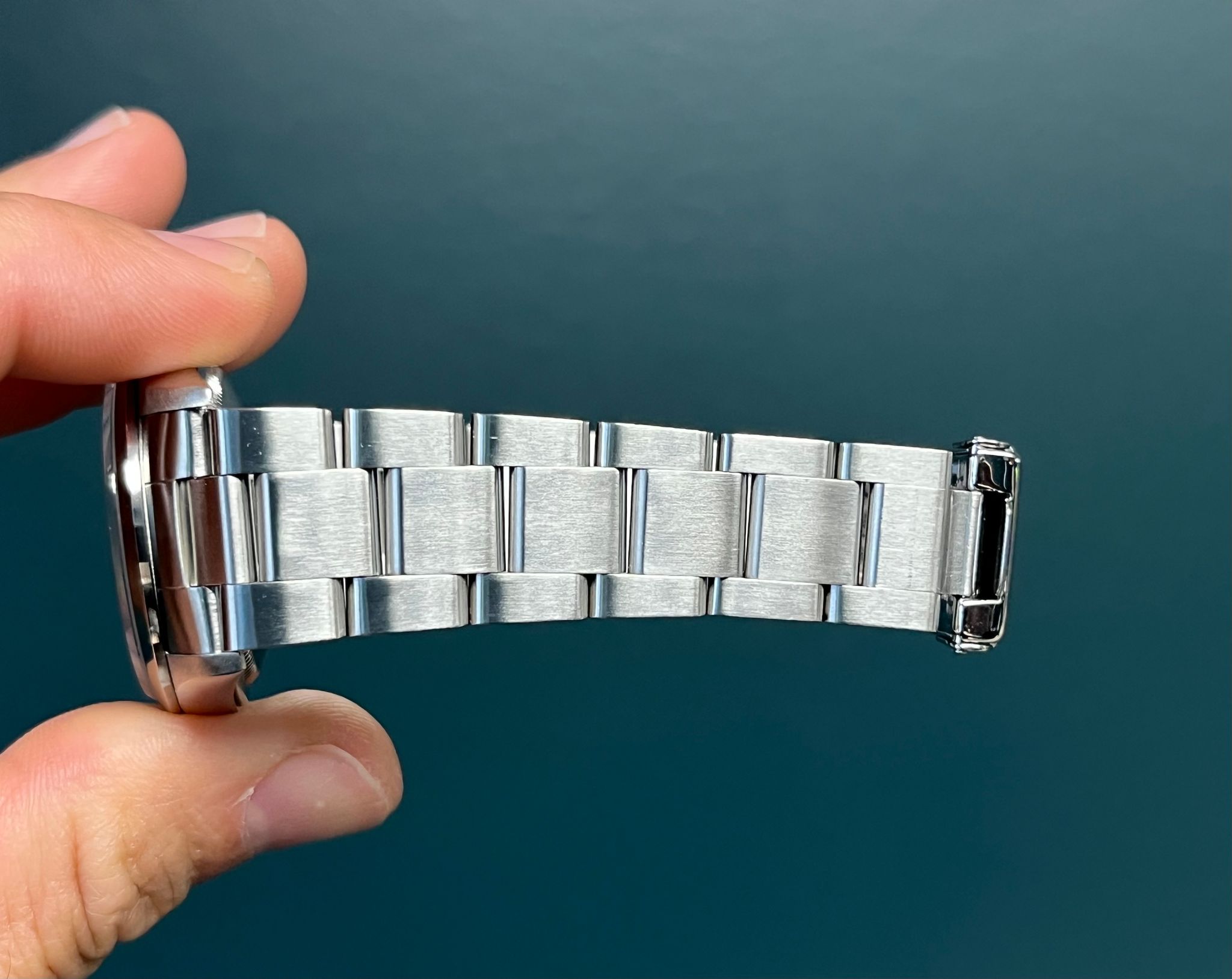 Today's example comes to us watch only and is in excellent condition. The no holes case is sharp and crisp. The dial is mint with matching hands. The bracelet has 12 total links and shows no stretch. Here is an excellent example that is retail ready to go!