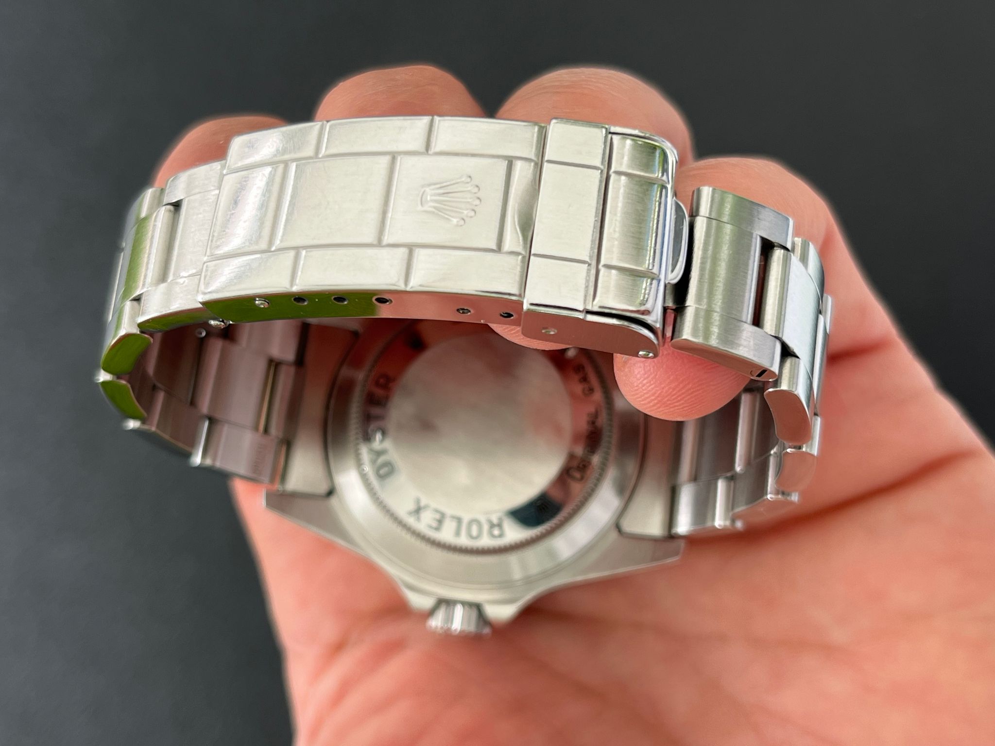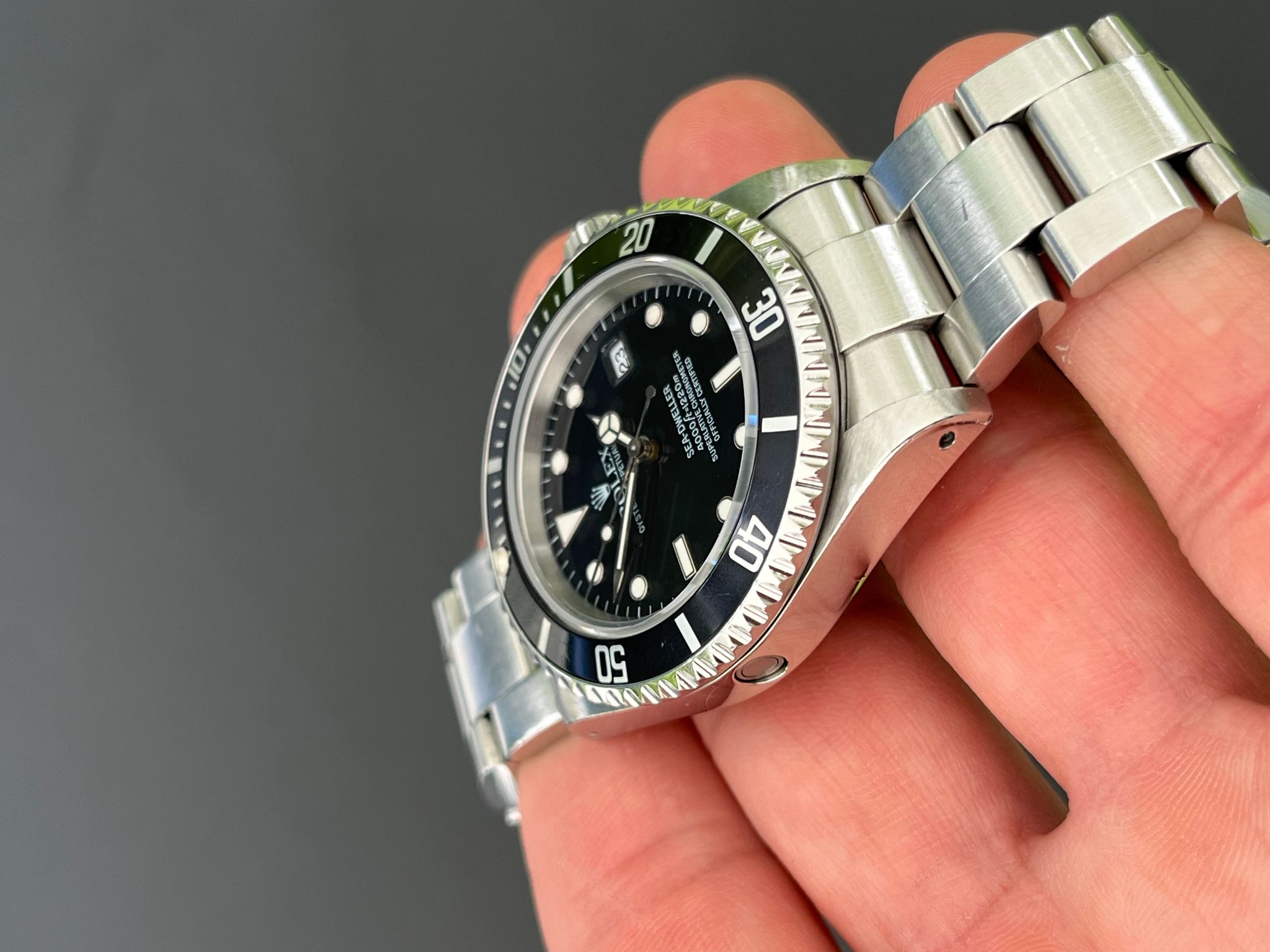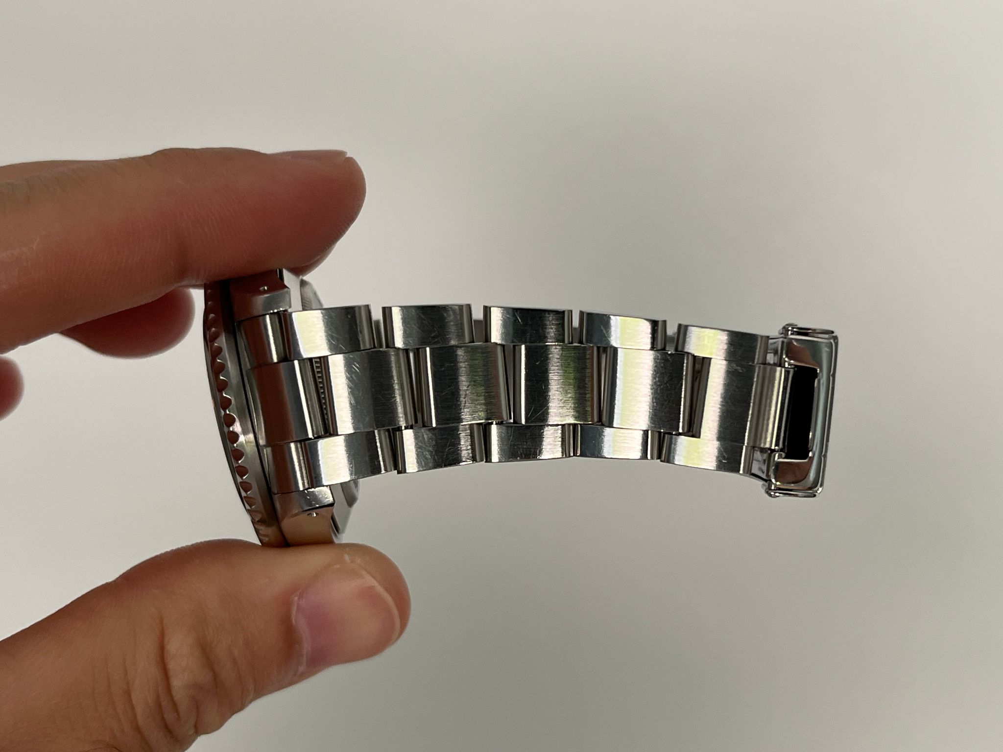Today's example comes to us with an excellent preowned condition. The case is excellent showing sharp chamfers. The Solid End Link Bracelet has 12 total links plus diver extionsion and shows very minimal stretch. The dial has nice all matching cream patina and is in excellent condition. This example comes with its original punched papers dated 7/97.