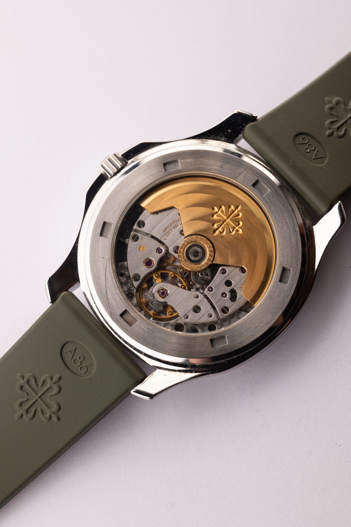 Description: The tritium lume 5065A differs from its later siblings as it has a beautiful yellowing of the patina that only tritium provides. The case and dial are in excellent shape and it comes on a green rubber strap from Patek that fits a 7.4″ wrist