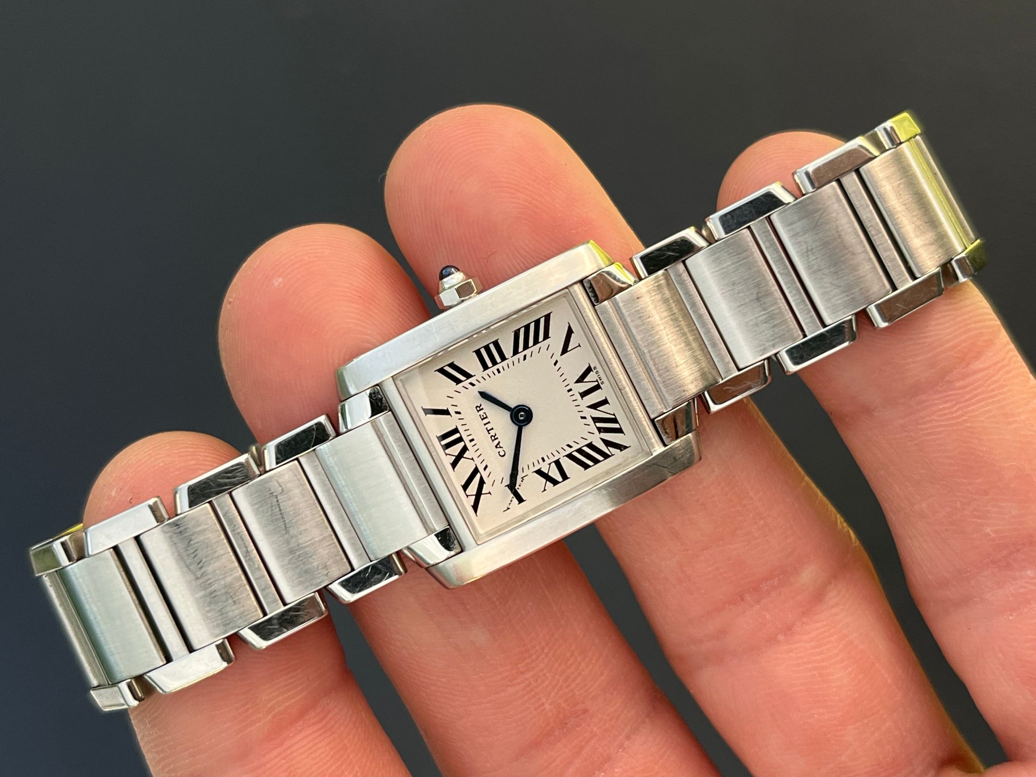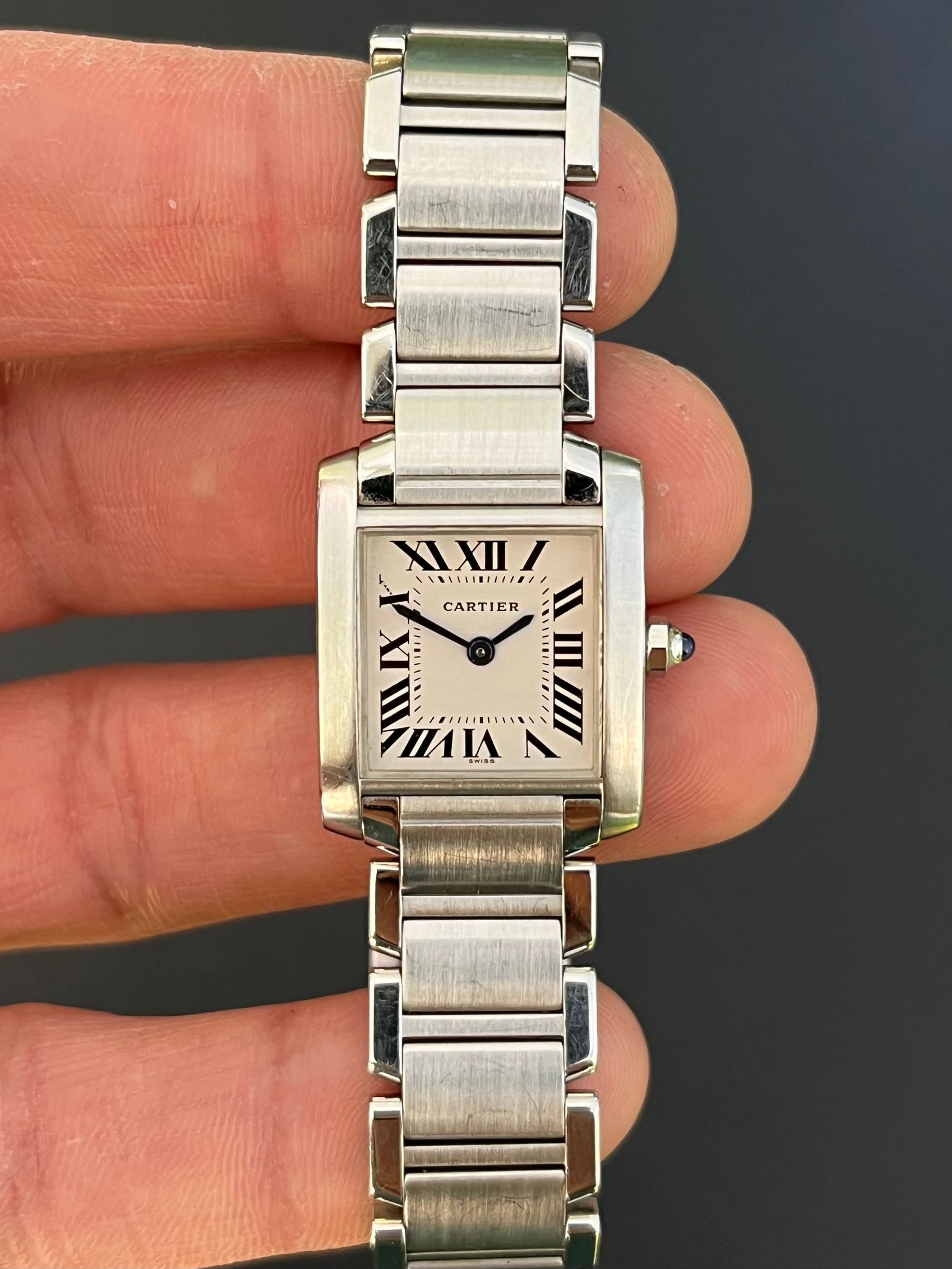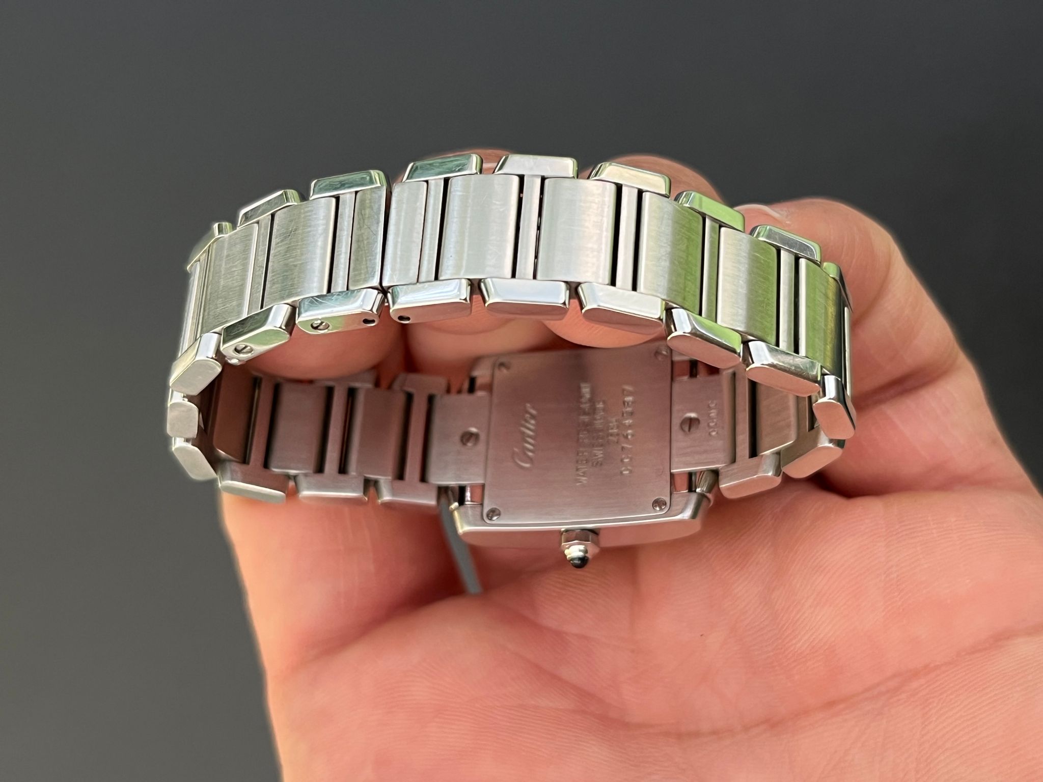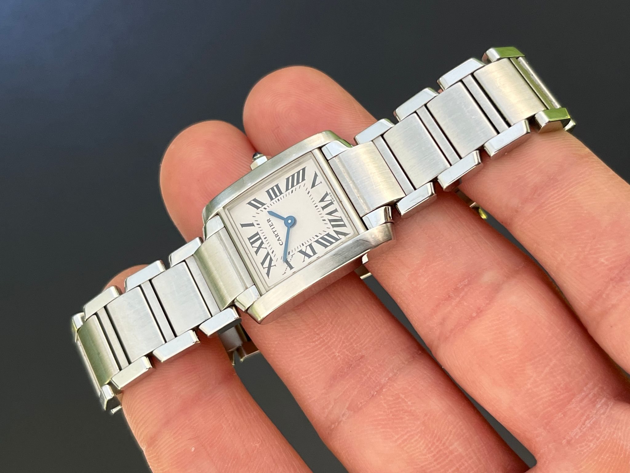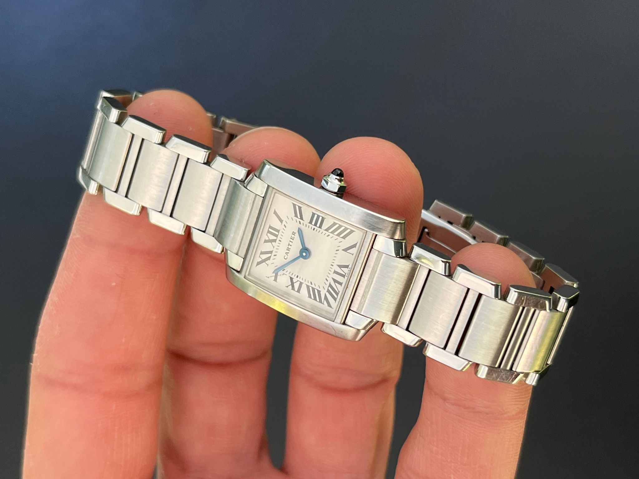 The Cartier Tank Française Reference 2384 (W51008Q3) is a timeless symbol of elegance and sophistication, presented here with its original papers. This exquisite timepiece features a stainless steel case with the iconic rectangular shape that defines the Tank collection, exuding both classic charm and modern refinement. The silvered opaline dial is adorned with bold Roman numerals and blued steel sword-shaped hands, embodying Cartier's signature aesthetic. Powered by a precise quartz movement, the watch ensures reliable accuracy and hassle-free maintenance. The polished stainless steel bracelet offers a seamless integration with the case, enhancing its sleek design. The Cartier Tank Française Reference 2384 is a true masterpiece, reflecting the brand's enduring legacy of luxury and craftsmanship.