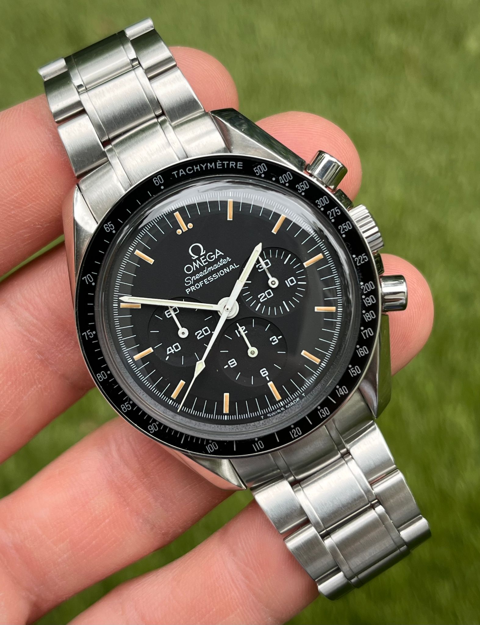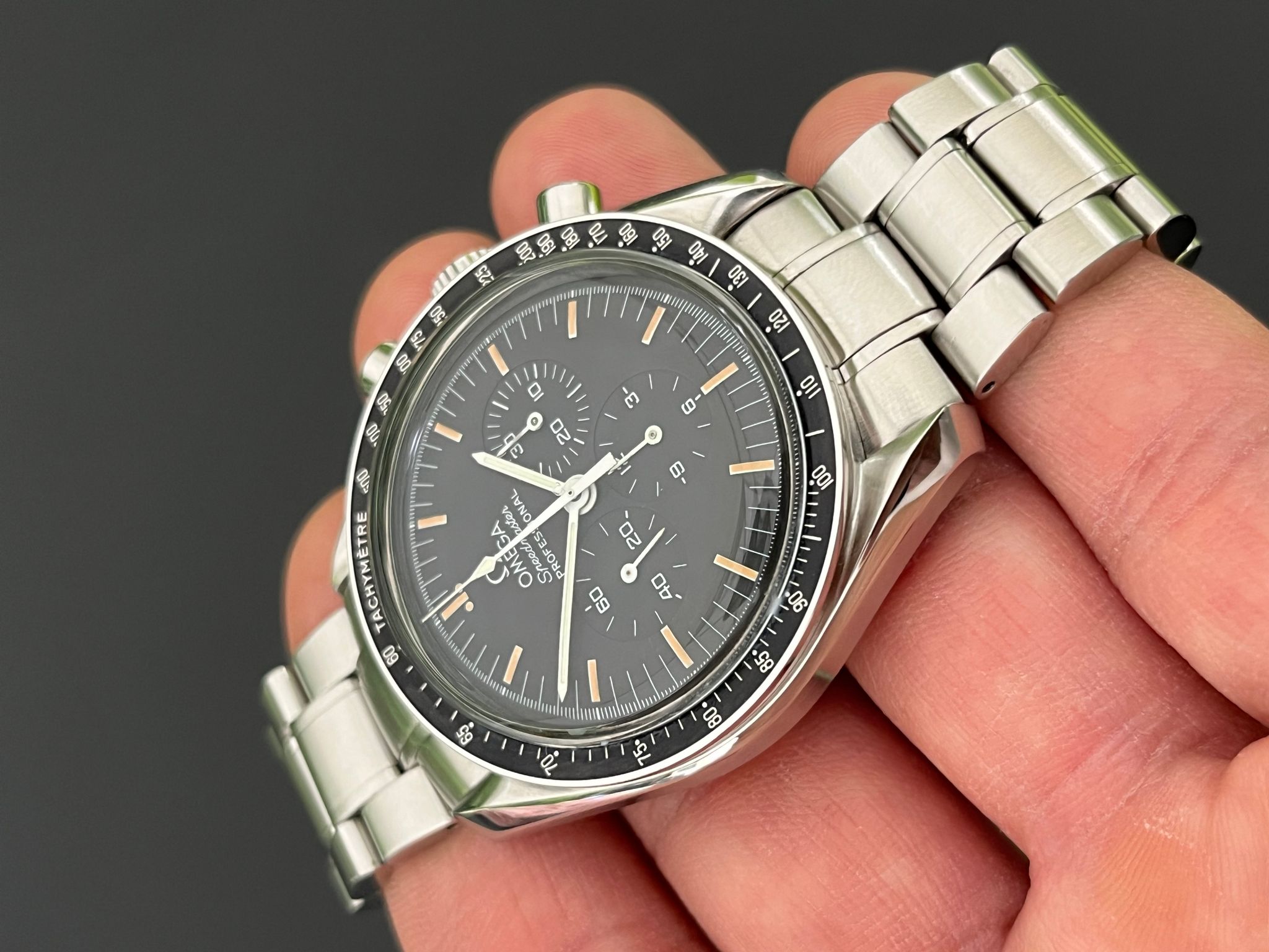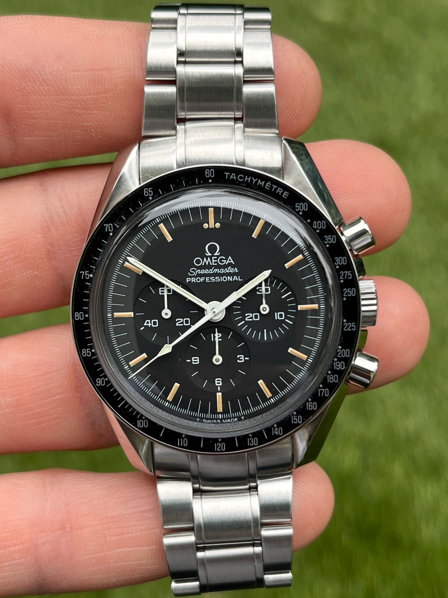 The Omega Speedmaster Professional Moonwatch reference 3570.50 is an iconic timepiece celebrated for its rich heritage and legendary status as the first watch worn on the moon. Featuring a sleek stainless steel case measuring 42mm in diameter, this chronograph is powered by the renowned manual-winding Caliber 861 movement, known for its reliability and precision. With its classic black dial adorned with luminous hands and matching yellow patina hour markers, along with its signature tachymeter bezel, the Speedmaster 3570.50 exudes timeless elegance and functionality. Renowned for its enduring design and association with NASA's space missions, this timepiece remains a symbol of innovation and adventure in horology.