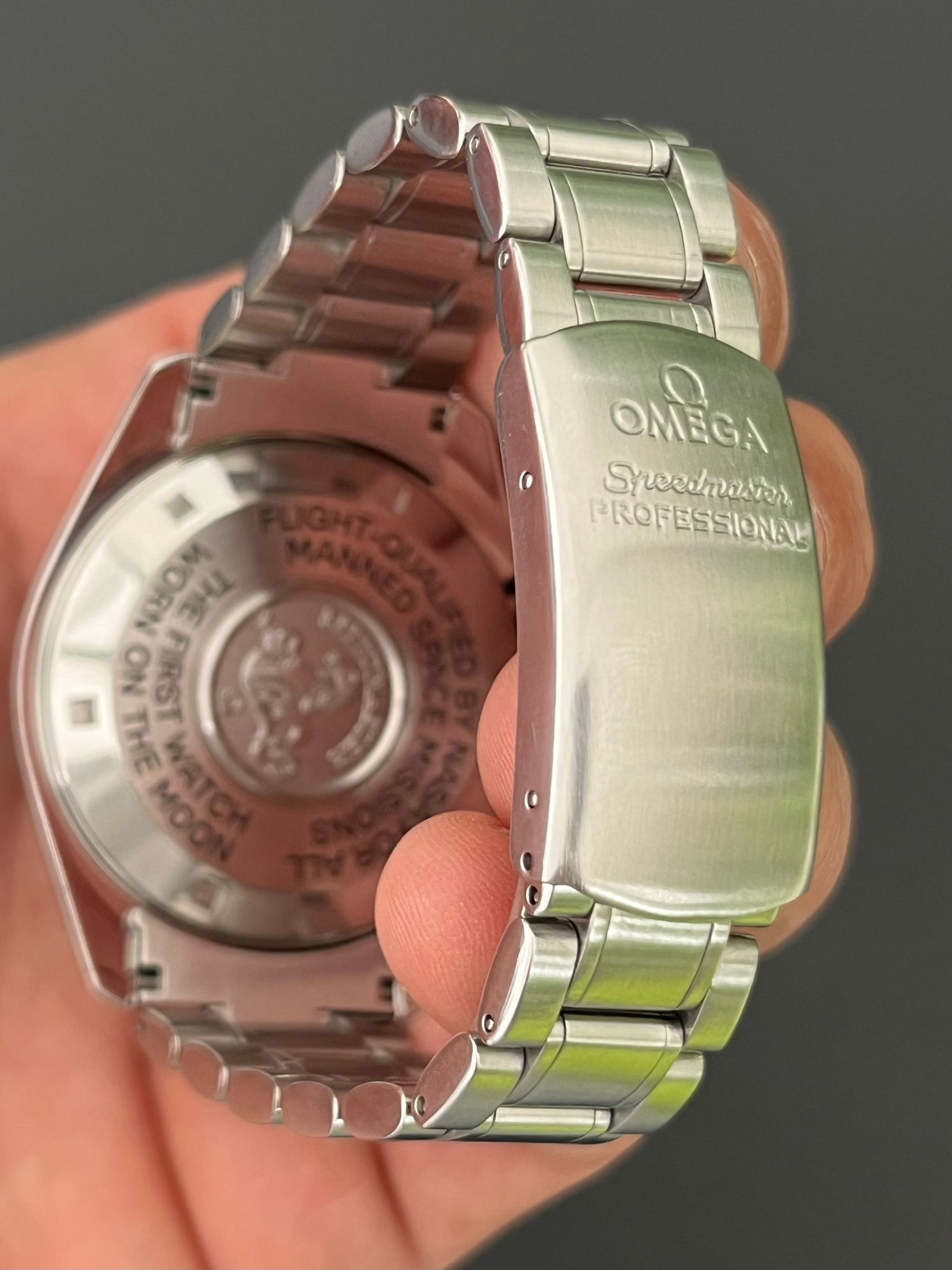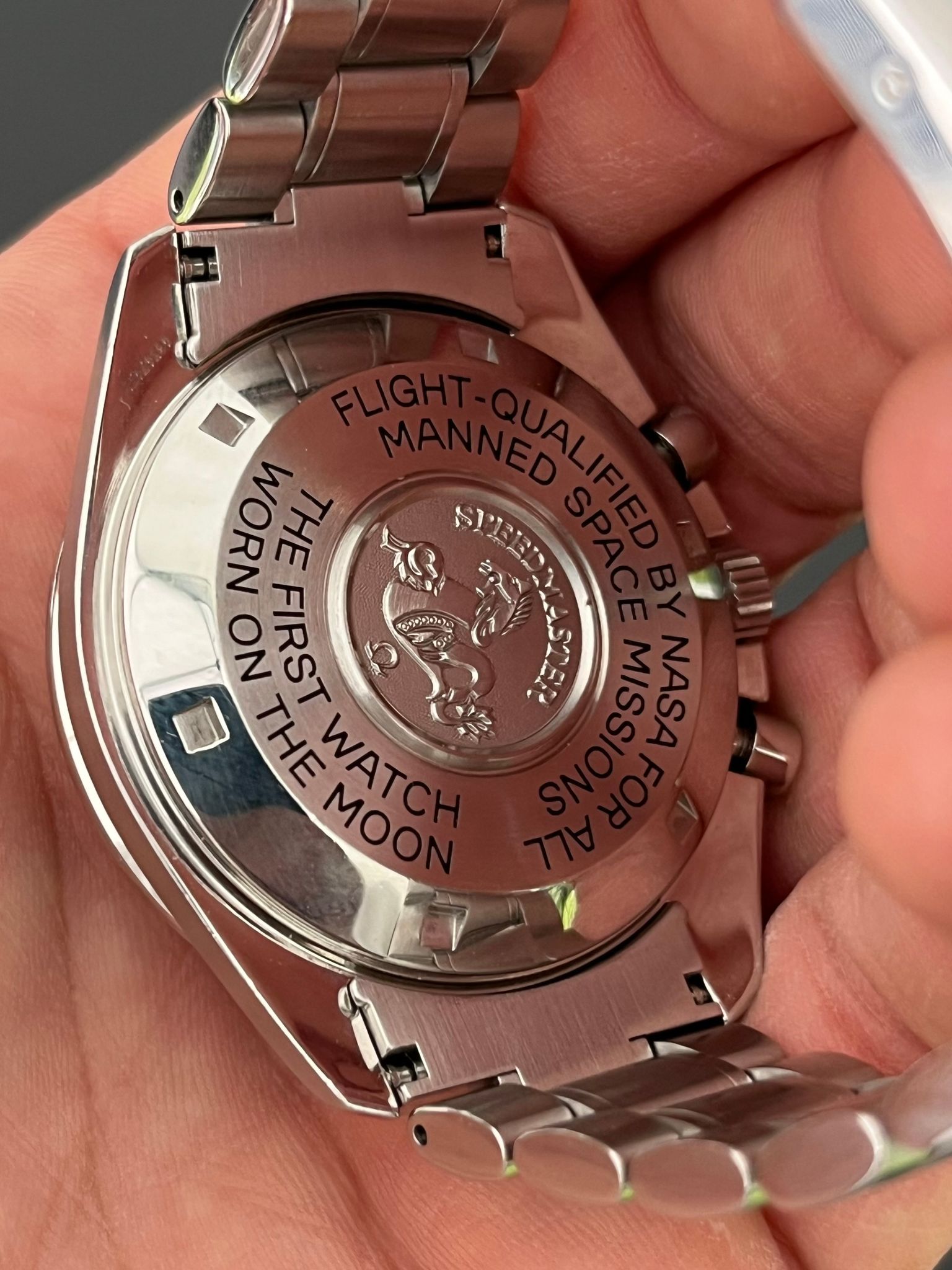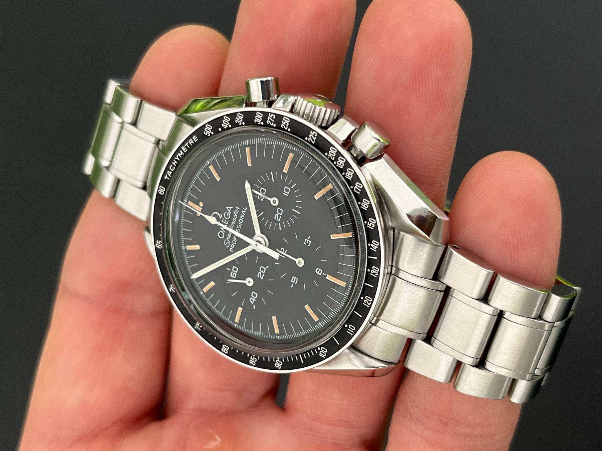 The Omega Speedmaster Professional Moonwatch reference 3570.50 is an iconic timepiece celebrated for its rich heritage and legendary status as the first watch worn on the moon. Featuring a sleek stainless steel case measuring 42mm in diameter, this chronograph is powered by the renowned manual-winding Caliber 861 movement, known for its reliability and precision. With its classic black dial adorned with luminous hands and matching yellow patina hour markers, along with its signature tachymeter bezel, the Speedmaster 3570.50 exudes timeless elegance and functionality. Renowned for its enduring design and association with NASA's space missions, this timepiece remains a symbol of innovation and adventure in horology.
