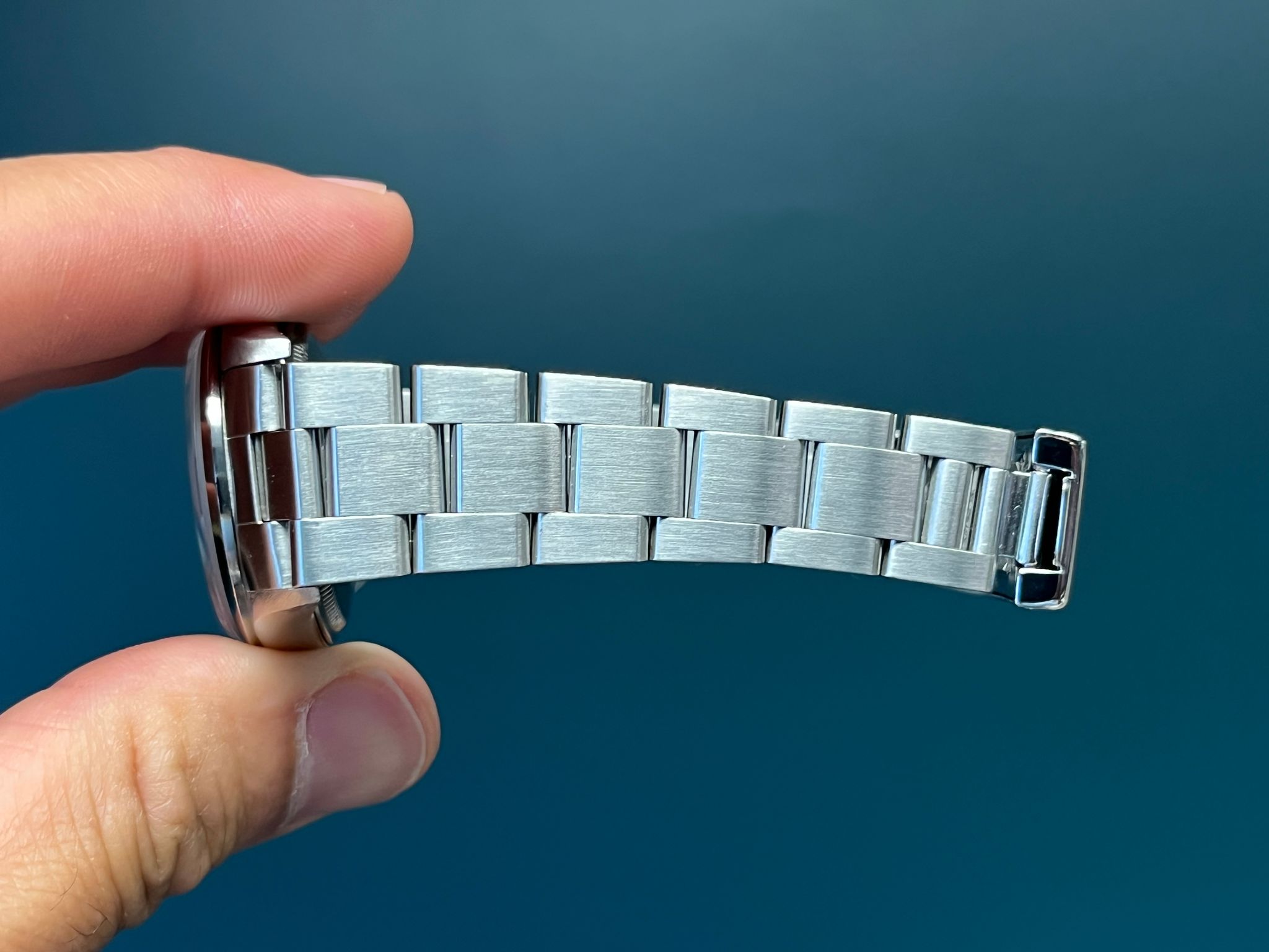 Today's example comes to us in excellent pre-owned condition. The no holes case is sharp and crisp. The black stick dial is mint and shows no visible wear. The bracelet has 12 total links and shows no stretch. The case back sticker is fully intact. Just an excellent example at the right price!