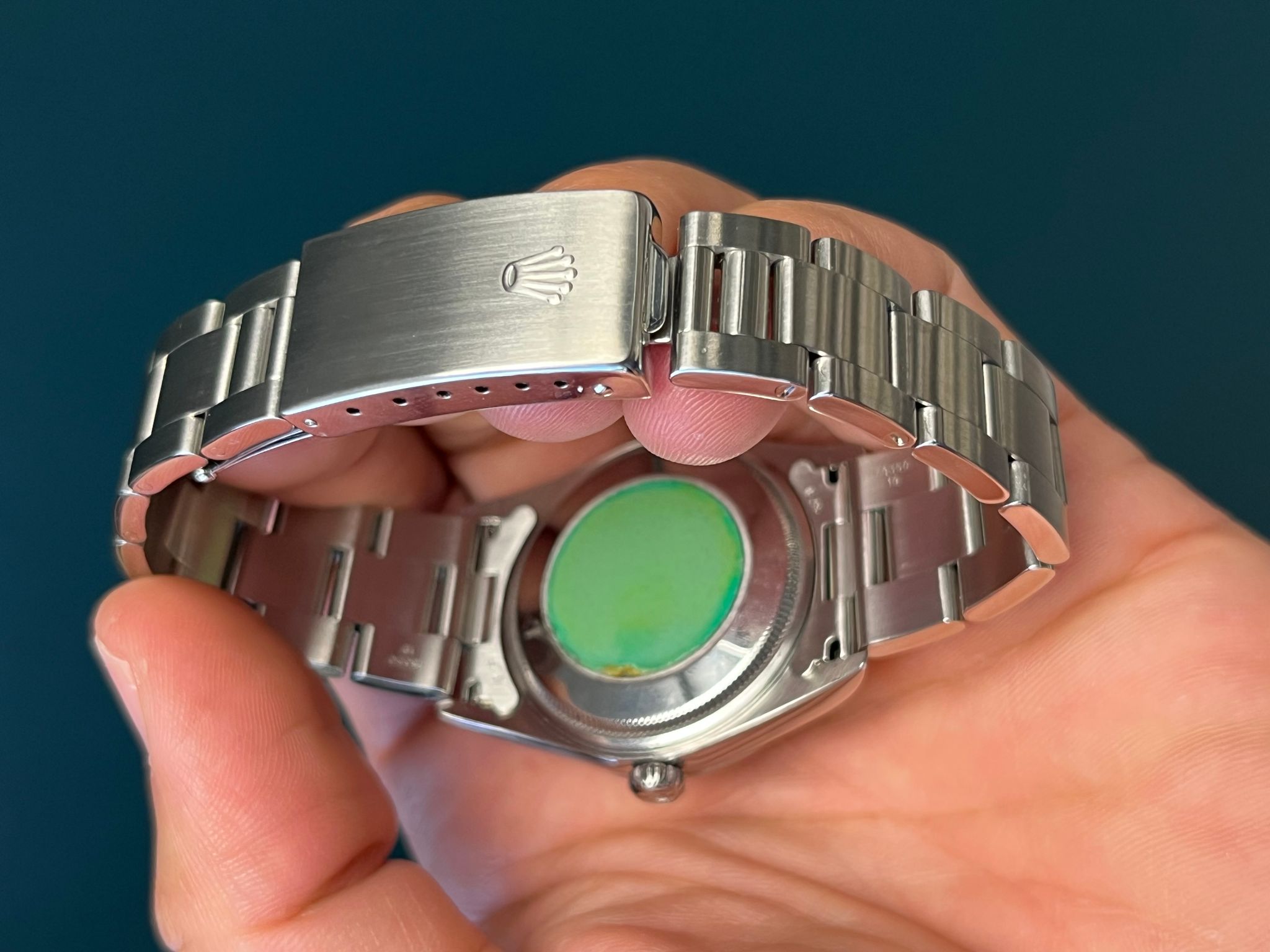 The Rolex Oyster Perpetual Air-King Reference 14000 with a black stick Dial is a stunning example of Rolex's commitment to timeless elegance and superior craftsmanship. This exquisite timepiece features a 34mm stainless steel case, perfectly balanced for both comfort and style. The sharp black stick dial adds a touch of sophistication, beautifully contrasted by the sleek, minimalist design and luminous hour markers. The smooth bezel and classic Oyster bracelet enhance its refined aesthetic, making it suitable for any occasion. This particular model, with its rare and captivating black salmon dial, stands out as a distinctive and highly sought-after addition to any watch collection, embodying the perfect blend of tradition and modernity.