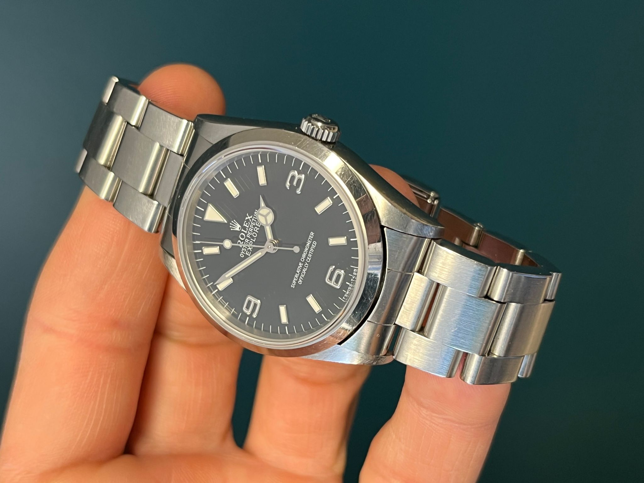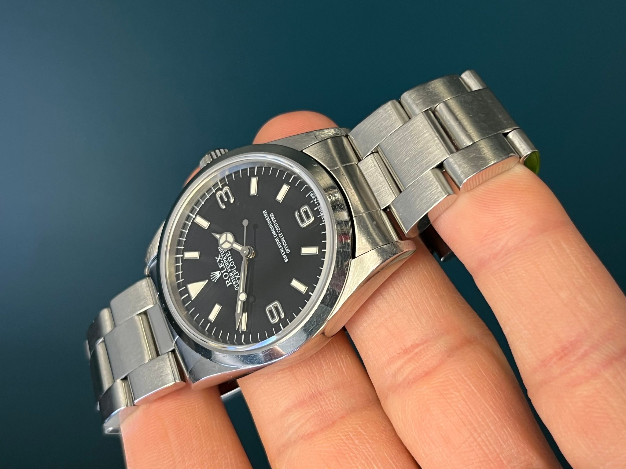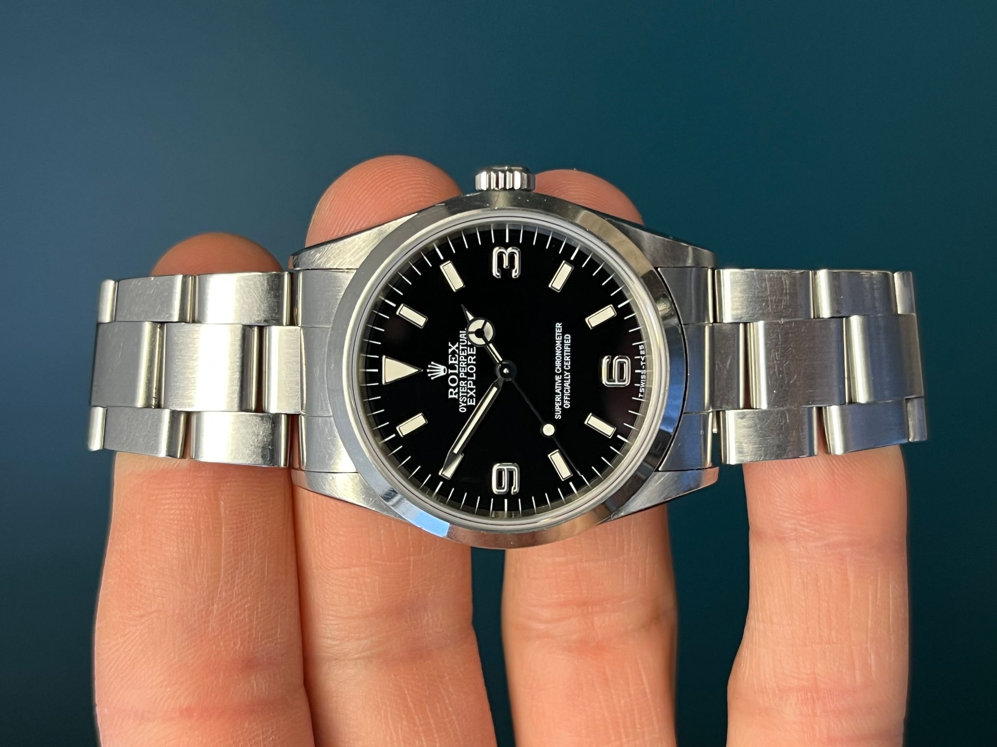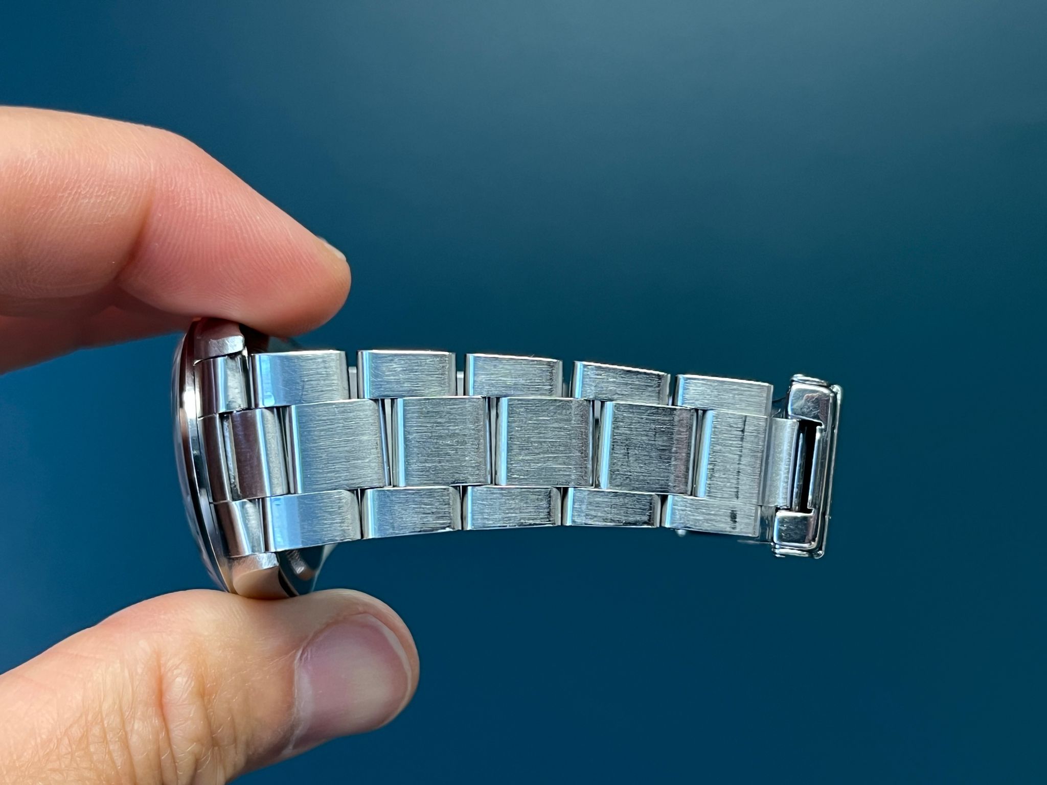 Today's example comes to us with its original box and papers dated 5/25/98 and is in very nice pre owned condition. The no holes case is sharp and crisp. The dial is mint with matching cream patina and matching hands. The bracelet has 12 total links and shows no stretch. Here is an excellent example that is retail ready to go!