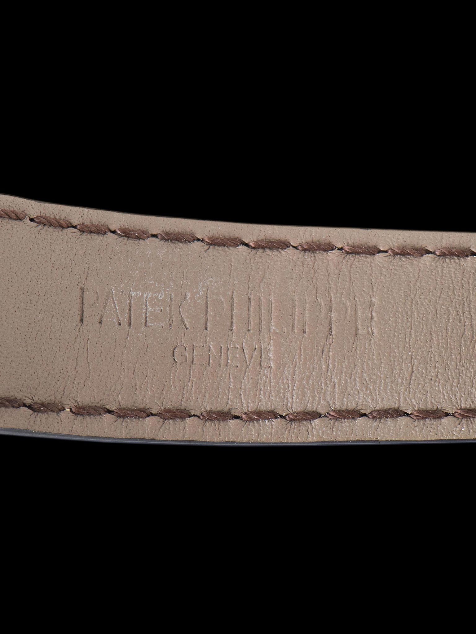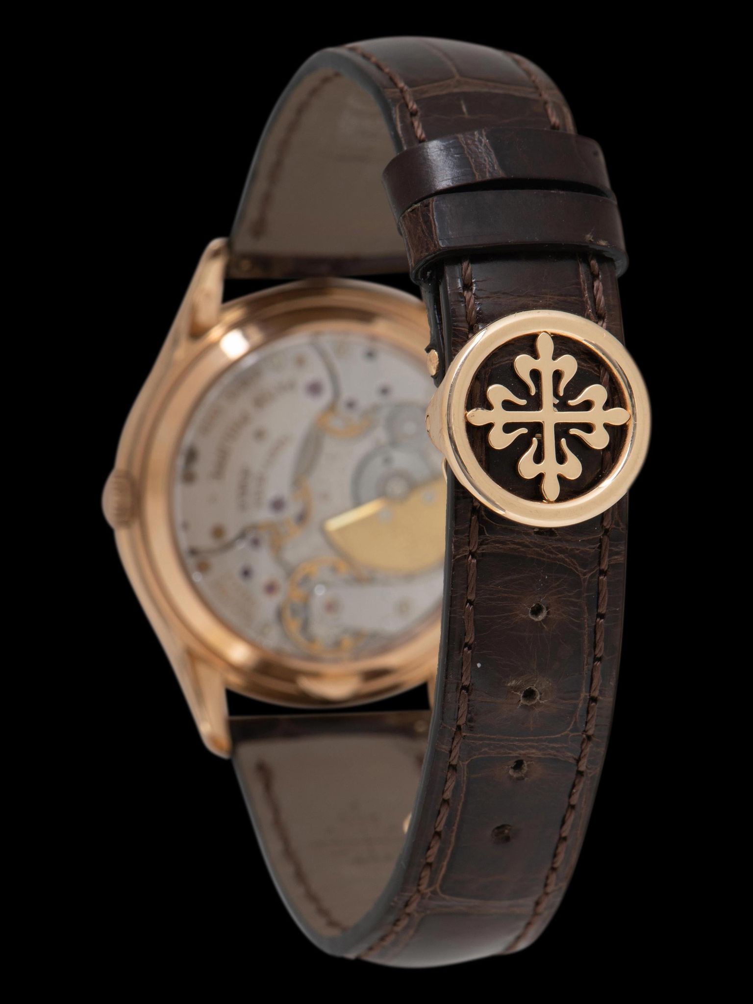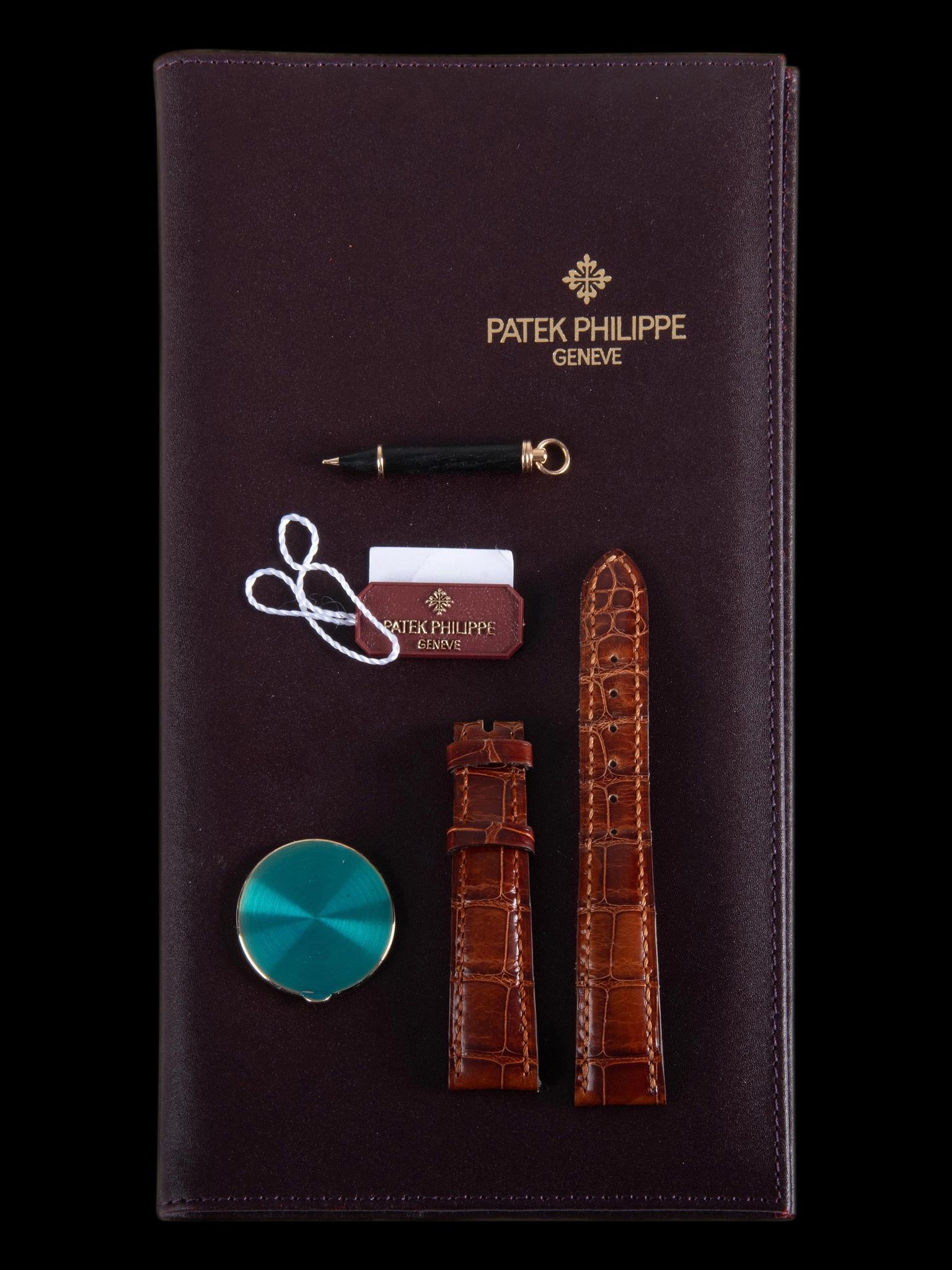 The watch is a complete set featuring its original outer box, inner watch winder box, certificate of origin, setting pusher, additional solid 18K rose gold case back, and booklets. The hang tag is also original, but no longer features the serial numbers. The watch also comes with an additional Patek Philippe 2-piece tan alligator "cousu main" strap. The watch is keeping time and functioning perfectly, no service history is known.