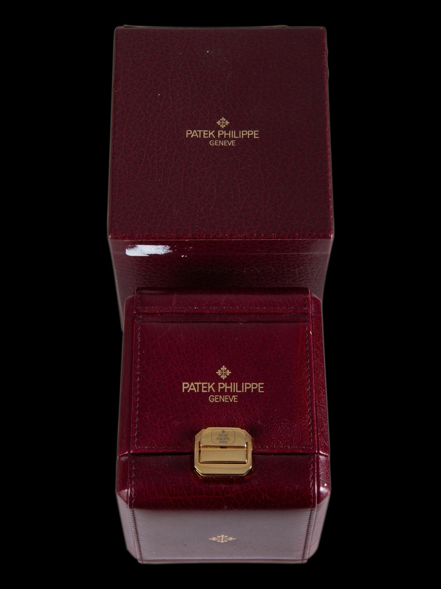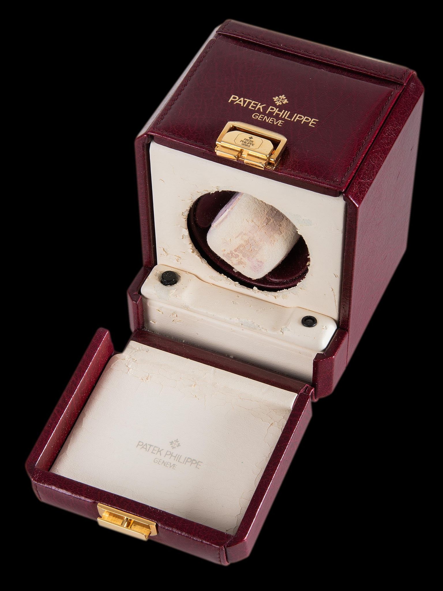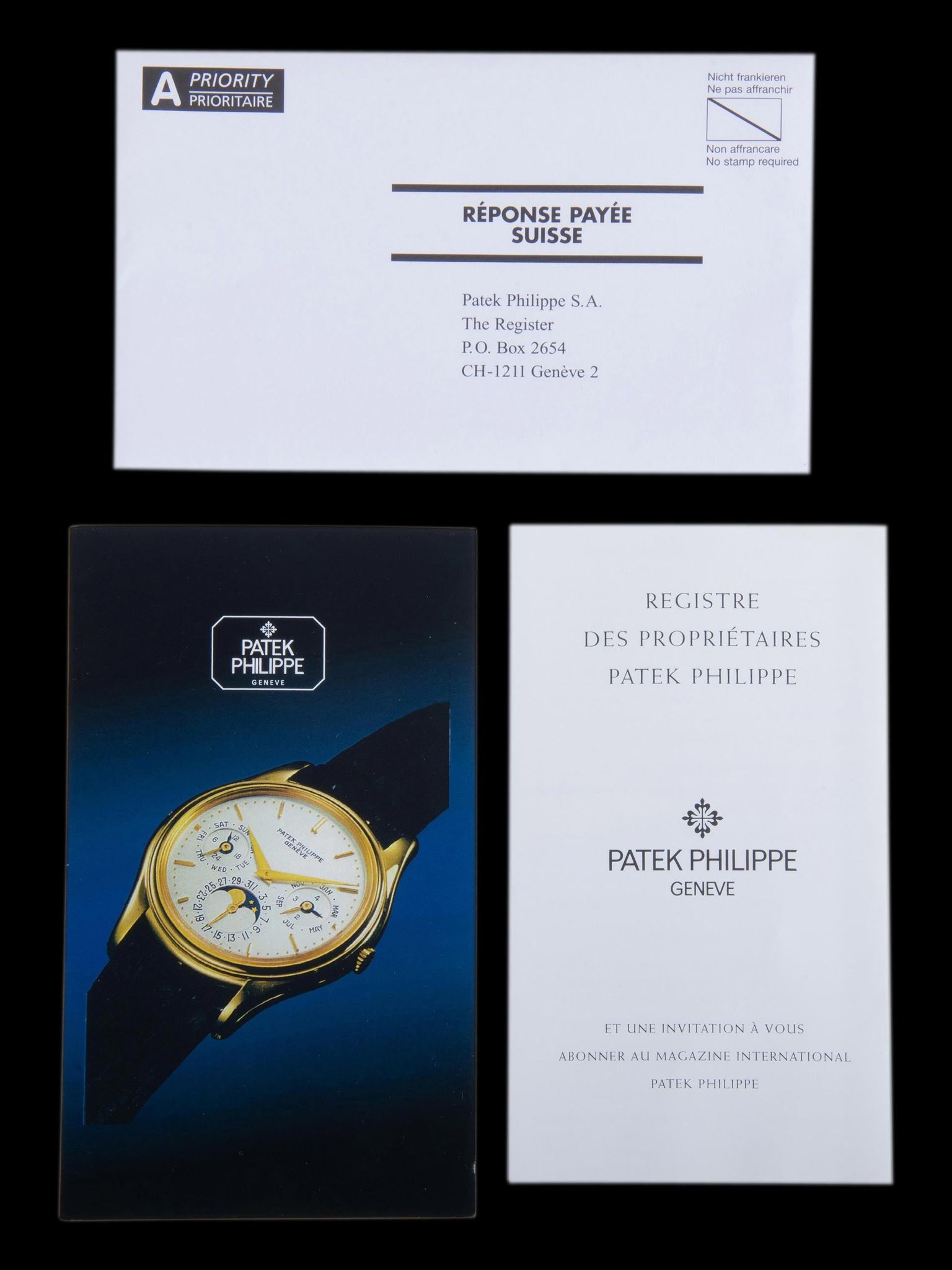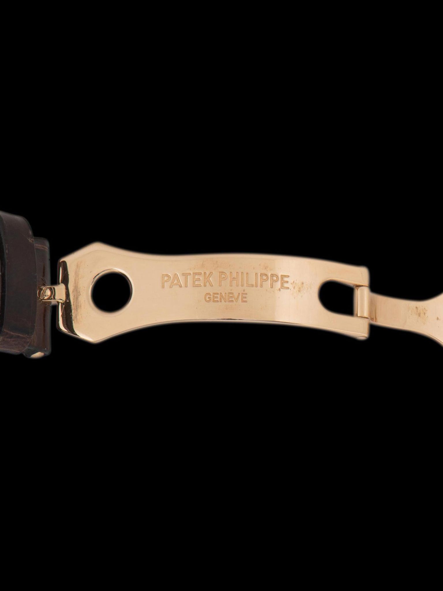 The watch is a complete set featuring its original outer box, inner watch winder box, certificate of origin, setting pusher, additional solid 18K rose gold case back, and booklets. The hang tag is also original, but no longer features the serial numbers. The watch also comes with an additional Patek Philippe 2-piece tan alligator "cousu main" strap. The watch is keeping time and functioning perfectly, no service history is known.