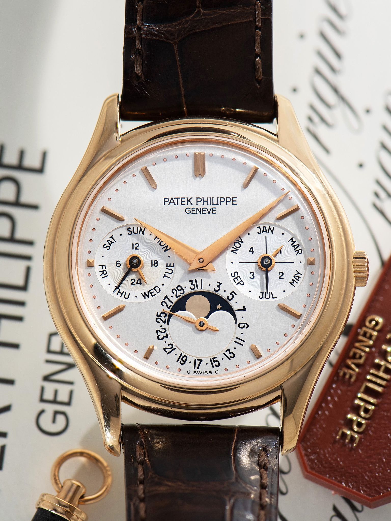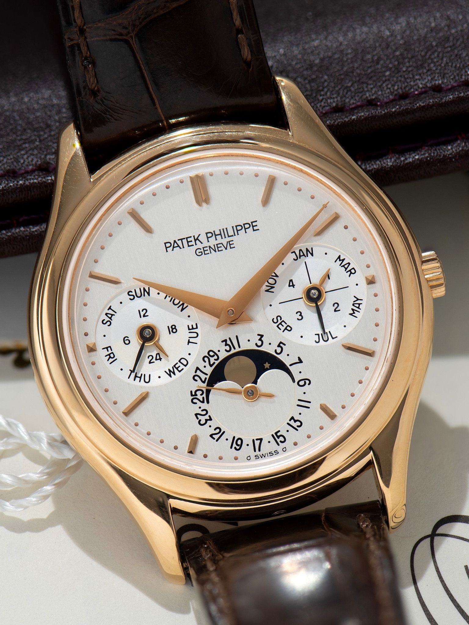 The Patek Philippe 3940 is generally broken down into three versions, or three series, across its illustrious 21 years of production from 1985-2007. Initially introduced only in solid yellow gold and with the very first 25 units being numbered and co-signed by retailer Beyer, rarified air is the most qualifying adjective for these, and shortly after the initial launch, Patek released models in white gold, platinum, and then later rose gold as well. The first series is highly regarded for being the original design, characterized by the "sunken sub-dials", but is far and beyond the most rare of the three series. It is well documented that only 700 pieces were produced in the first series during a short production run between 1985 and 1987. The second series saw the most substantial aesthetic change to the dial, though it is also decidedly appreciated for its classical beauty. This series is also broken into an early and late subdivision and was in production from 1987 to 1995. The third series is visually very similar to the second series, while airing on a slightly more modern aesthetic, Patek also introduced the caliber 240/114 in this series, and it was produced between 1995-2007. The Patek Philippe ref. 3940 was also re-released in the year 2015 with a white gold case and salmon dial for the brand's 175th-anniversary grand exhibition at the Saatchi Gallery in London.