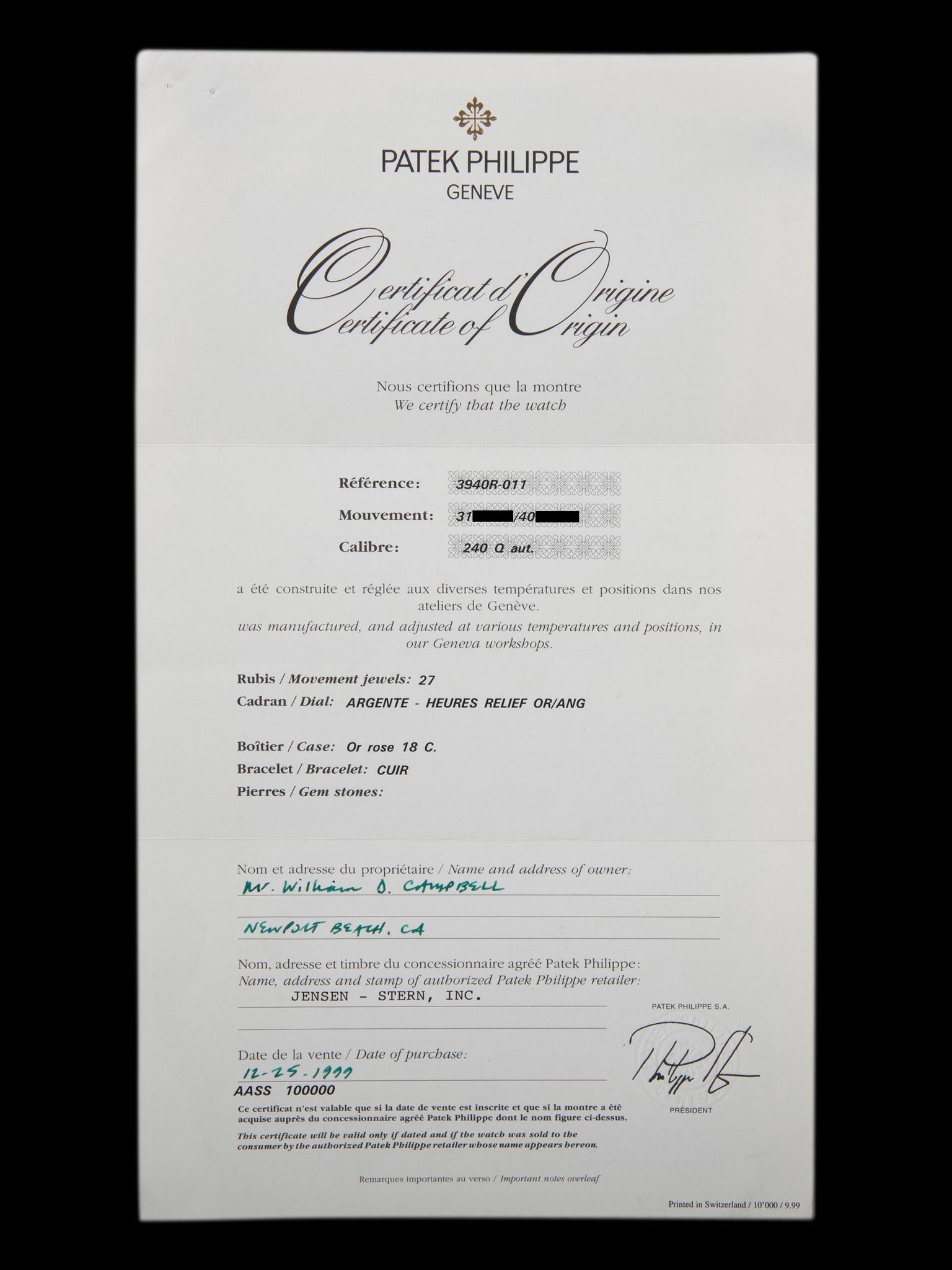 "3rd Series" 1999 Patek Philippe Perpetual Calendar Moonphase 18K RG (Ref. 3940R) W/ Winder Box, Papers, & Accessories