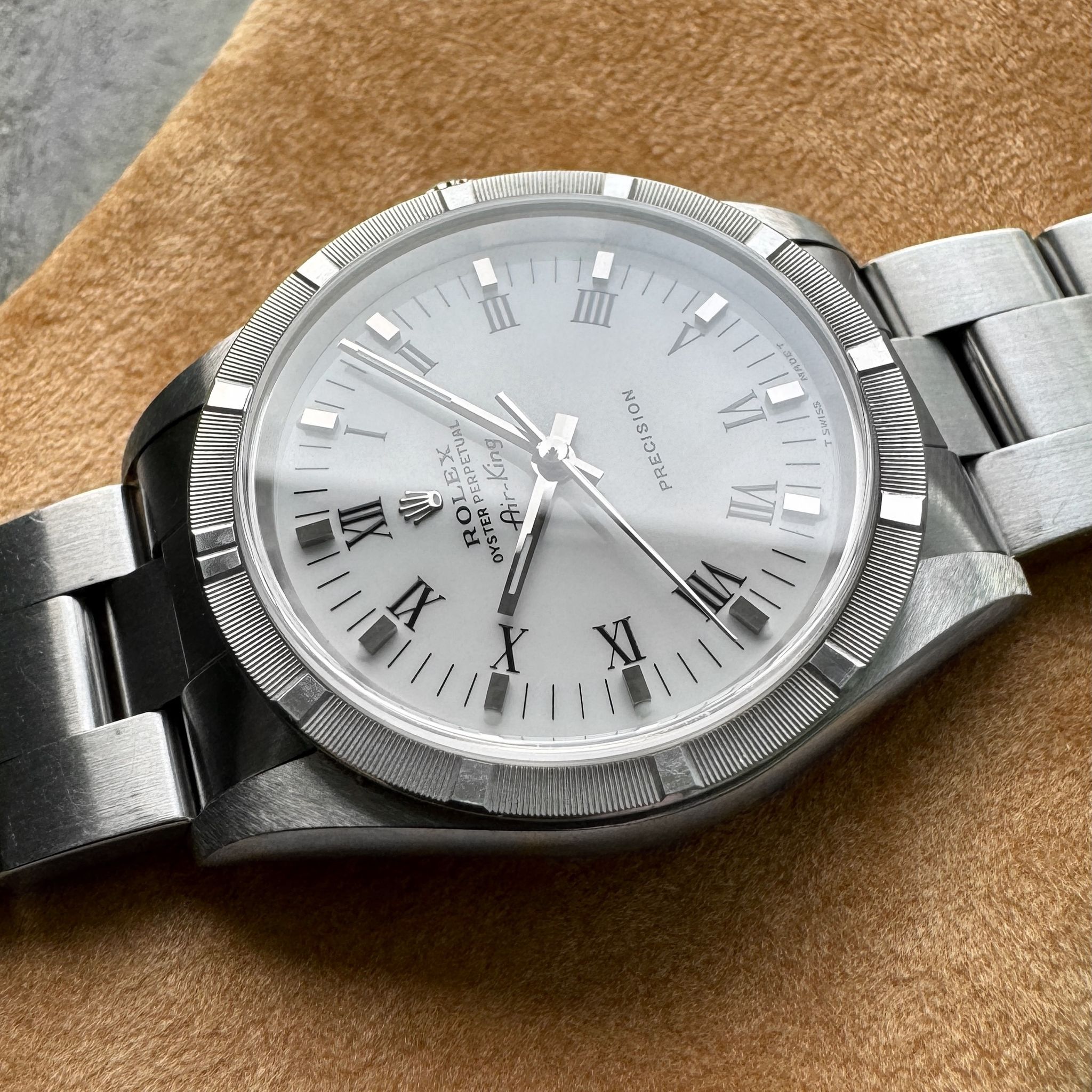 Experience the timeless allure of the classic Rolex Air King Date, a masterpiece that embodies the perfect blend of elegance and precision. This exquisite timepiece, reference 14010, is distinguished by its sophisticated white dial and meticulously crafted engine-turned bezel, offering a refined aesthetic that captivates on any occasion. The Rolex Date is renowned for its understated luxury and reliability, making it an essential addition to any watch collection.