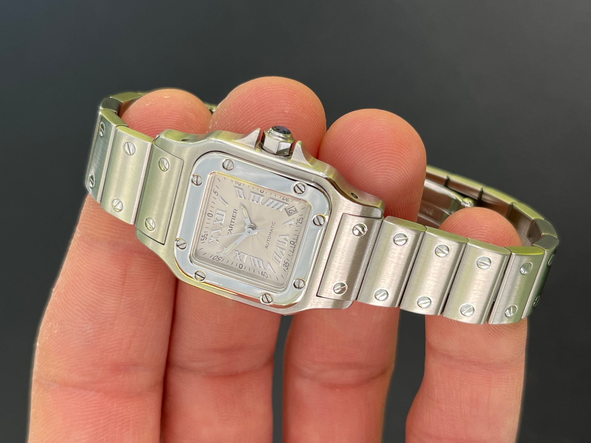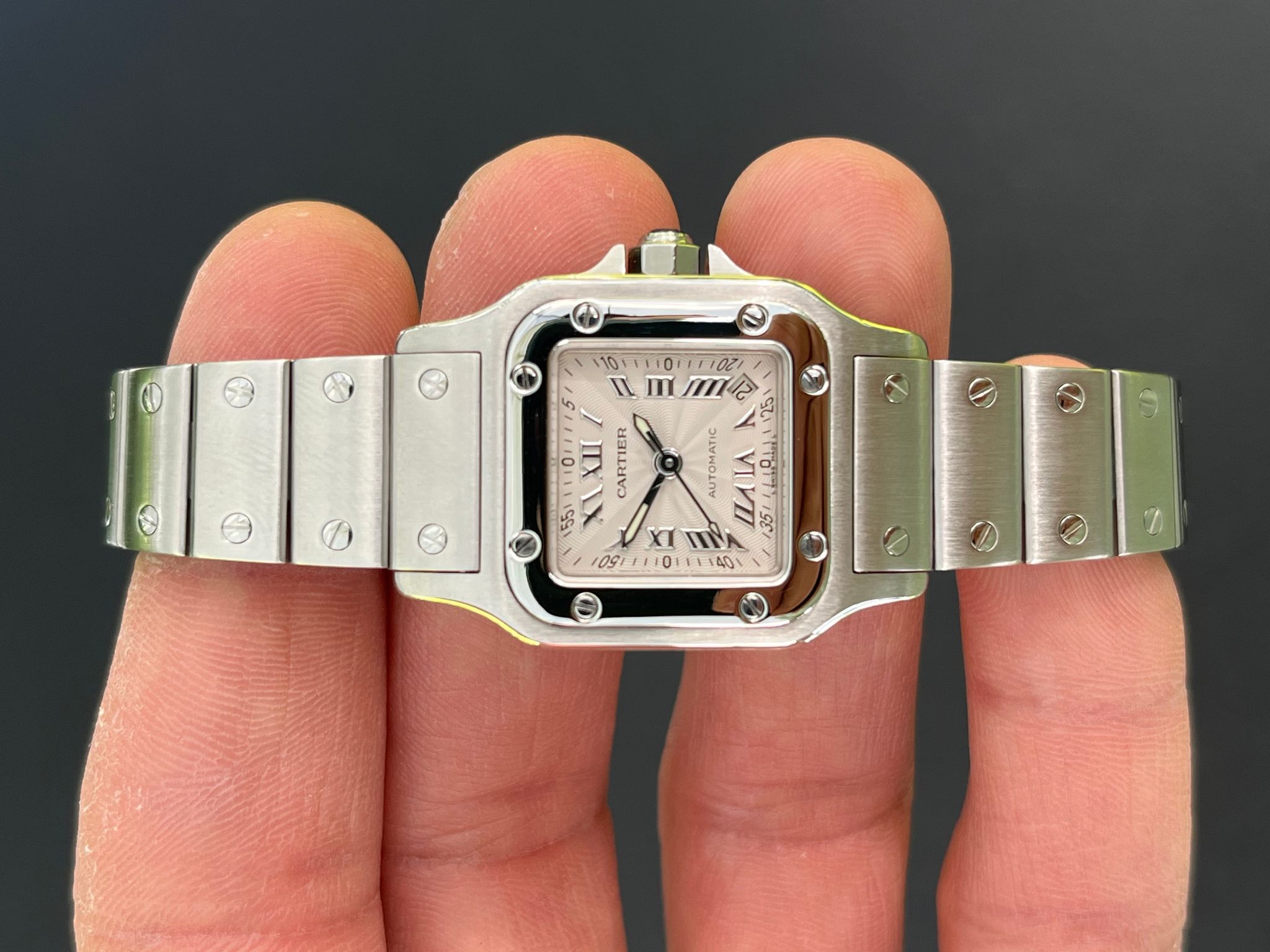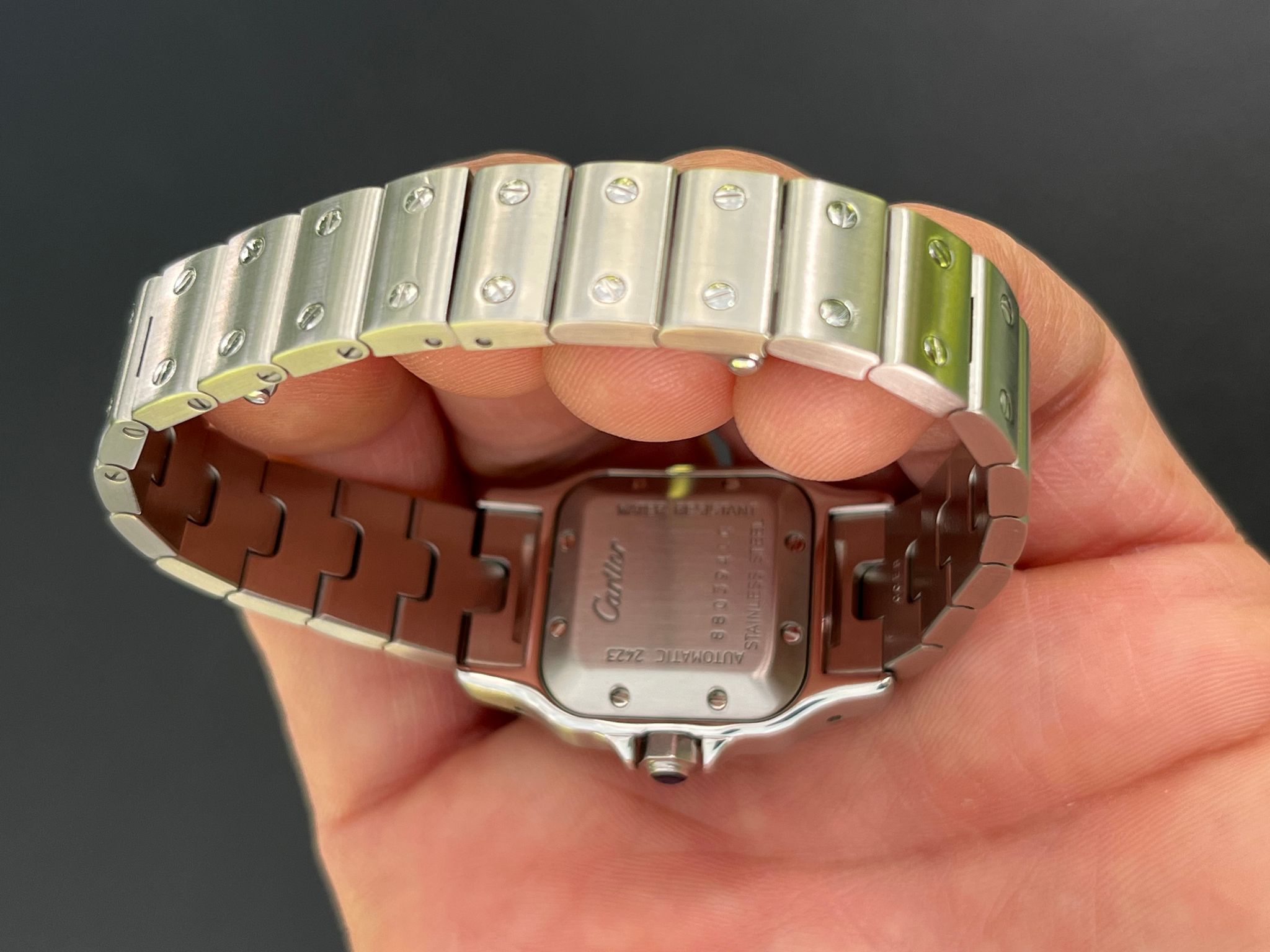 The Cartier Santos Reference 2423 (W20044D6) is a timeless expression of elegance and sophistication, embodying Cartier's iconic design ethos. This particular model features a sleek stainless steel case measuring approximately 29mm, with the signature squared design that defines the Santos collection. The polished bezel, adorned with the collection’s signature exposed screws, adds a bold yet refined touch, making it instantly recognizable.