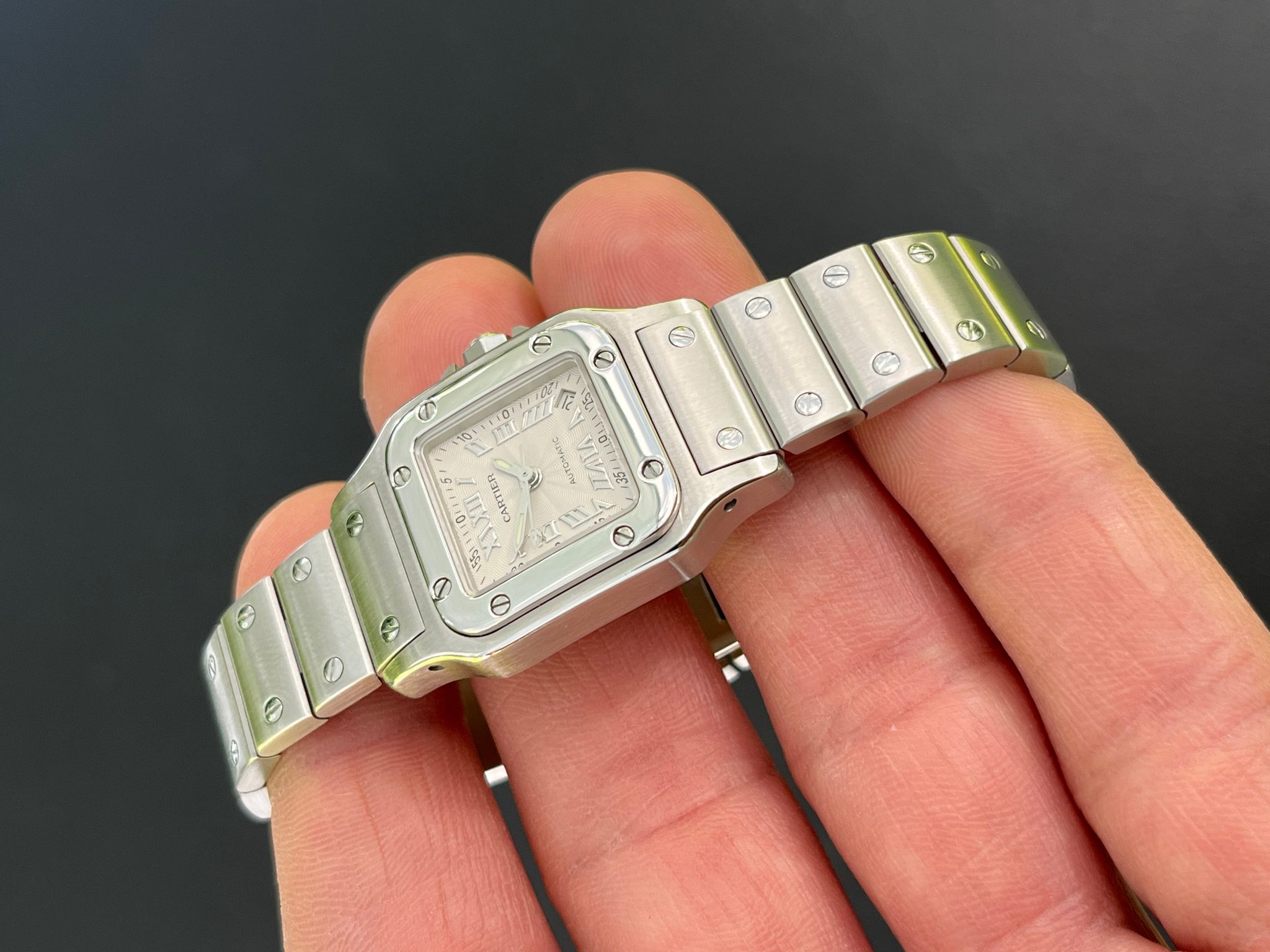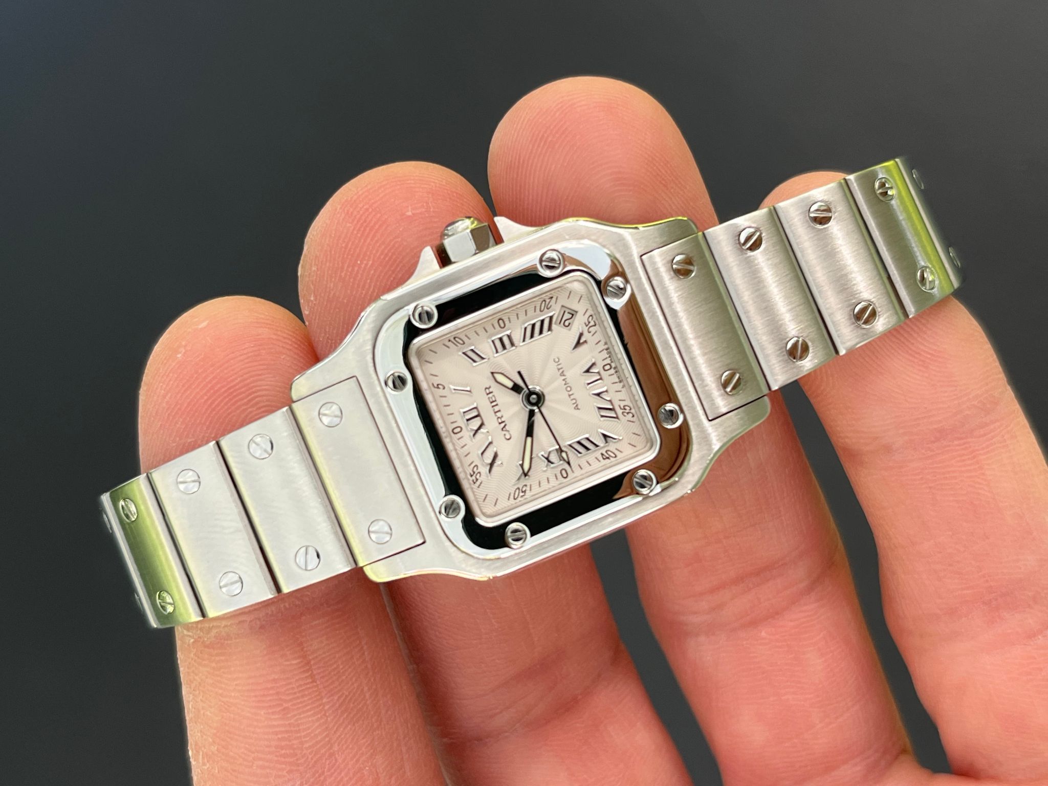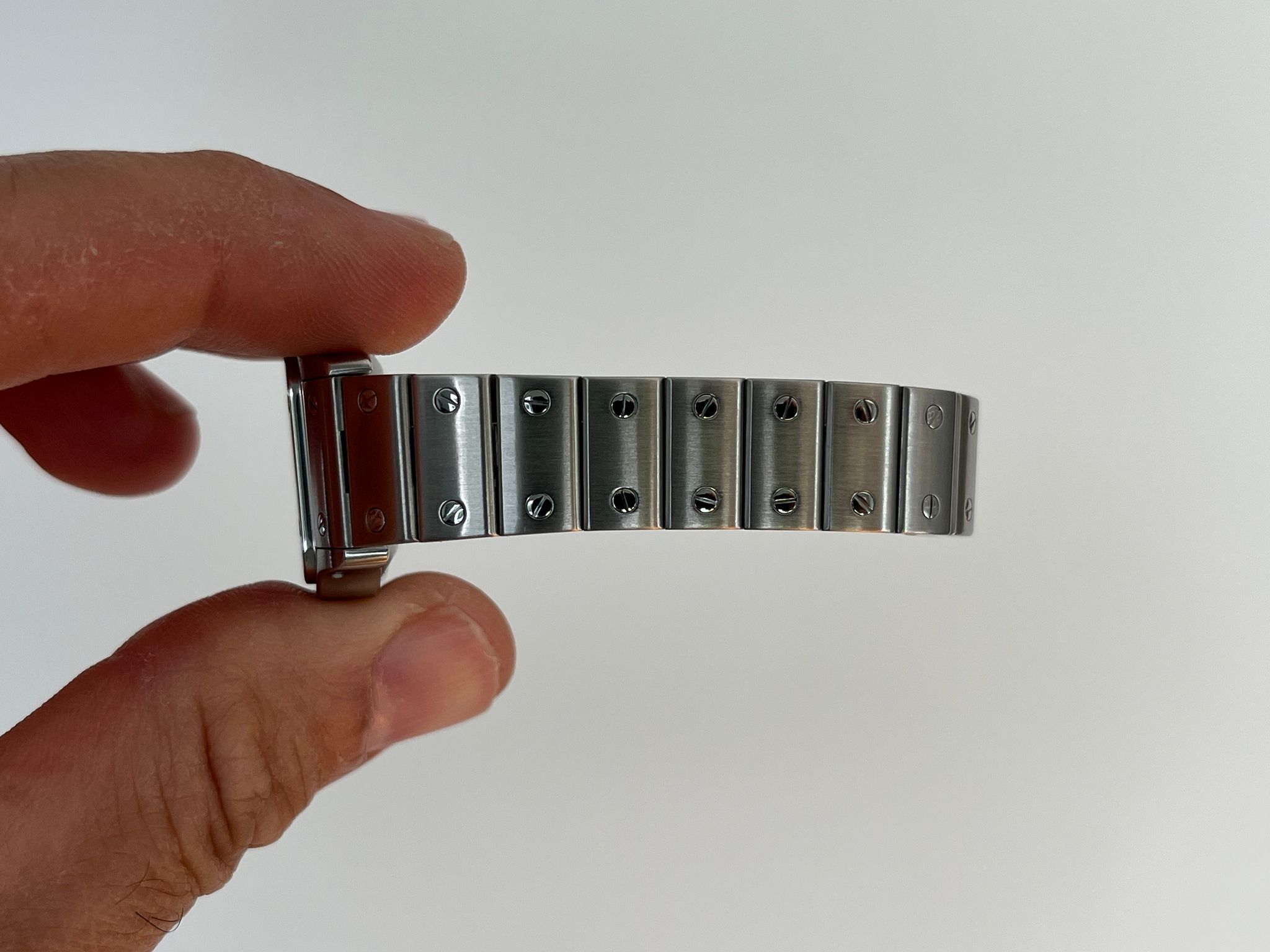 Accompanied by its full set, including the papers, booklets and wallet (no box), this unpolished Cartier Santos Reference 2423 is a testament to its exceptional provenance and condition. Paired with a stainless steel bracelet featuring a concealed deployment clasp, it offers both comfort and style. This watch is a perfect choice for those seeking a versatile and iconic timepiece with a storied legacy.