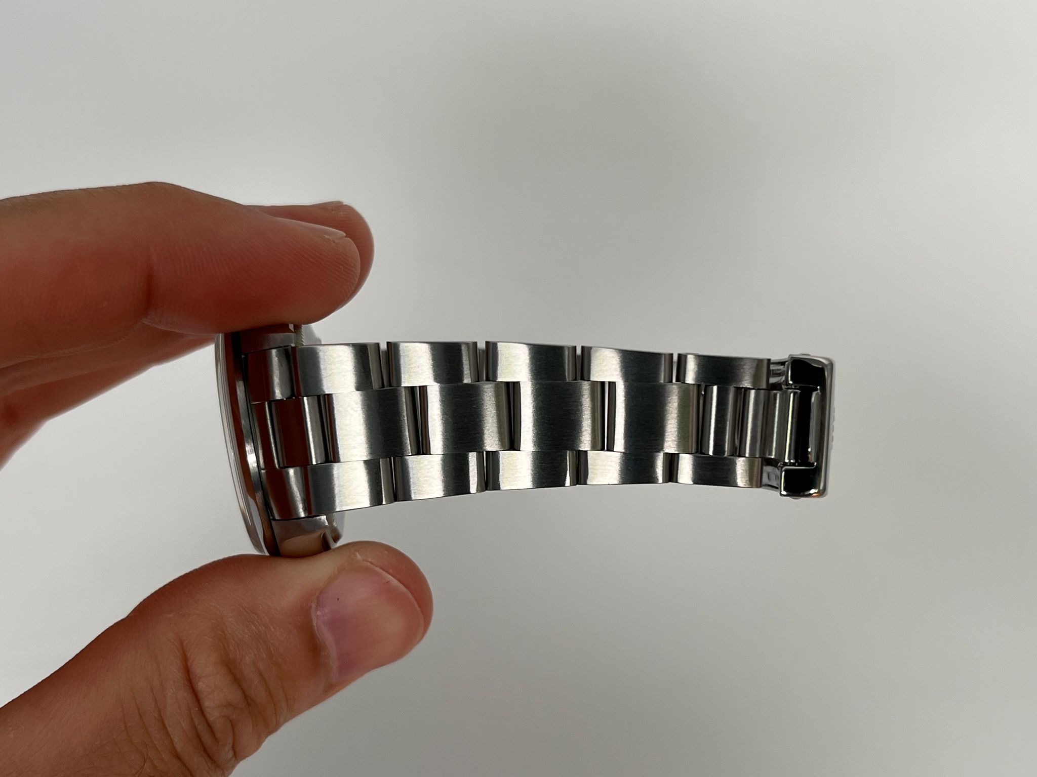 Today's example is in excellent preowned condition. The no holes case is sharp and crisp. The 3-6-9 Pink Salmon dial is mint and shows no visible wear. The bracelet has 12 total links and show no stretch. A top example in its reference class.