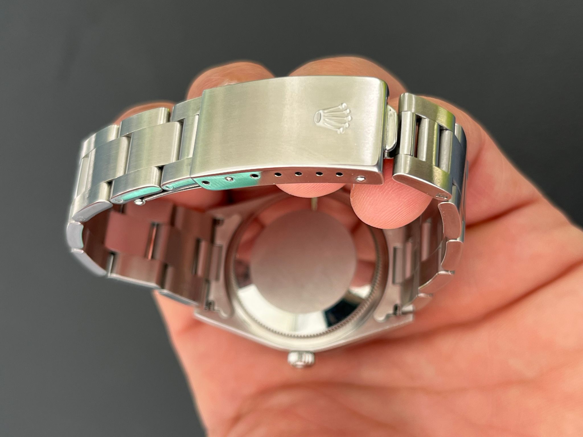 The Rolex Oyster Perpetual Air-King Reference 14000 with a Pink Salmon Dial is a stunning example of Rolex's commitment to timeless elegance and superior craftsmanship. This exquisite timepiece features a 34mm stainless steel case, perfectly balanced for both comfort and style. The unique Salmon-colored dial adds a touch of sophistication, beautifully contrasted by the sleek, minimalist design and luminous hour markers. Powered by the reliable Rolex Caliber 3000 automatic movement, the Air-King 14000 guarantees precise timekeeping and robust performance. The smooth bezel and classic Oyster bracelet enhance its refined aesthetic, making it suitable for any occasion. This particular model, with its rare and captivating salmon dial, stands out as a distinctive and highly sought-after addition to any watch collection, embodying the perfect blend of tradition and modernity.