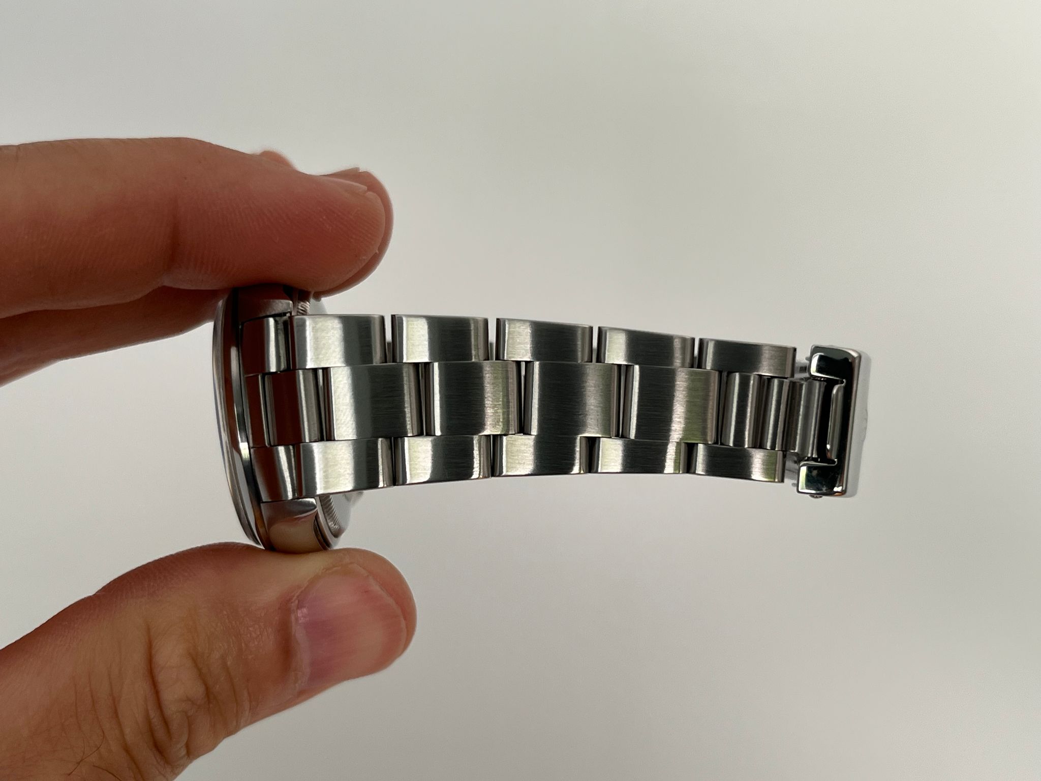 Today's example comes as watch only and is in excellent condition. The no holes case is sharp and crisp. The Blue stick dial is mint and shows no visible wear. The bracelet has 12 links and shows no stretch. A top example in its reference class.