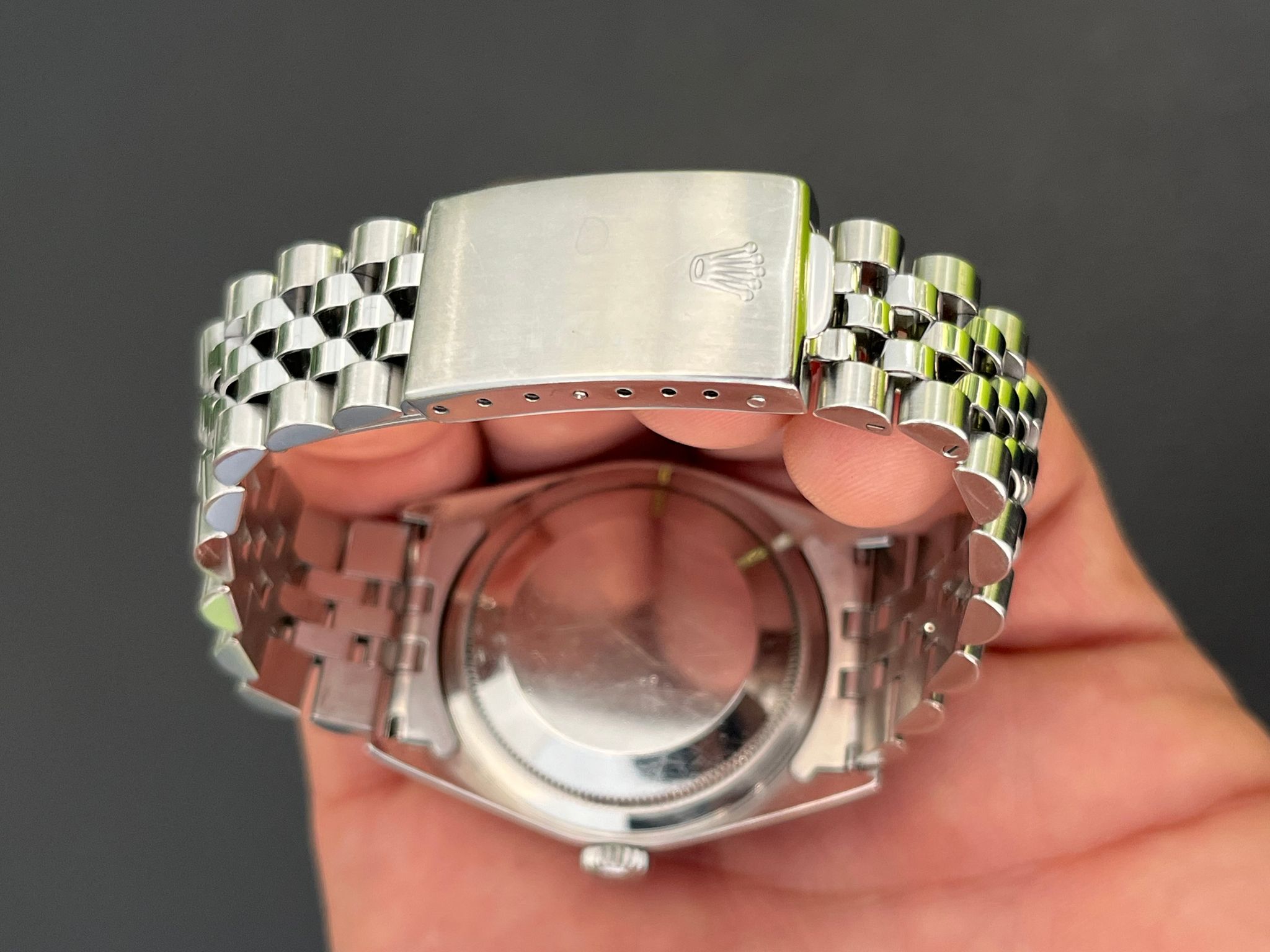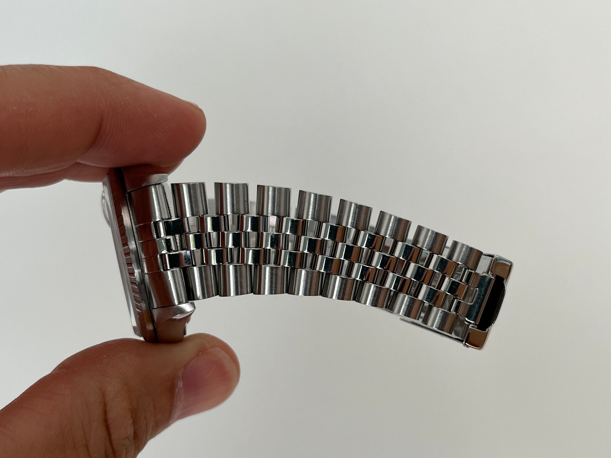 This example is in excellent preowned condition with an thick sharp no holes case with thick lugs. The White Roman dial is excellent showing no wear, and presents even toning throughout. The jubilee bracelet is long and shows minimal stretch w 4 total scrwes. This example is running COSC and has a very nice aesthetic appearance.