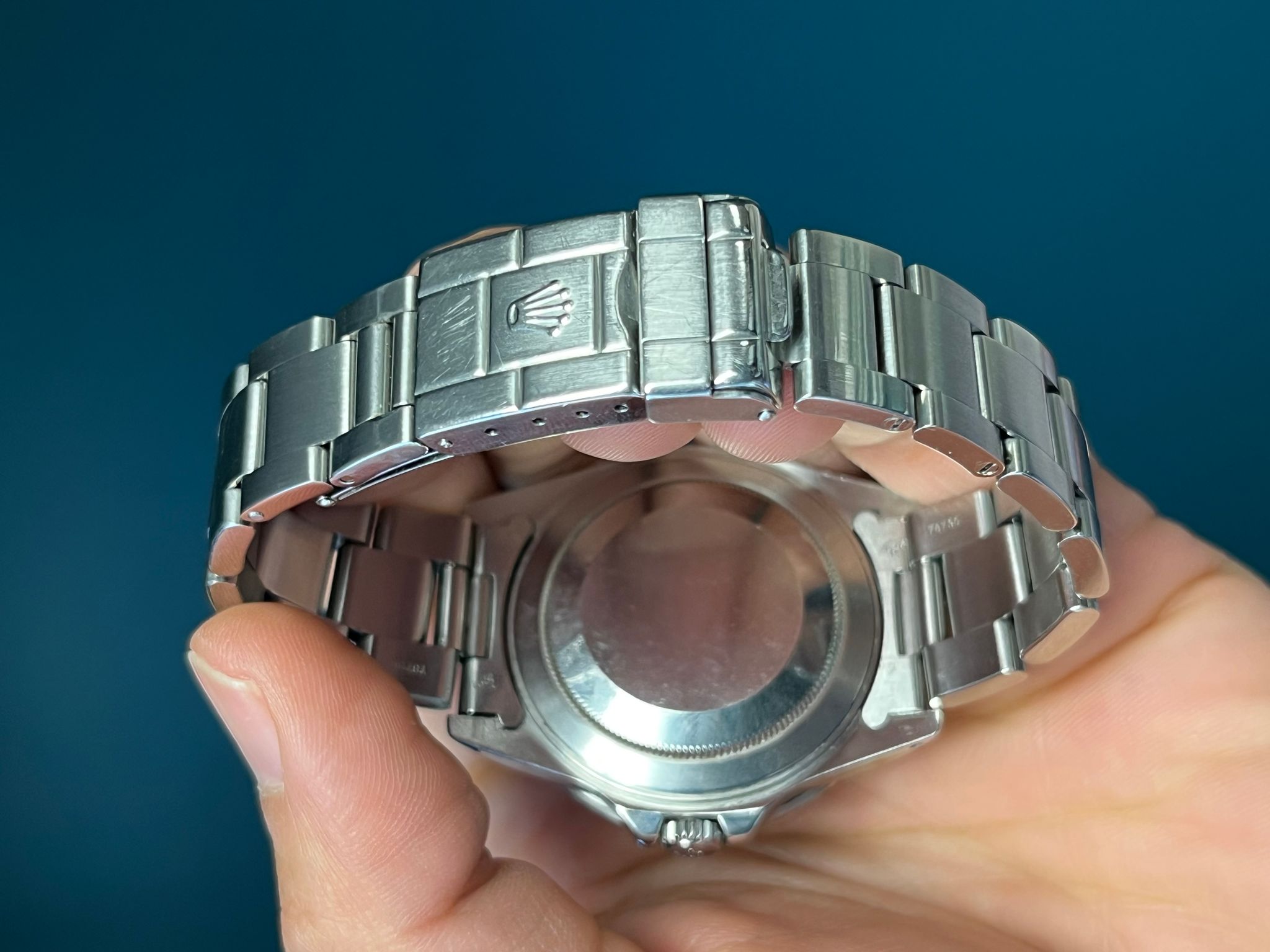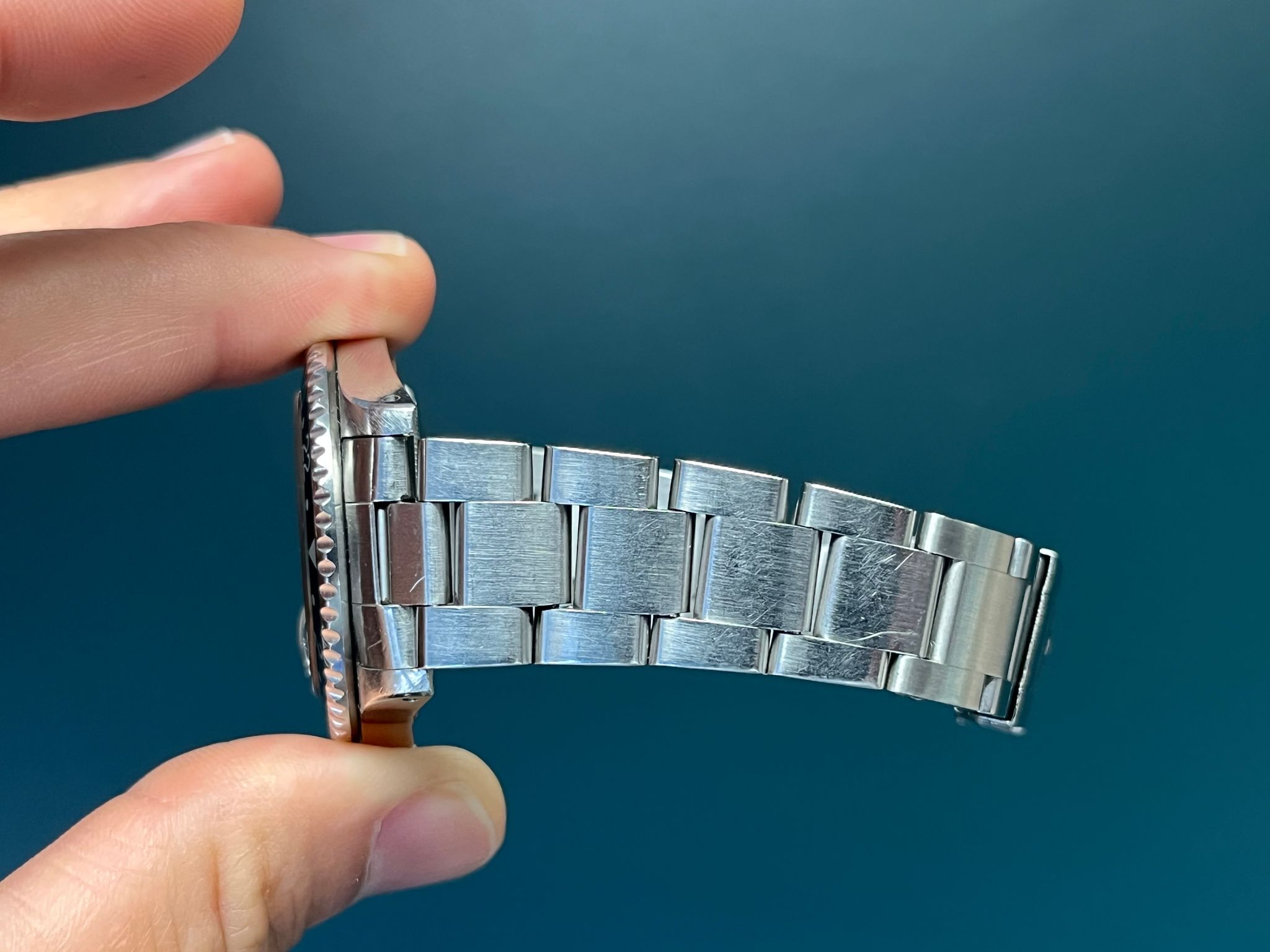 Todays example appears to be in unpolished condition. The case lugs are thick and even with sharp chamfers throughout. The Coke GMT insert is excellent. The dial is excellent with all matching patina throughout. The bracelet has 12 total inks with no stretch.