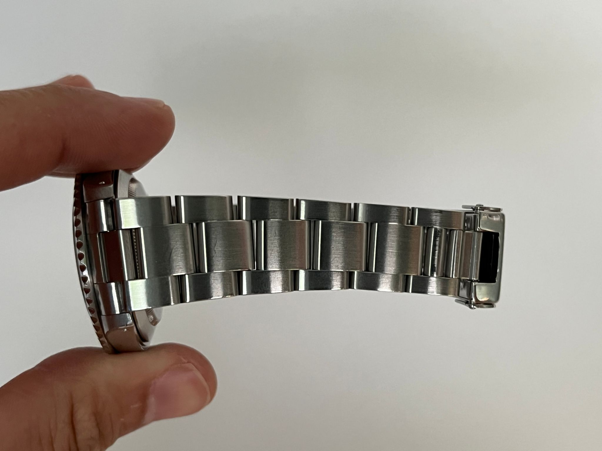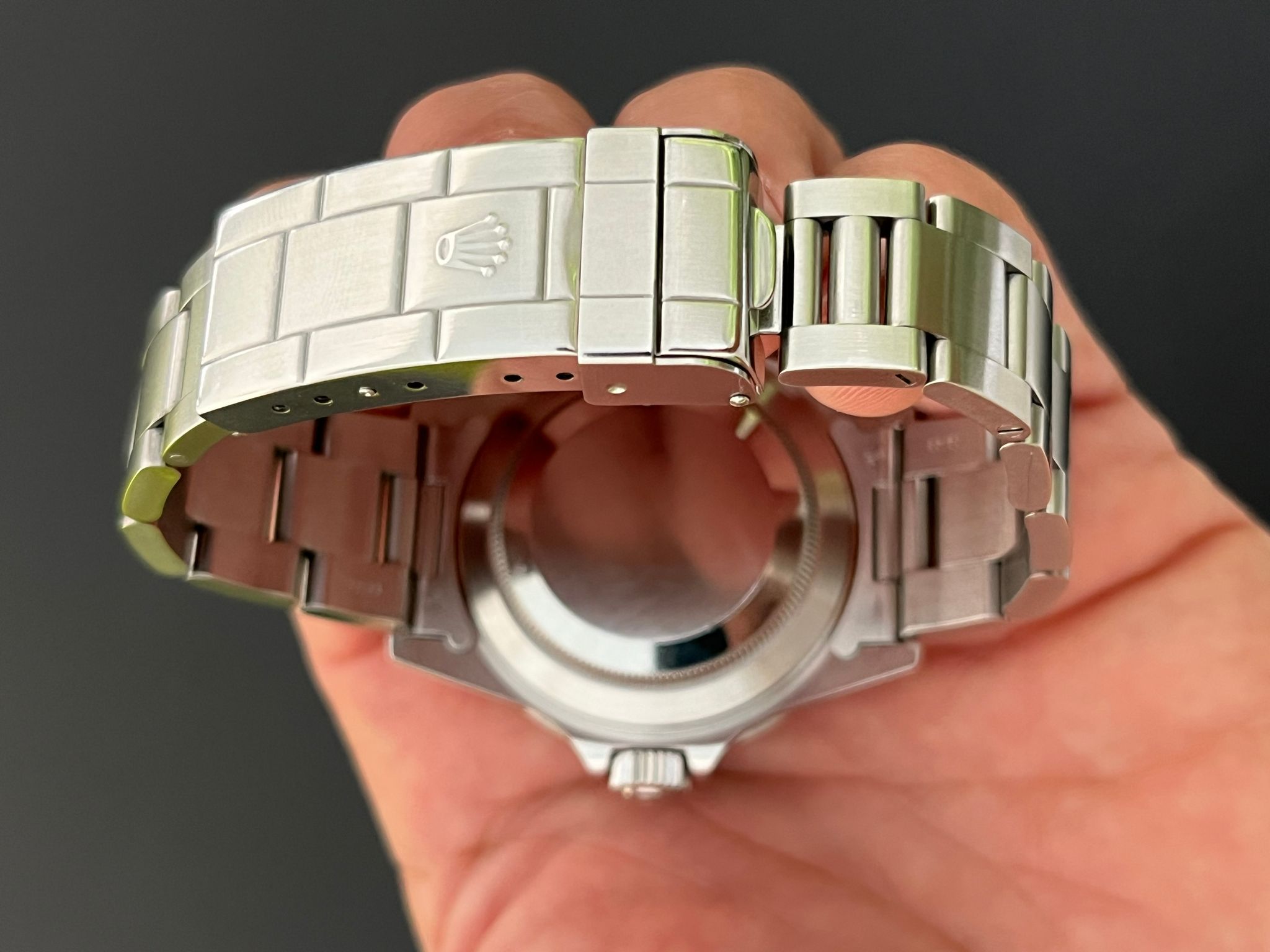 This example comes with its punched papers from 1999 and both its red seal and serial hang tag. The watch itself is in excellent preowned condition. The case is thick with sharp lugs. The bezel is crisp and the insert is in excellent condition. The SWISS only dial is mint. The bracelet has 12 links + div ext. and shows no stretch. Here is a top example with papers at a great price!