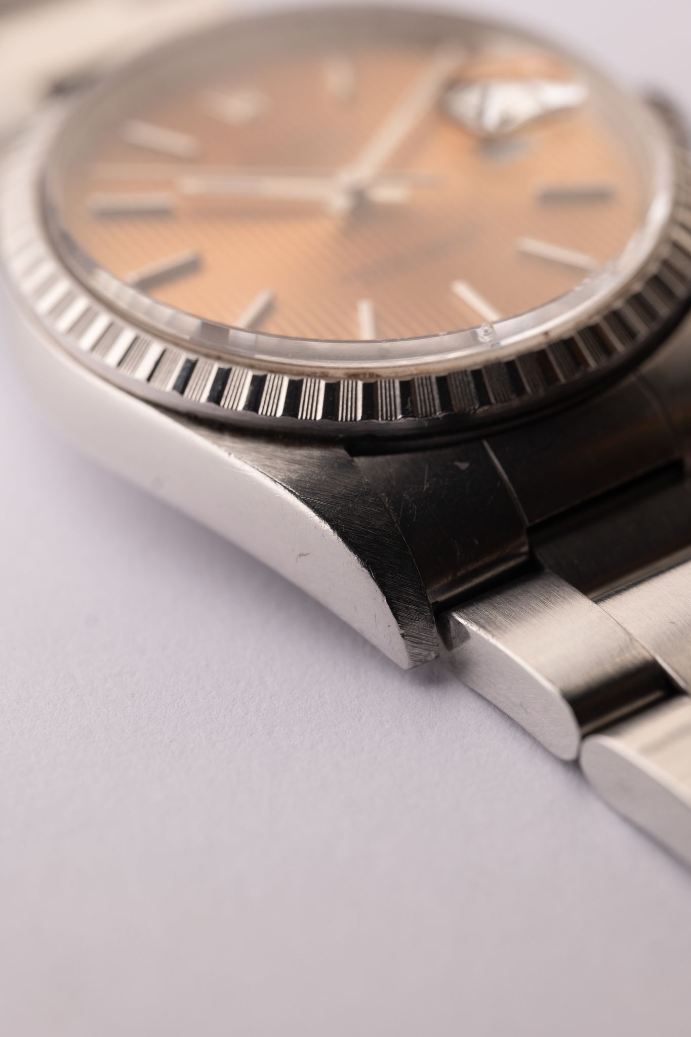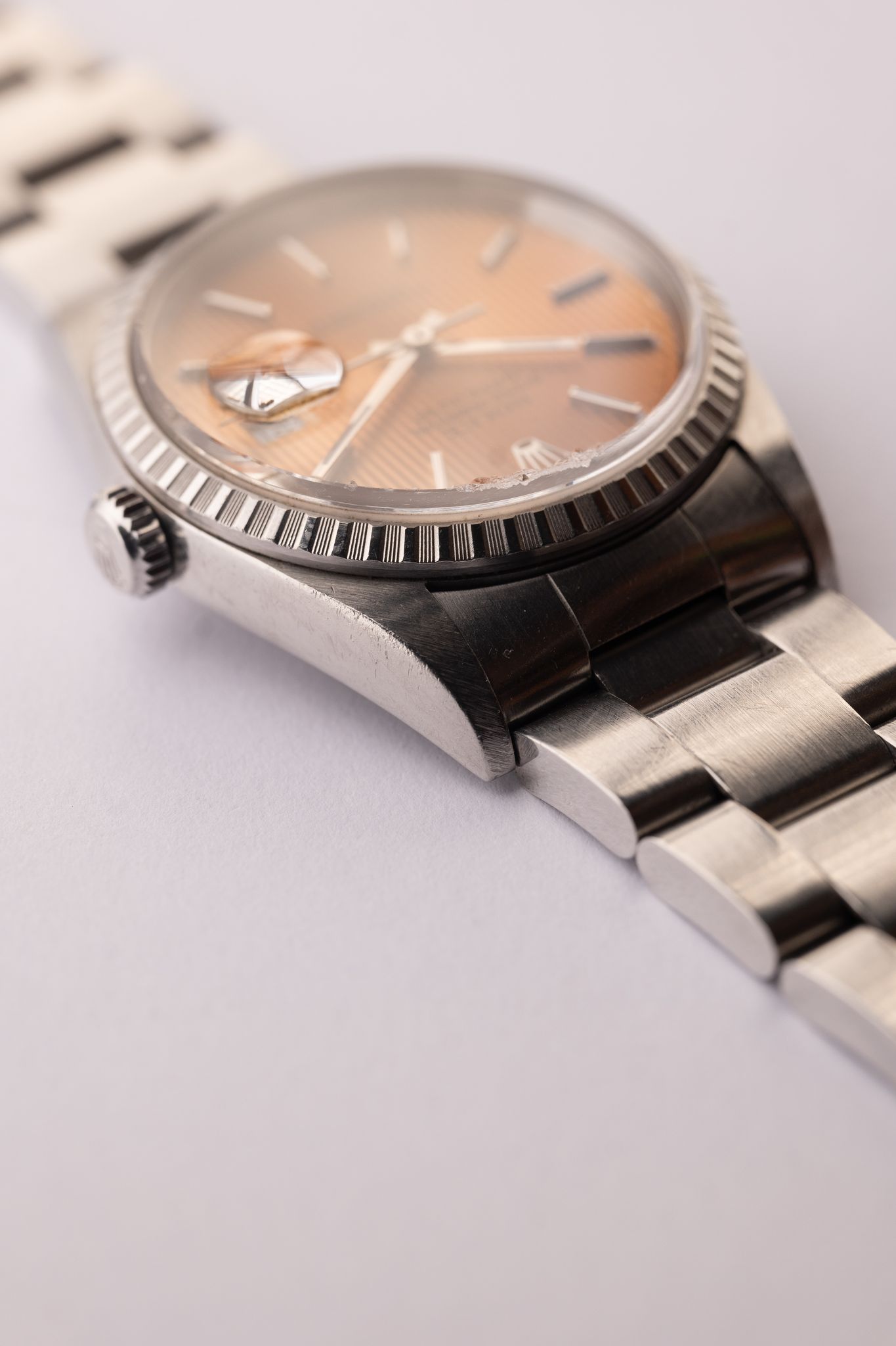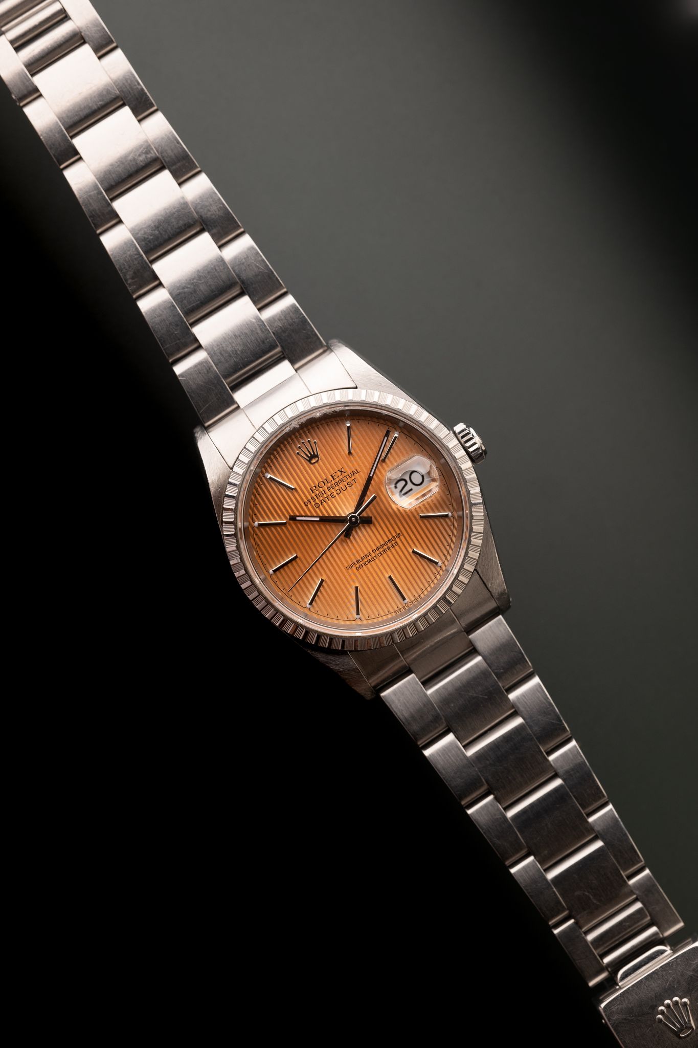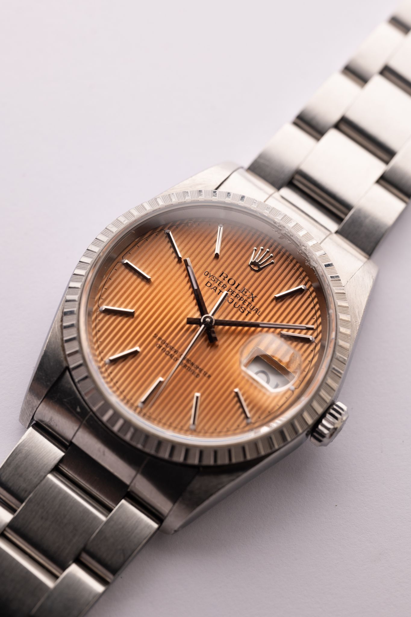 Description: The neo vintage 16220 36mm Datejust doesn’t get any cooler when it comes with a tapestry dial or tuxedo dial as its often referred to. However this dial not only has a unique distinct look die to its vertical lines from factory, the entire silver dial has changed color into a hot cheeto color. Nobody could have predicted such a color shift when it was sold and we have only seen one other one like this one in our years of dealing vintage watches however none have matched this intensity in color. This is indeed piece unique.