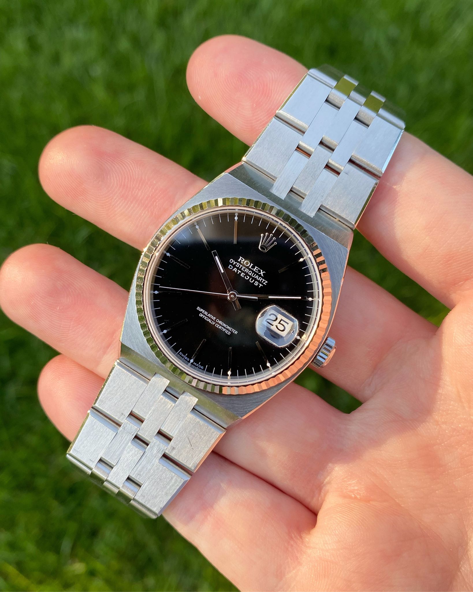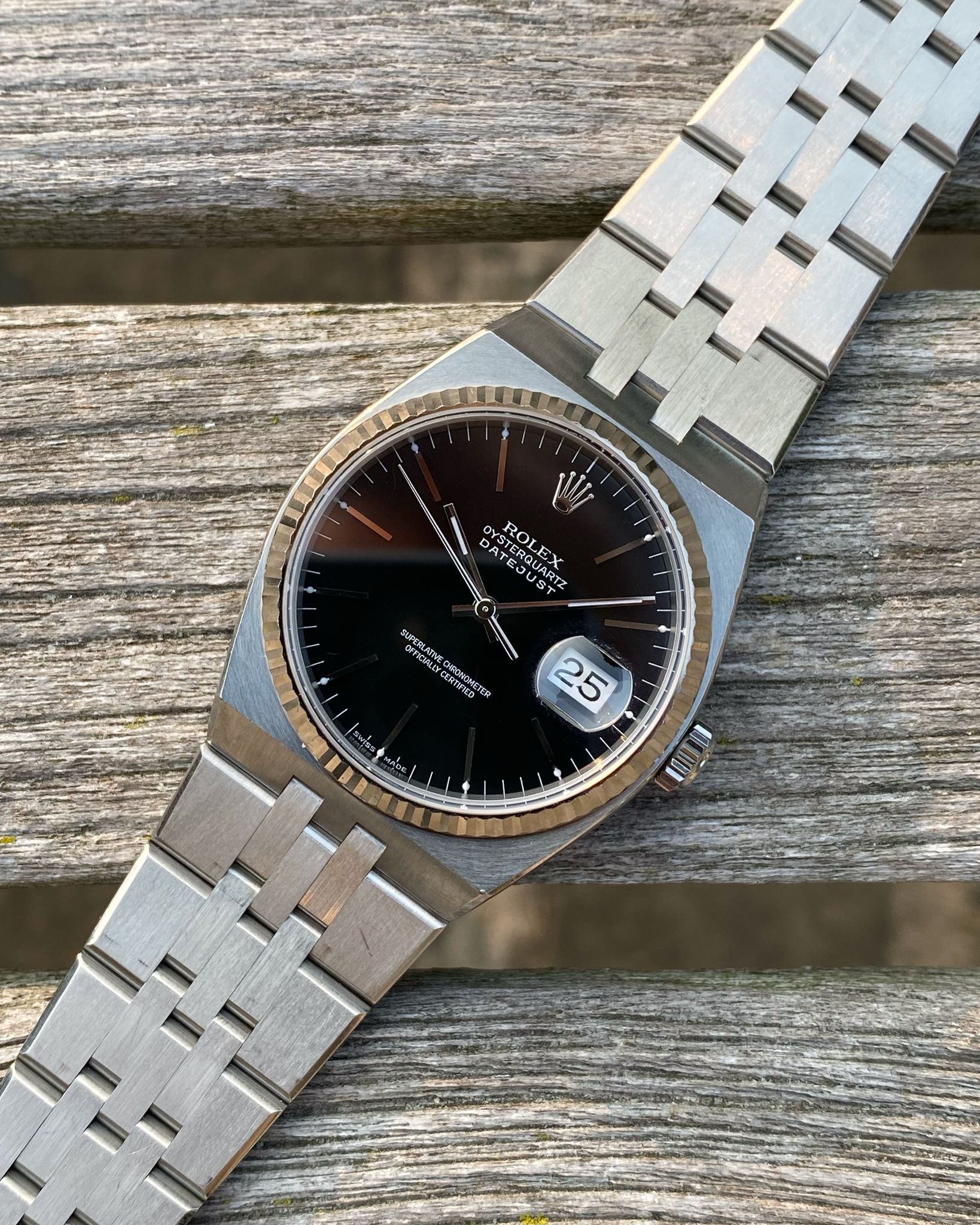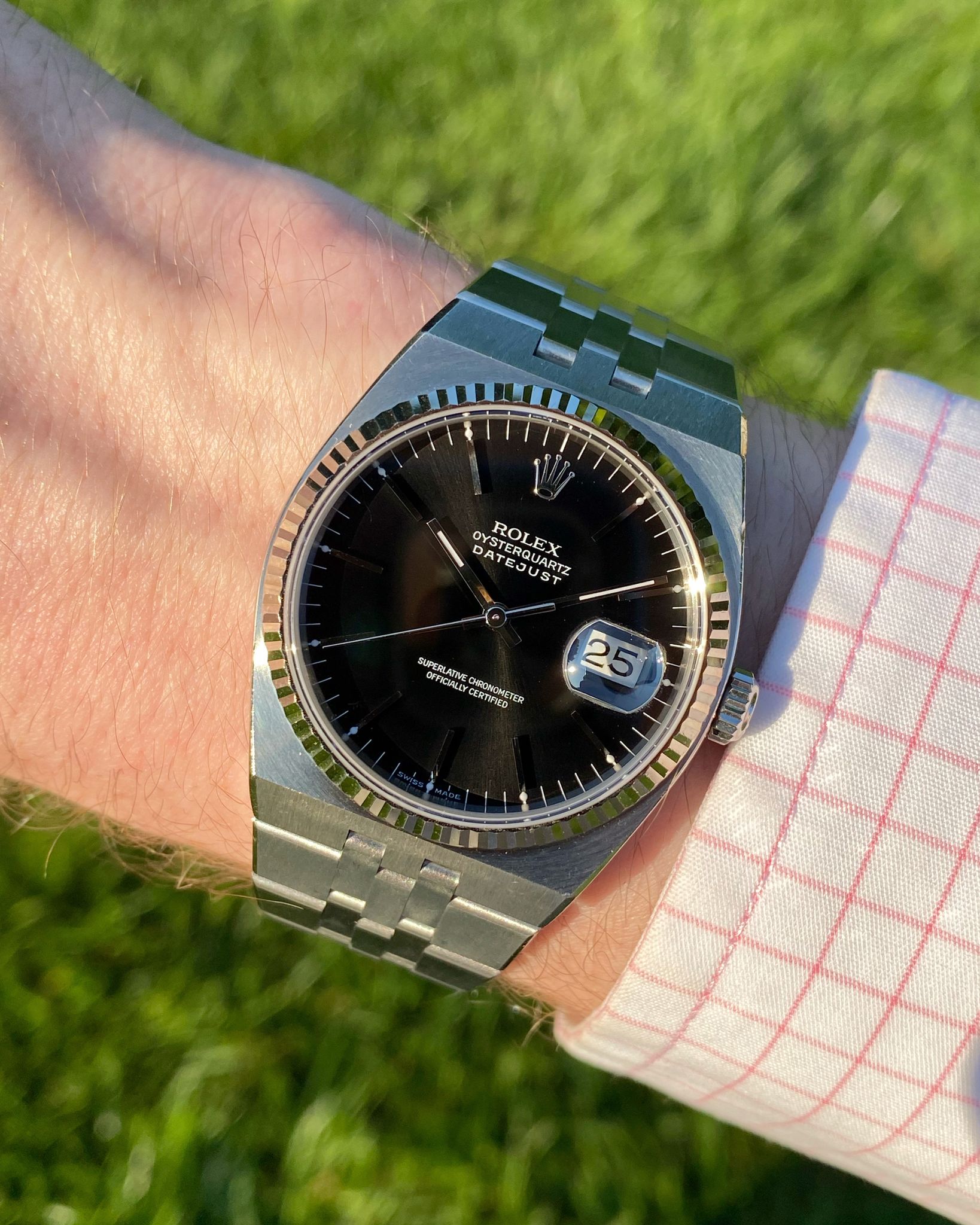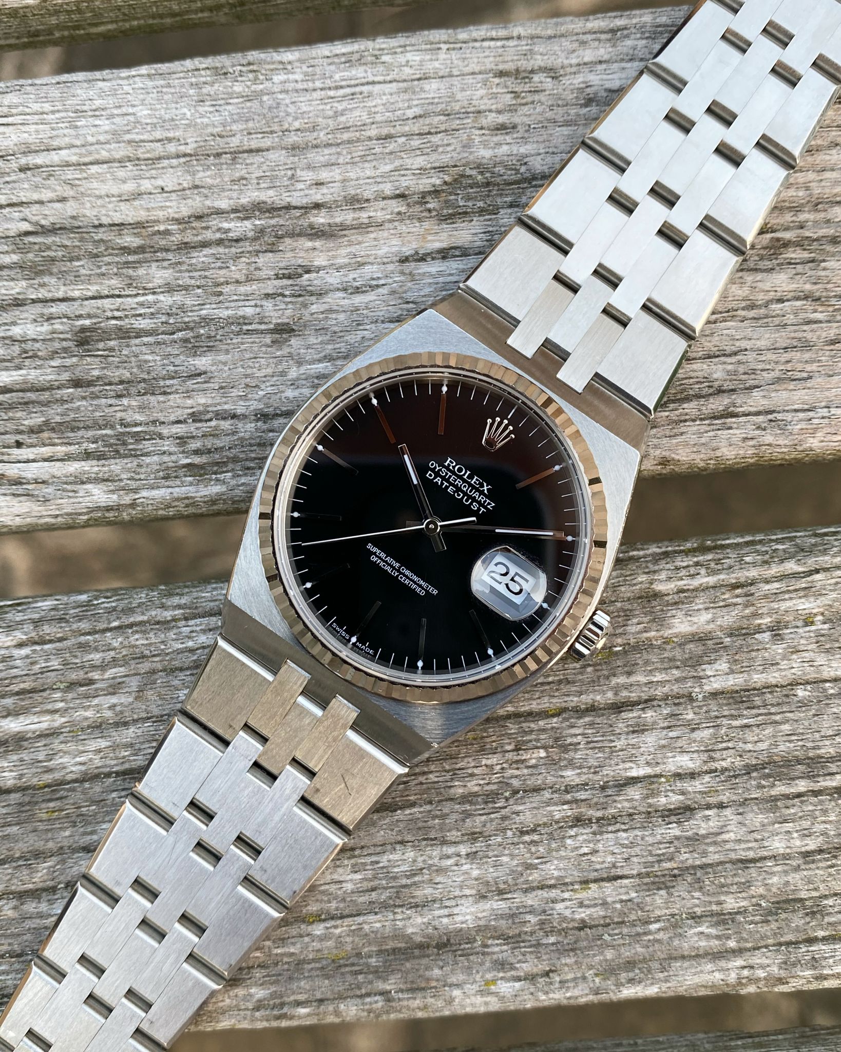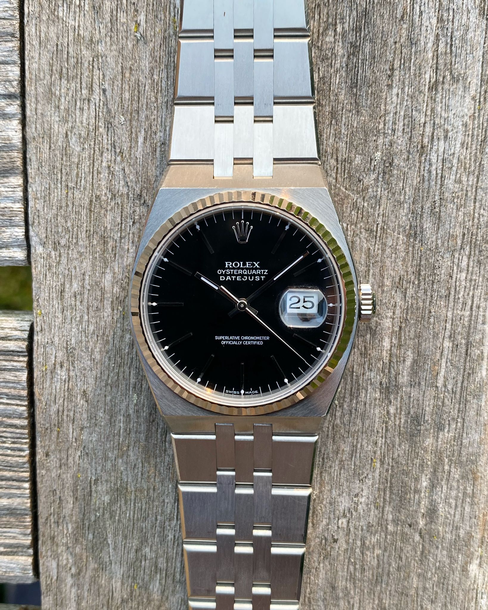 A unique aspect of late production Oysterquartz Datejust Models such as the 17014 above, is that a keen eye will notice an “A” at the end of their reference number. This is due to Rolex switching case and bracelet manufacturers to in-house production in the early 1990s for all three Oysterquartz Datejust models, as part of their broader vertical integration initiative. As a result, the Oysterquartz Datejust models each received updated reference numbers marked by the addition of the letter 'A,' denoting the new in-house cases. These updated references were introduced in the mid-1990s and remained in production until the Oysterquartz Datejust line was discontinued in early 2001, representing a very small fraction of overall production.