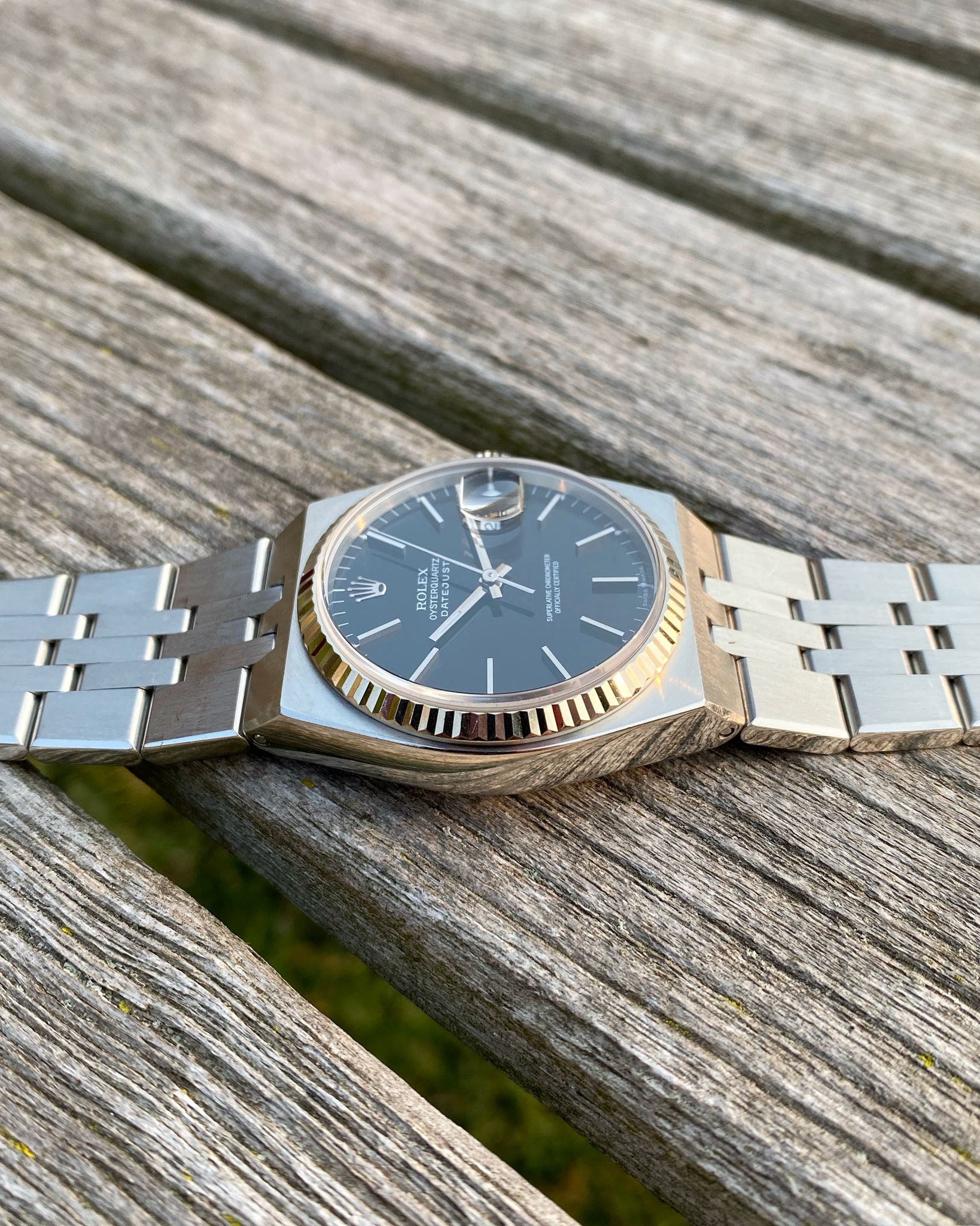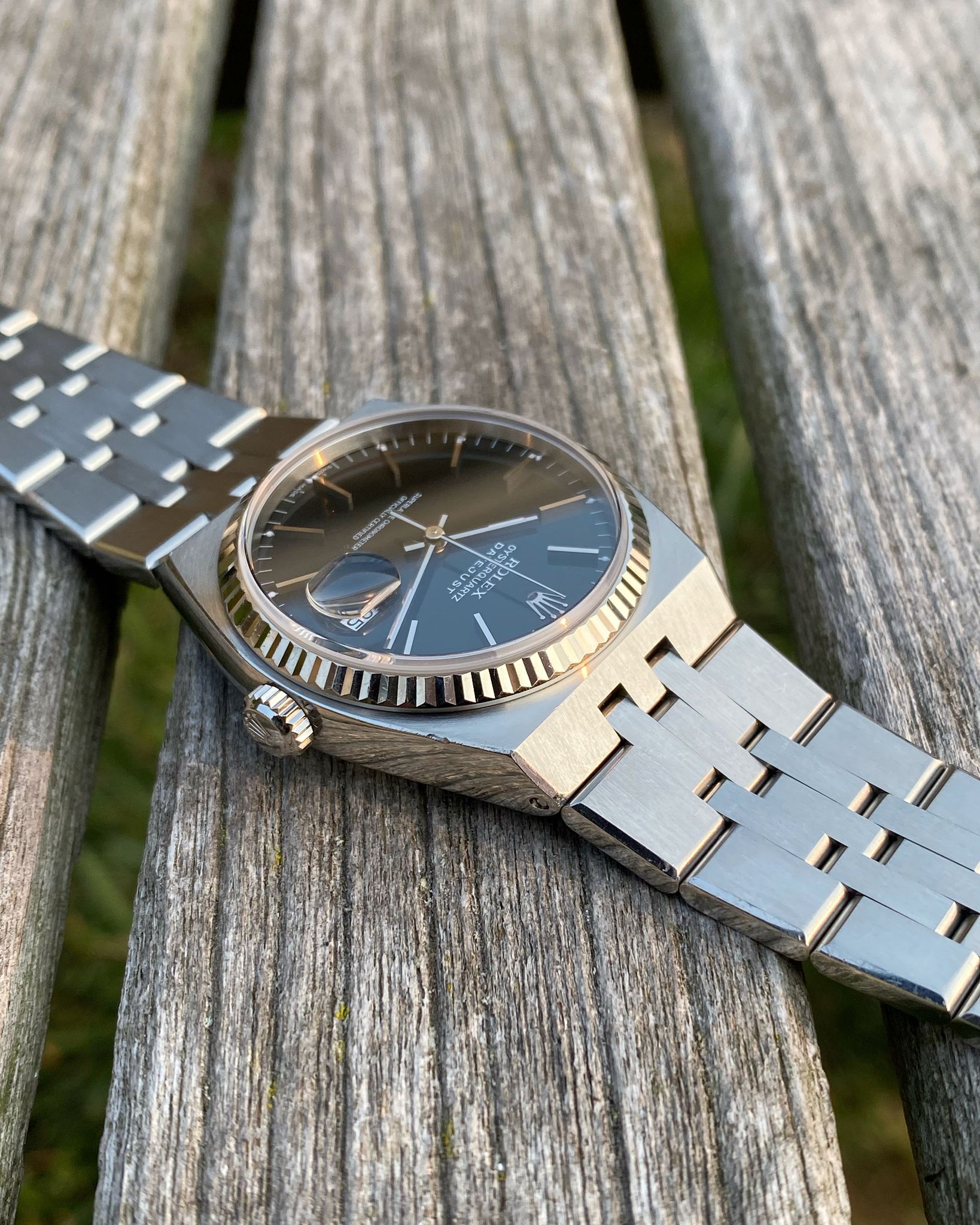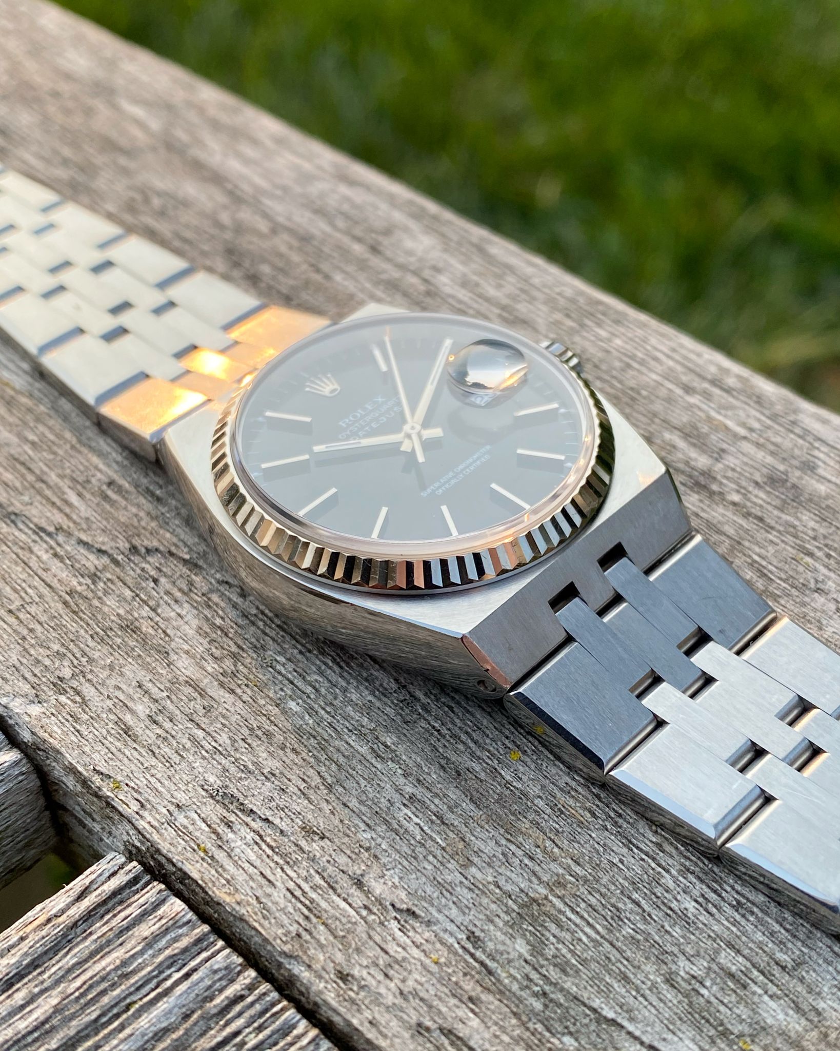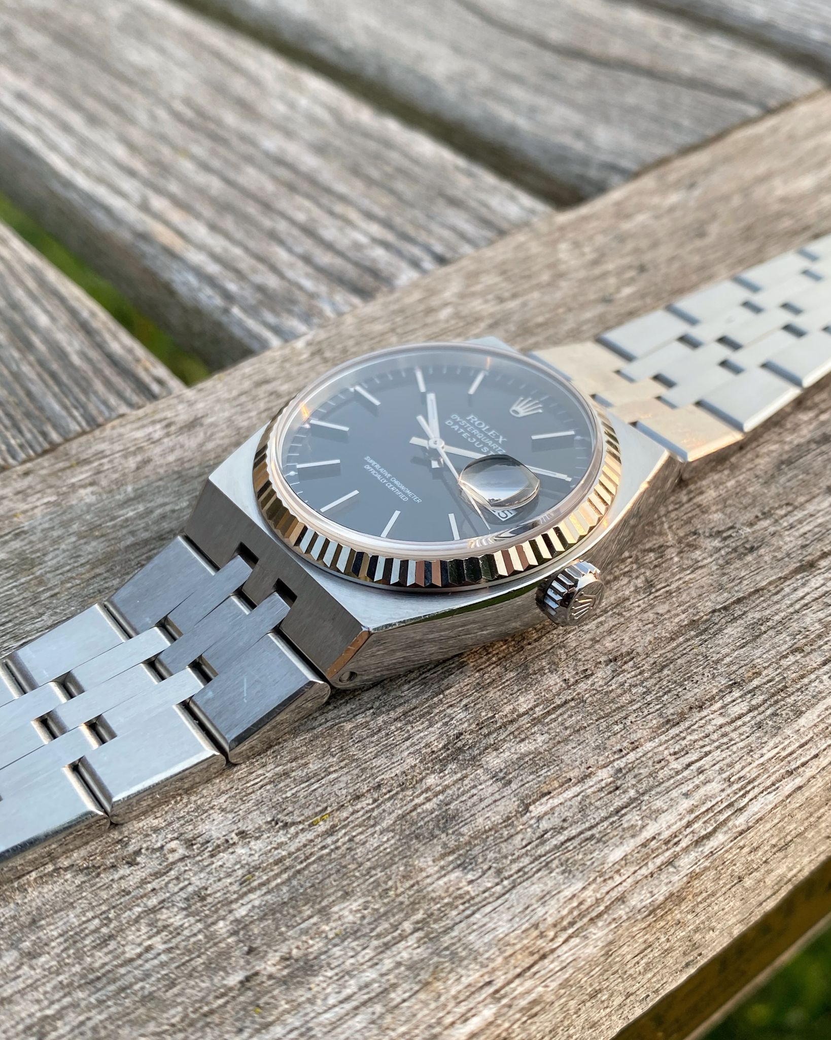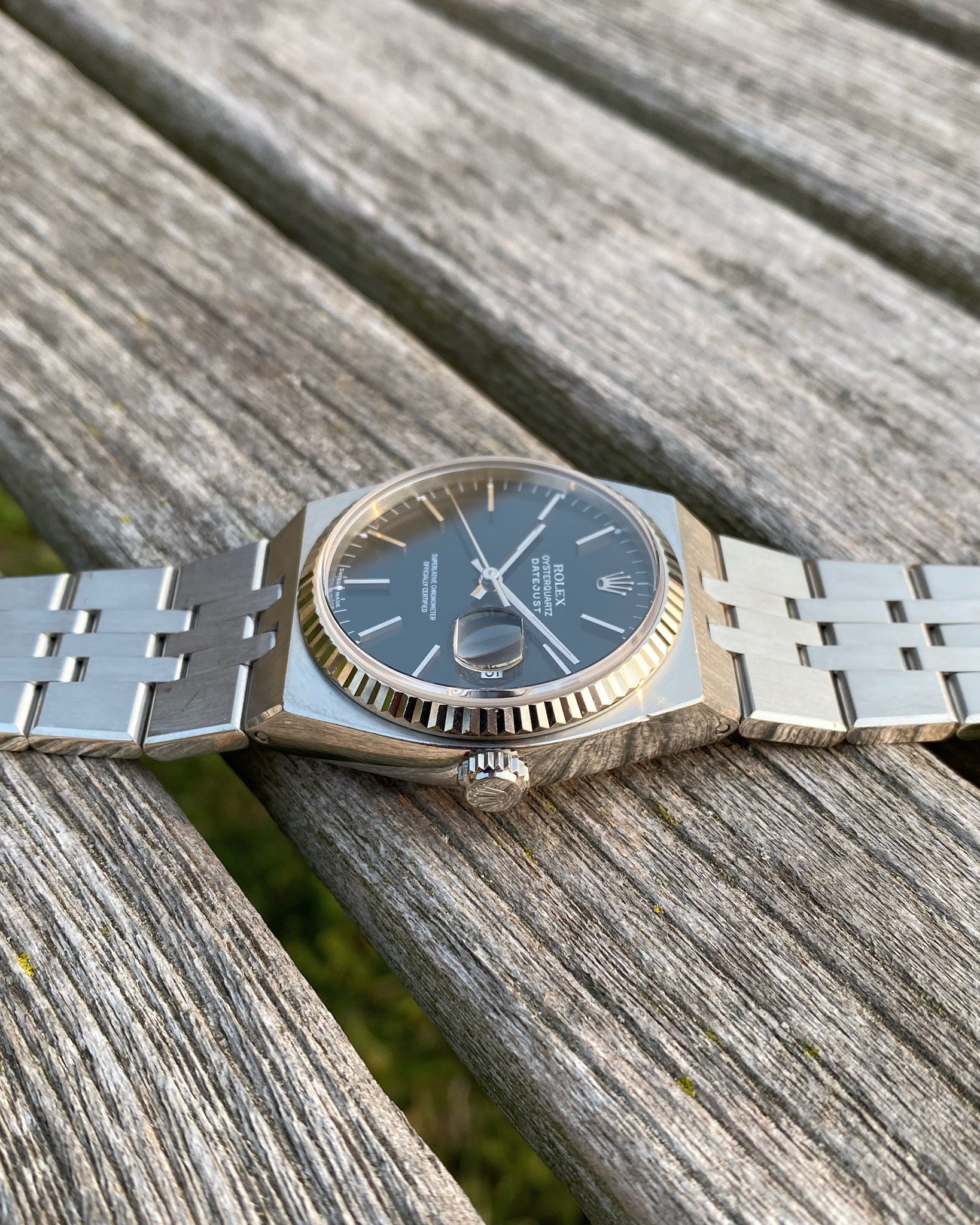 A unique aspect of late production Oysterquartz Datejust Models such as the 17014 above, is that a keen eye will notice an “A” at the end of their reference number. This is due to Rolex switching case and bracelet manufacturers to in-house production in the early 1990s for all three Oysterquartz Datejust models, as part of their broader vertical integration initiative. As a result, the Oysterquartz Datejust models each received updated reference numbers marked by the addition of the letter 'A,' denoting the new in-house cases. These updated references were introduced in the mid-1990s and remained in production until the Oysterquartz Datejust line was discontinued in early 2001, representing a very small fraction of overall production.