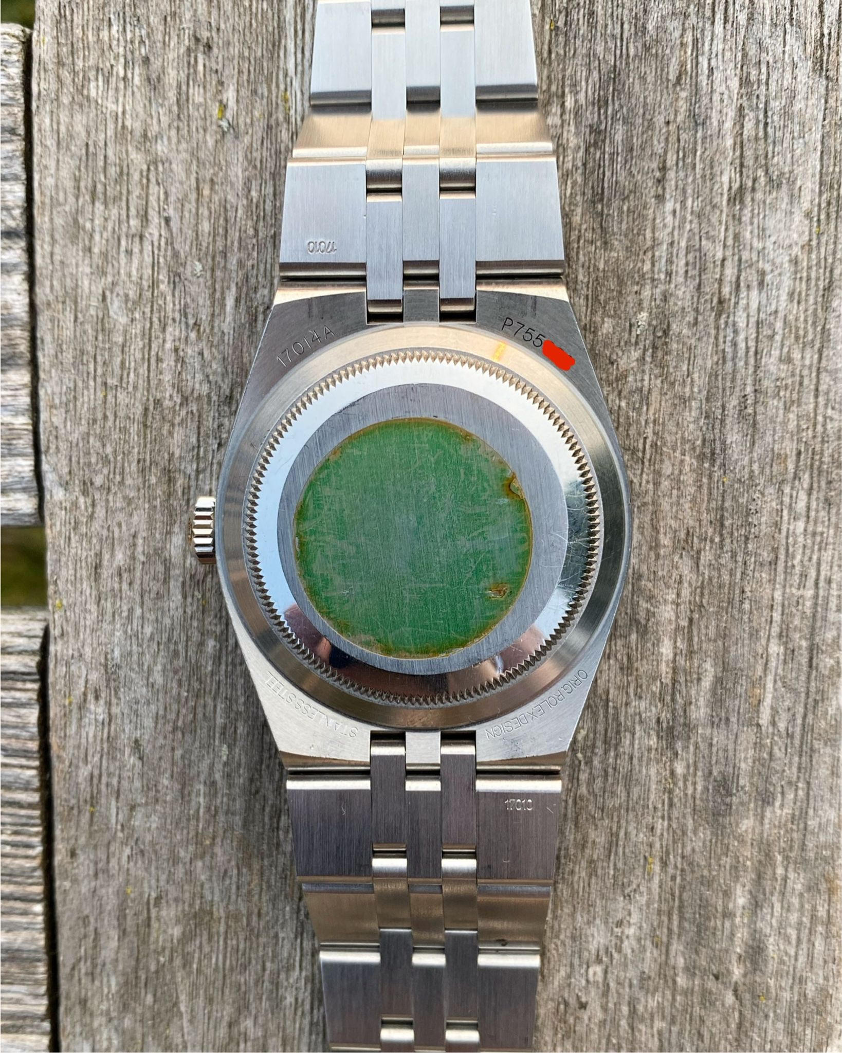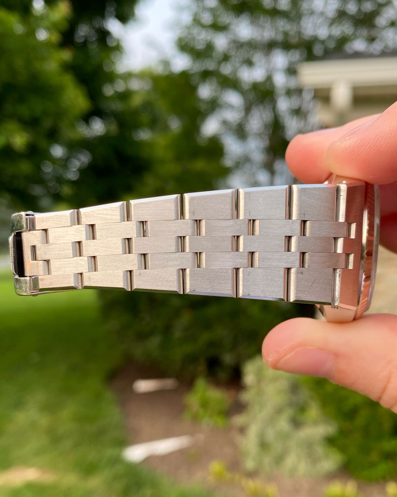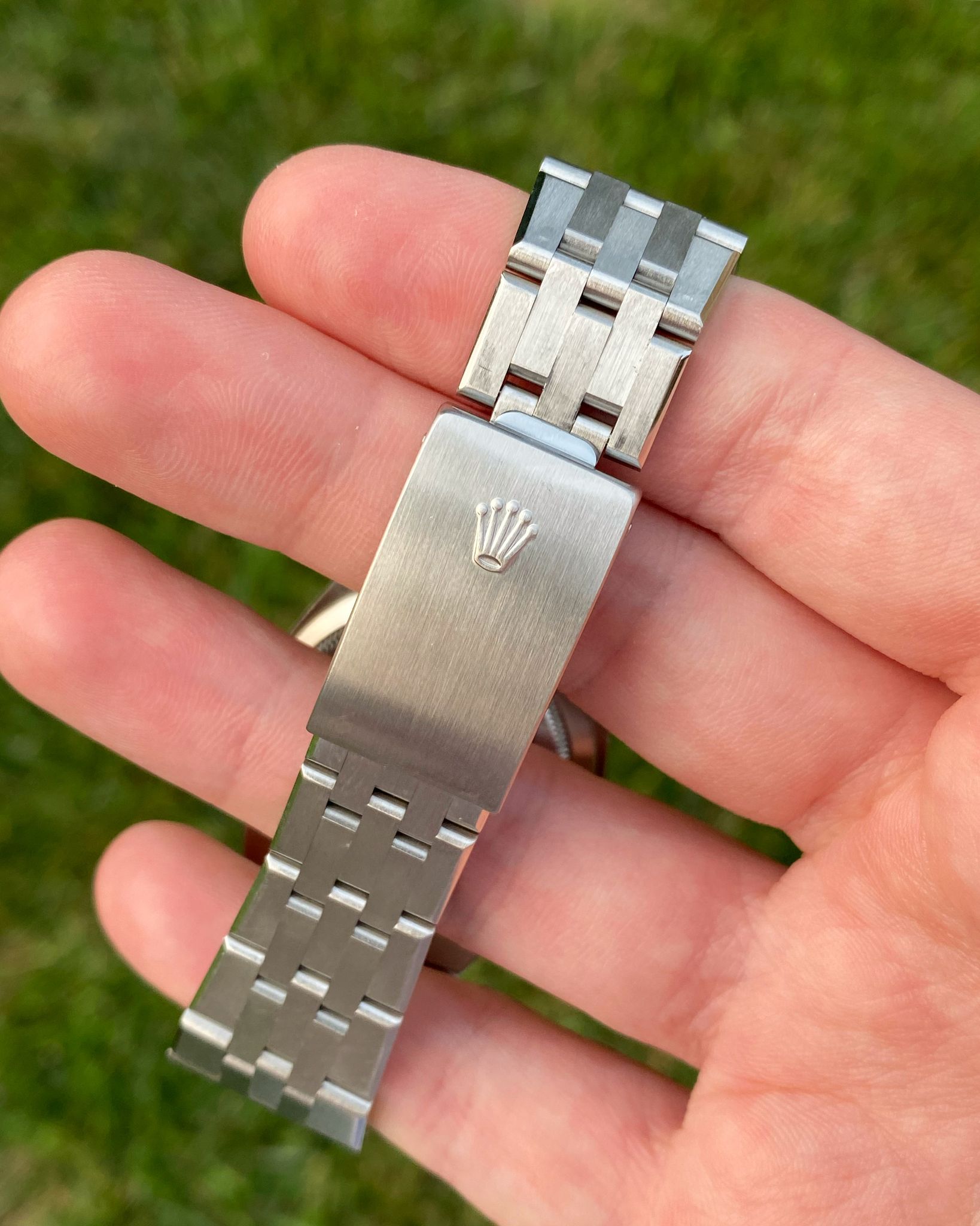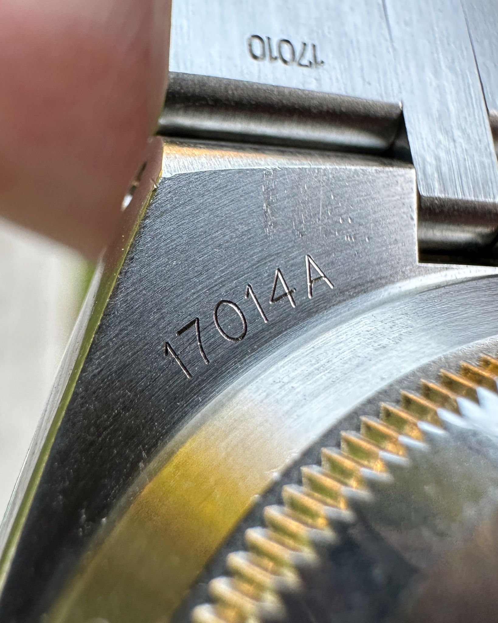 The case appears to be unpolished, retaining crisp factory brush lines, with sharp well defined chamfers and crisp bezel flutes. The case also contains remnants of its original green factory caseback sticker. The only imperfection on the case is a small impression on the edge crown side chamfer between 1 and 2 o’clock, which is barely noticeable. The 17010 integrated Jubilee bracelet also appears unpolished with no noticeable stretch, and crisp brushed lines / chamfers, containing only a few light surface level hairline scratches by the clasp.
