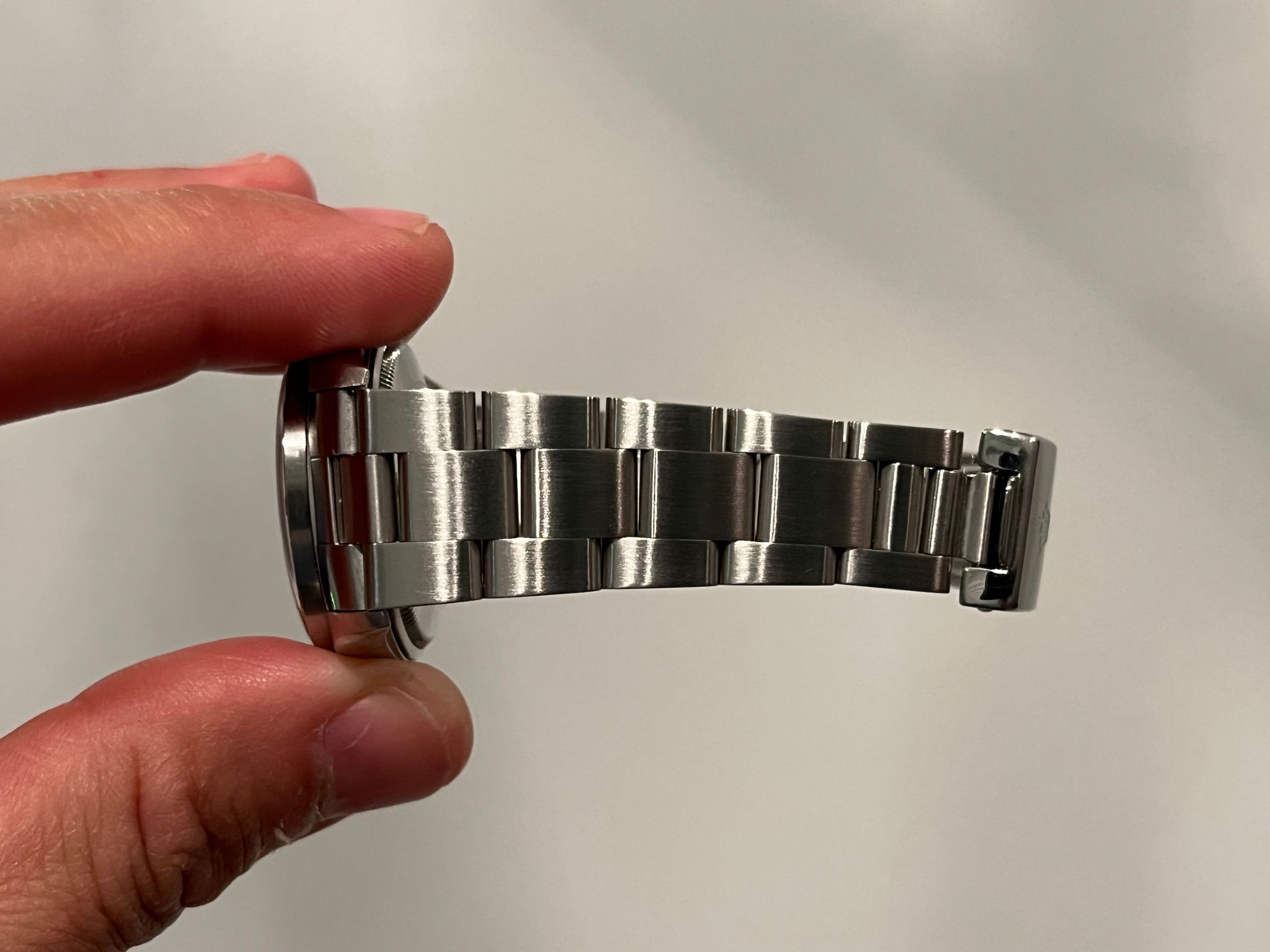 Today's example comes as watch only and is in excellent condition. The no holes case and engine-turn bezel are sharp and unpolished. The black dial is mint and shows no visible wear. The bracelet has 12 links and shows no stretch. A top example in its reference class.