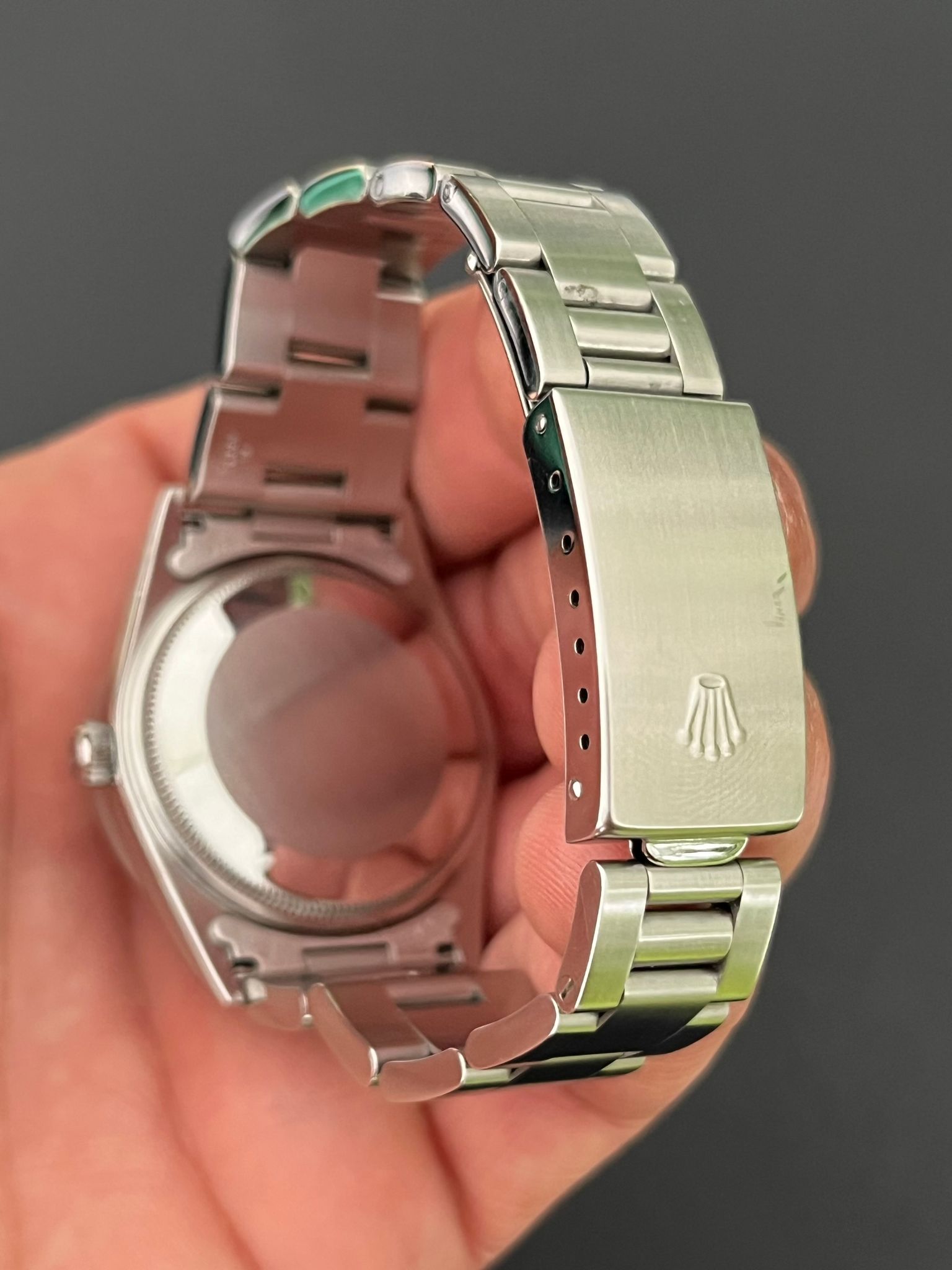 The Rolex Air King Reference 14010 with a black dial is a distinctive and elegant timepiece that seamlessly merges classic design with modern aesthetics. The watch features a stainless steel case with a diameter of 34mm, showcasing Rolex's commitment to precision craftsmanship and enduring style. The standout element is its black colored dial, a unique and eye-catching choice that adds a touch of warmth and sophistication. The dial is adorned with luminous hour markers and hands, ensuring excellent legibility in any lighting condition. Powered by the reliable Rolex Caliber 3130 movement, the Air King 14010 promises accurate timekeeping and durability. With its balanced blend of vintage charm and contemporary flair, this Rolex timepiece stands as a testament to the brand's timeless appeal and unwavering commitment to quality.