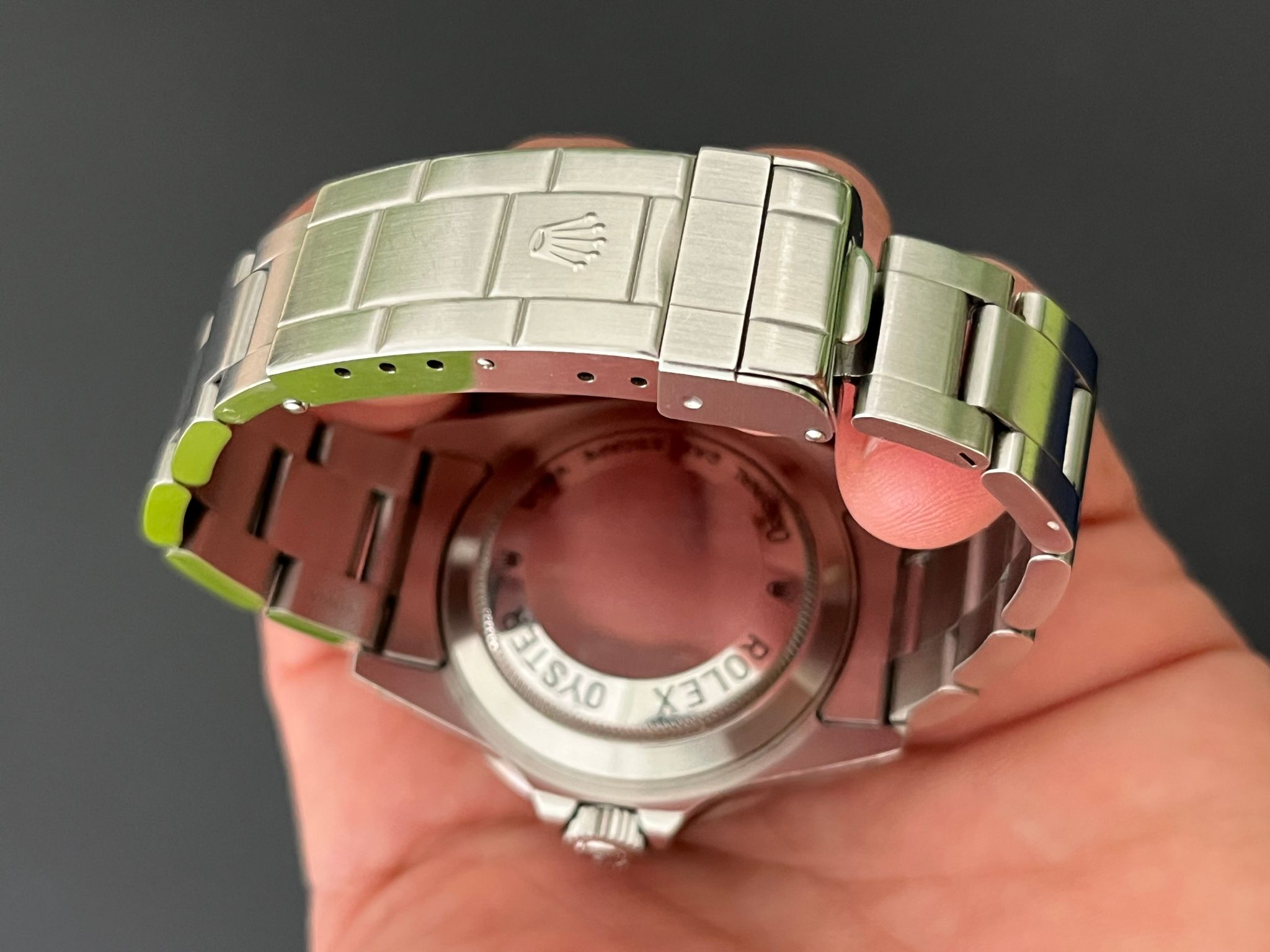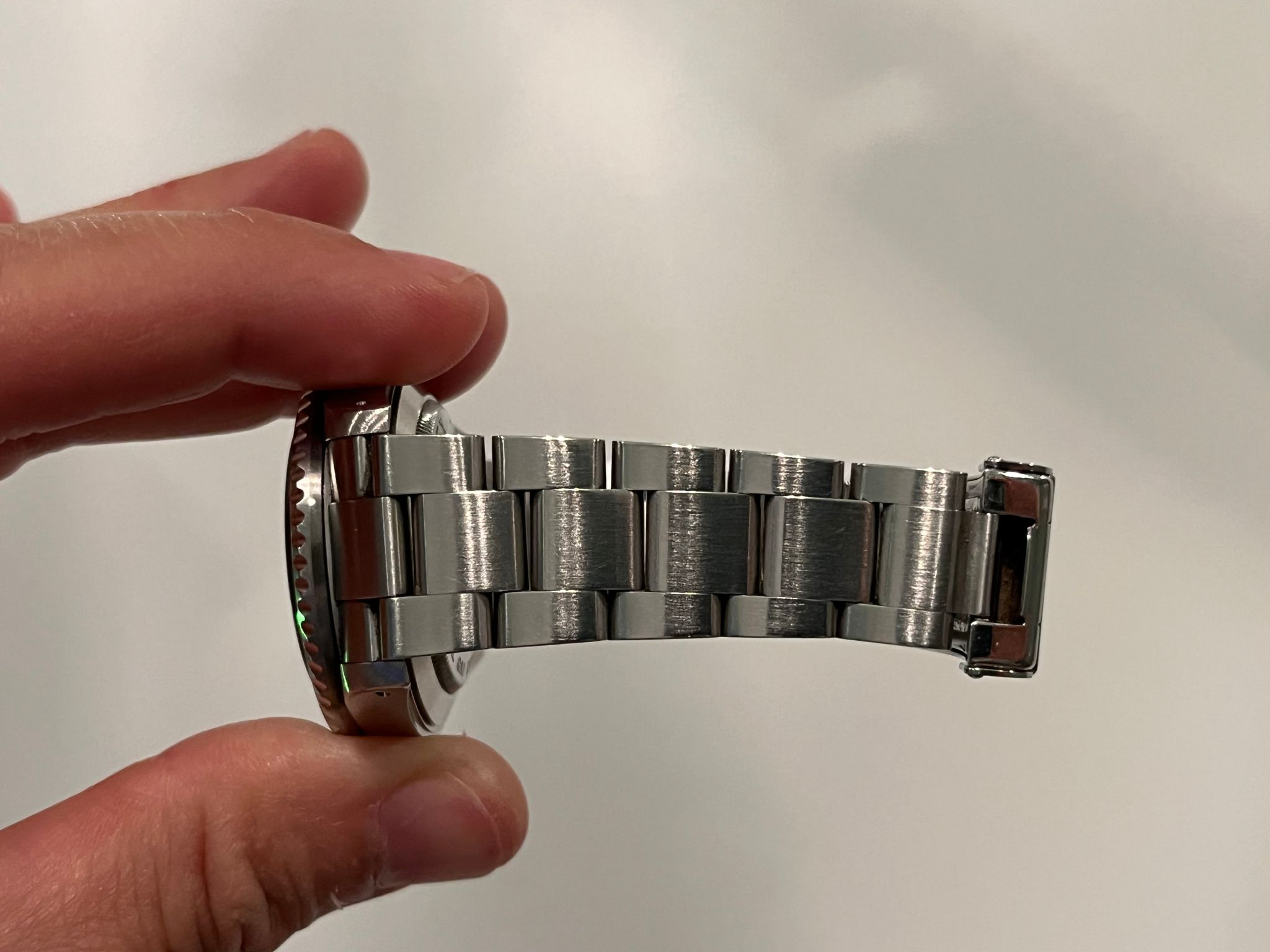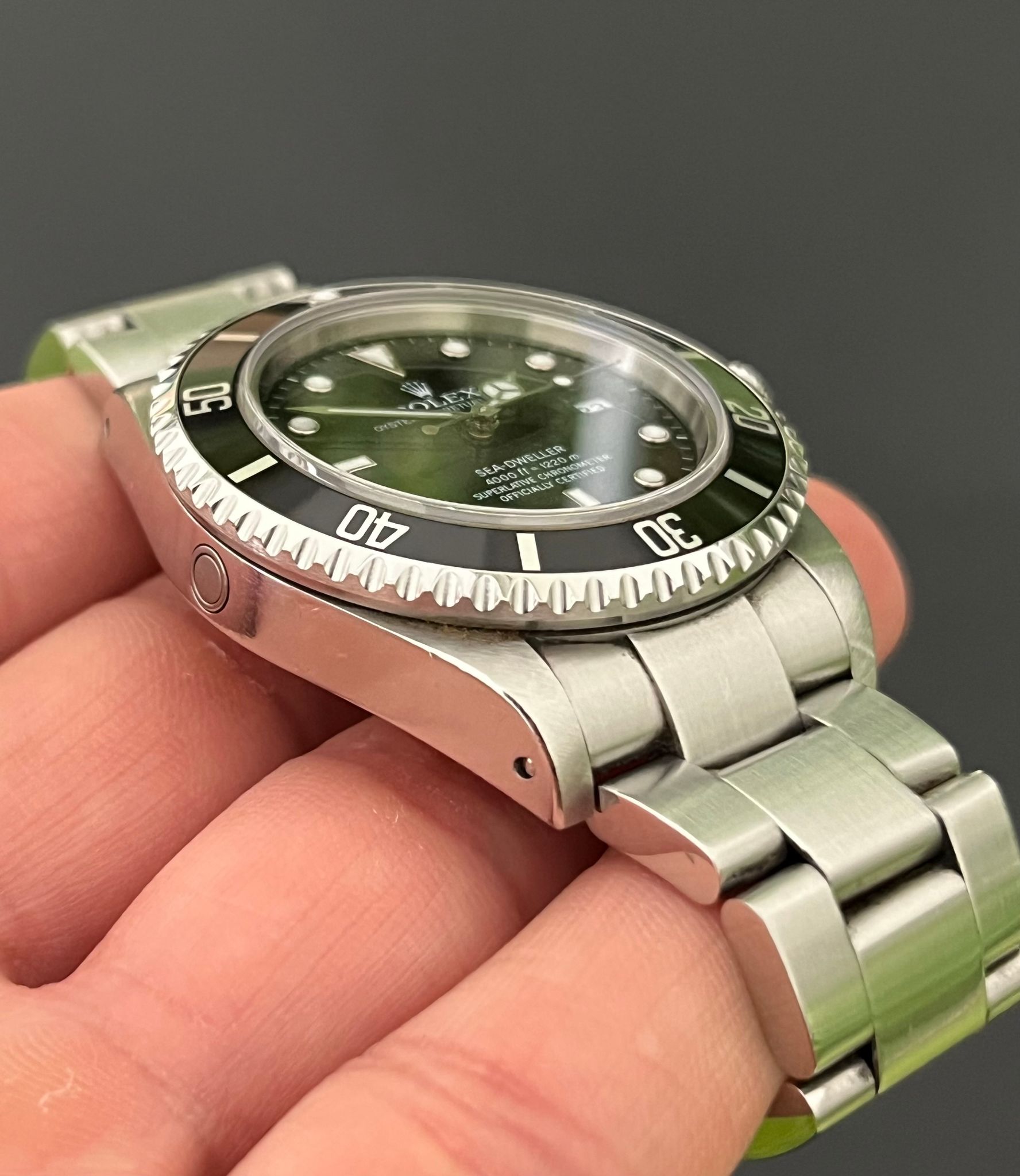 Today's example comes to us with an excellent preowned condition. The case is excellent showing sharp chamfers and appears unpolished. The Solid End Link Bracelet is fully linked and shows no stretch. The dial and insert are in excellent condition. This example comes with its original punched papers dated 8/00 and both hang tags.