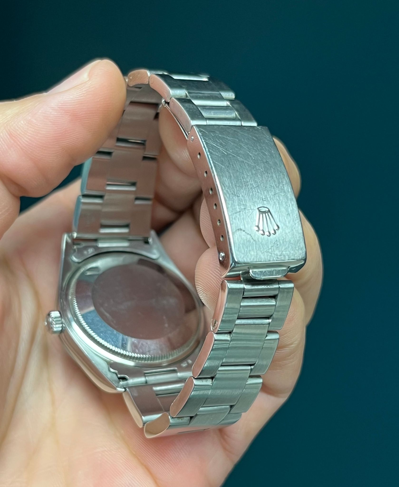 The Rolex Oyster Perpetual Air-King Reference 14000 with a BlueDial is a stunning example of Rolex's commitment to timeless elegance and superior craftsmanship. This exquisite timepiece features a 34mm stainless steel case, perfectly balanced for both comfort and style. The unique blue-colored dial adds a touch of sophistication, beautifully contrasted by the sleek, minimalist design and luminous hour markers. Powered by the reliable Rolex Caliber 3000 automatic movement, the Air-King 14000 guarantees precise timekeeping and robust performance. The smooth bezel and classic Oyster bracelet enhance its refined aesthetic, making it suitable for any occasion. This particular model, with its rare and captivating blue dial, stands out as a distinctive and highly sought-after addition to any watch collection, embodying the perfect blend of tradition and modernity.